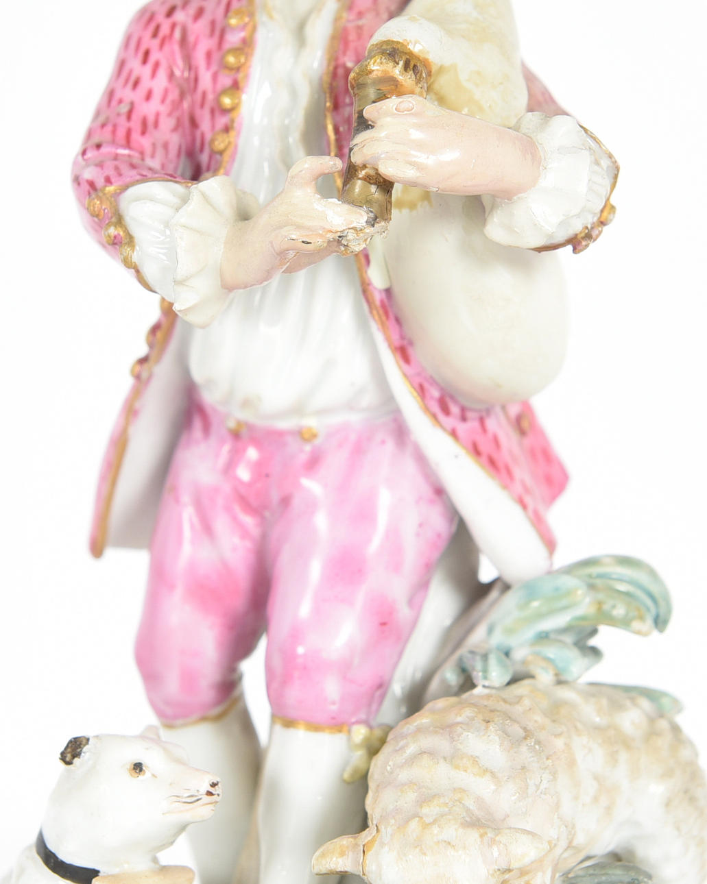 Skader med reparationer og retoucheringer samt senere modellerede dele, herunder den øverste del af sækkepiben. Også hat og hænder med kraftig retouchering. Hund mangler et øre. Der er flere skader end anført.