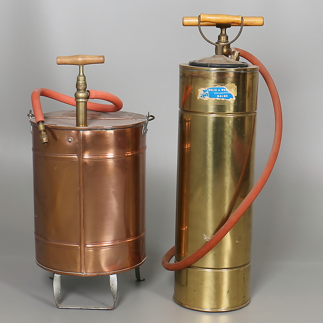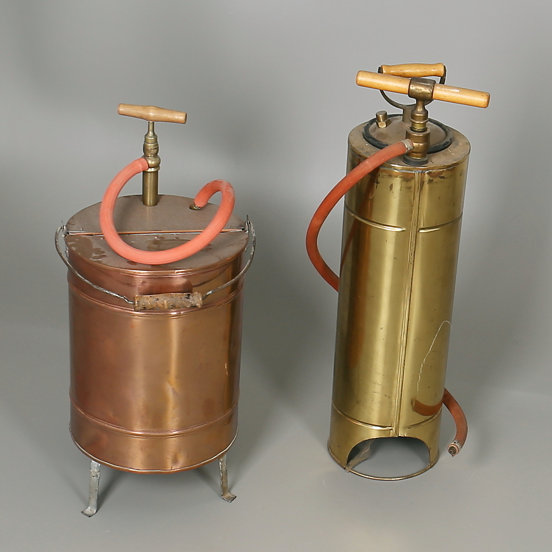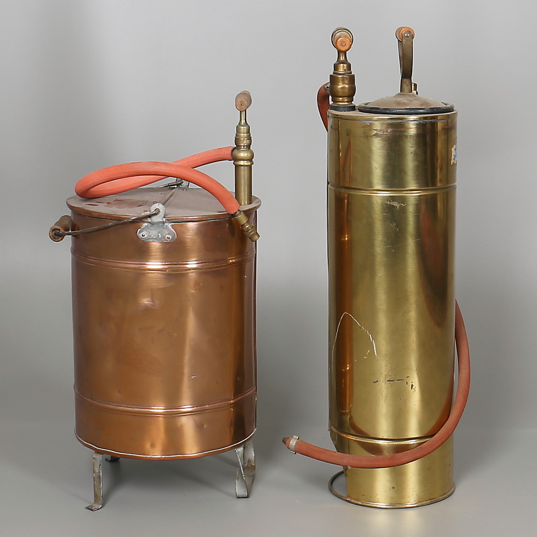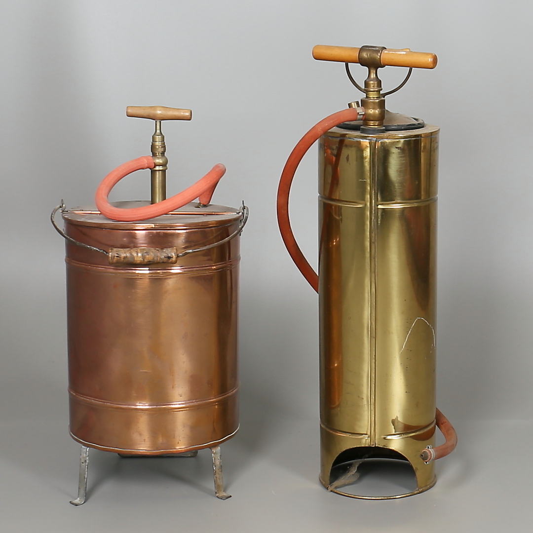 182159. BRANDSPRØJTER i messing og kobber. 2 stk. 20. århundrede.