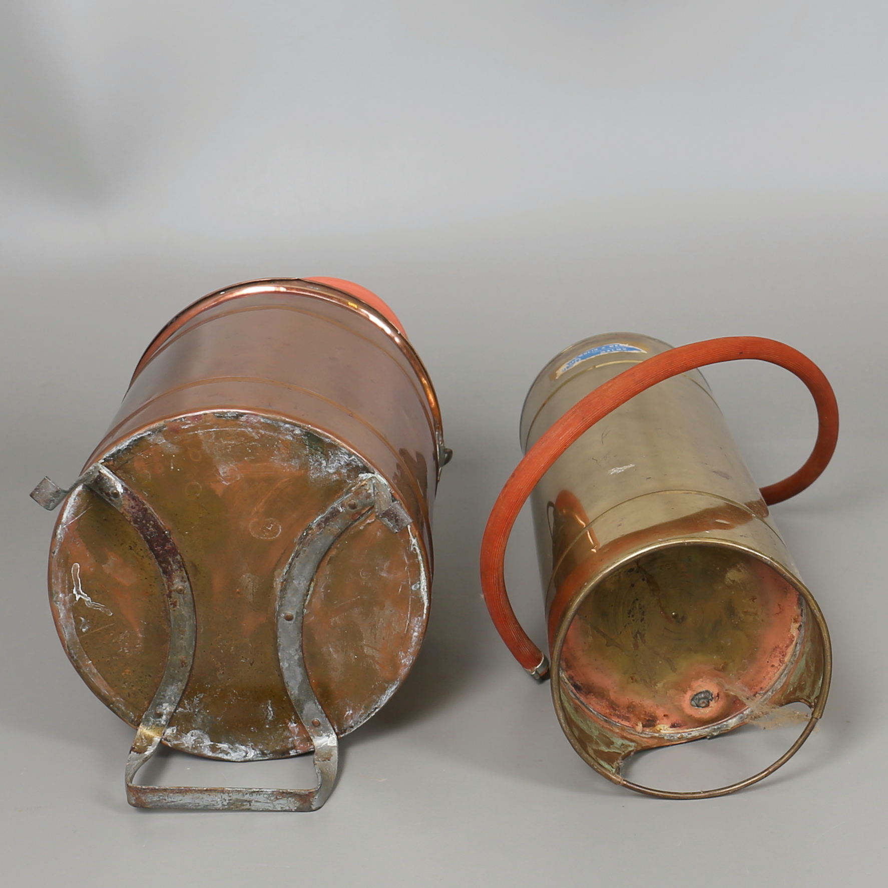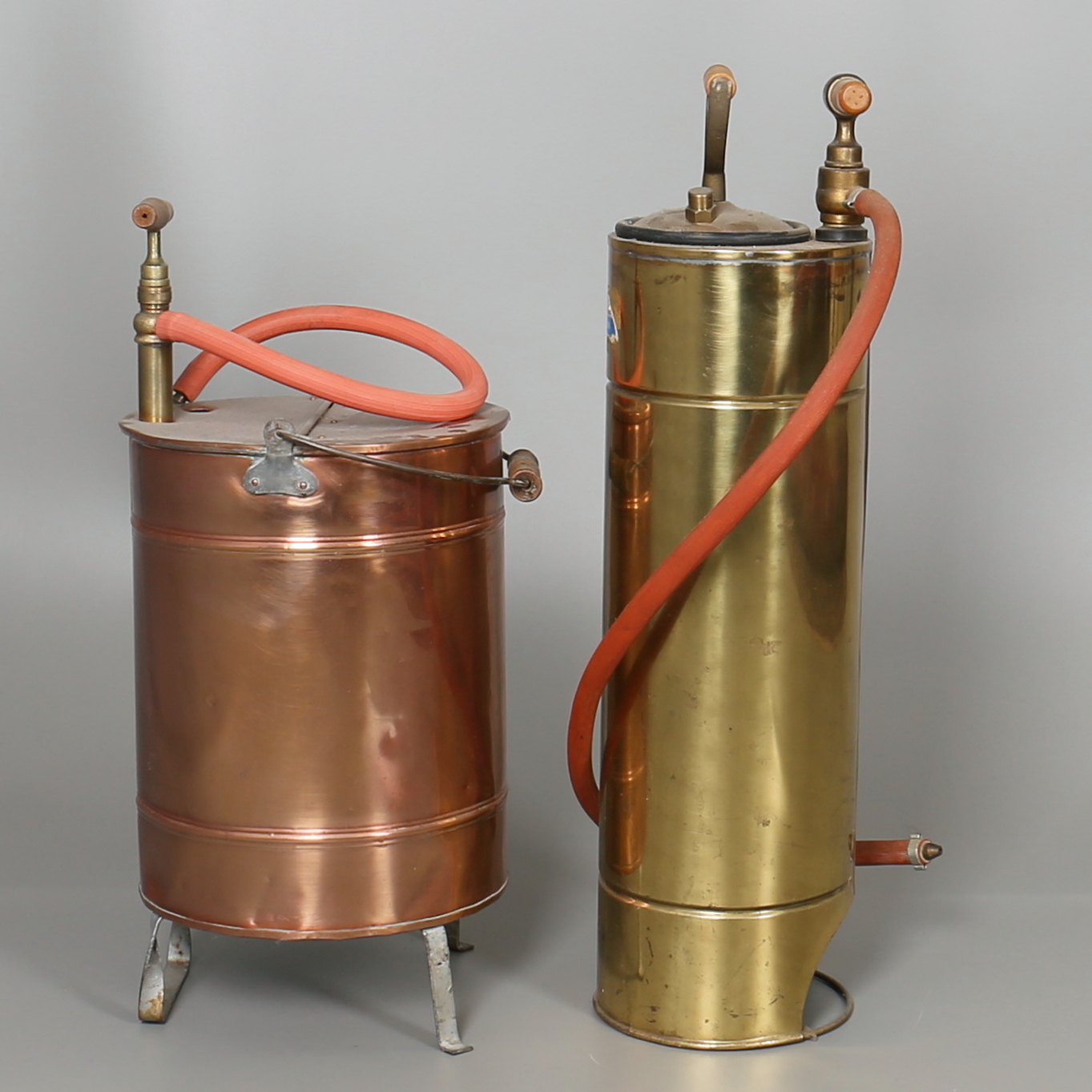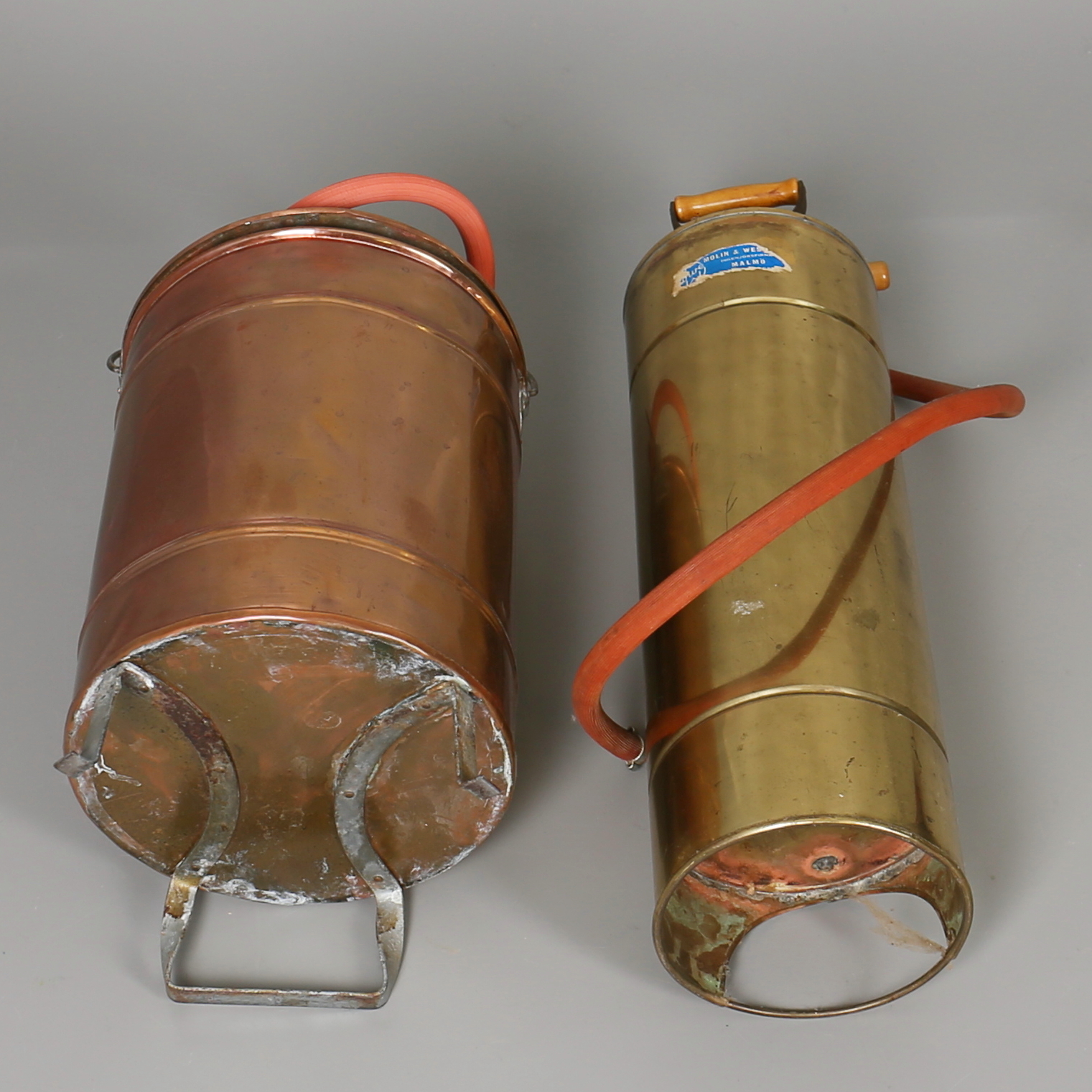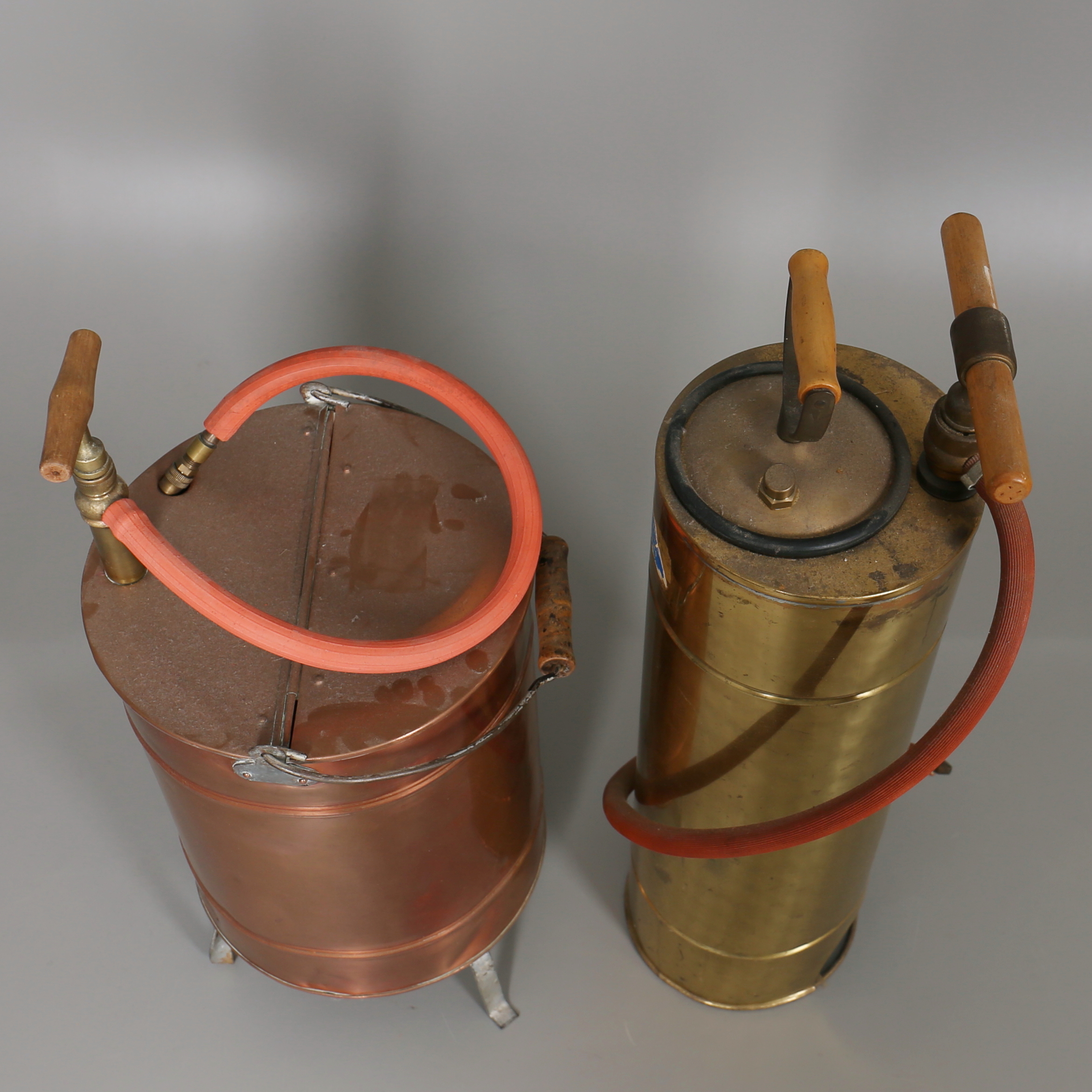 182159. BRANDSPRØJTER i messing og kobber. 2 stk. 20. århundrede.