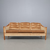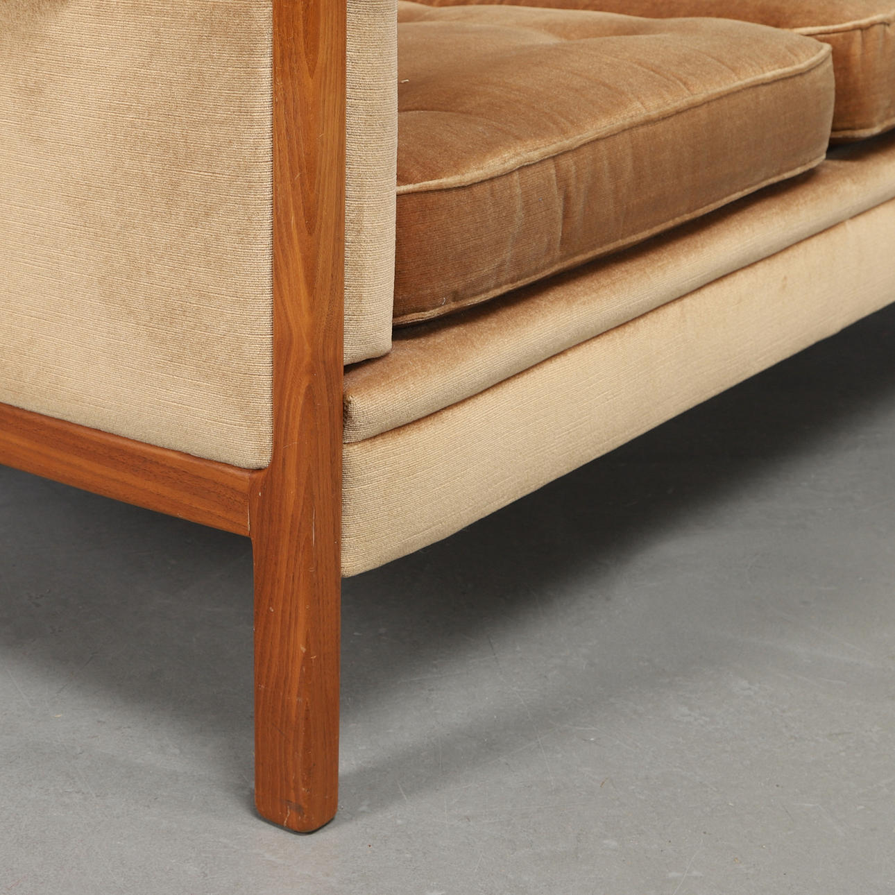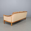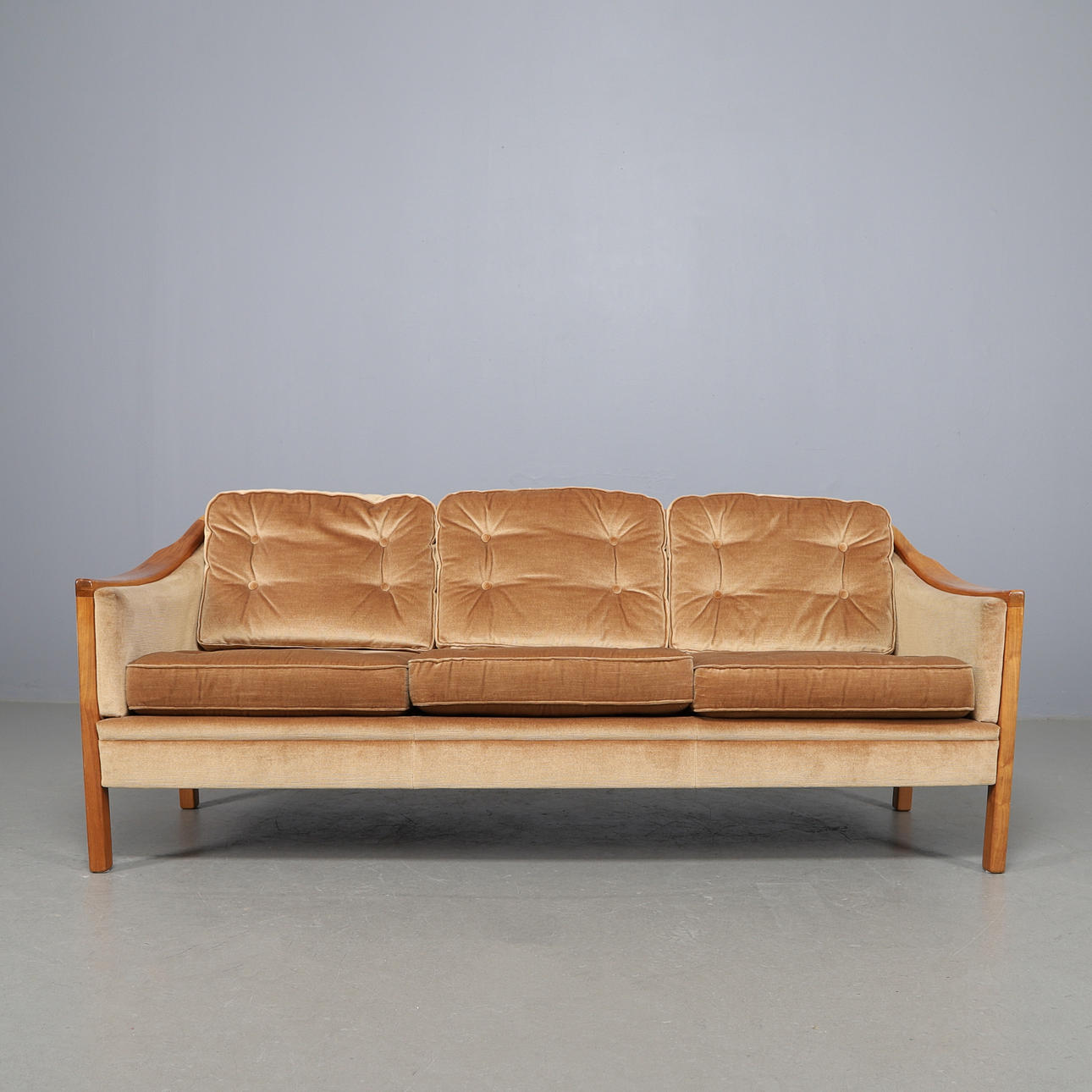 Stel i eg, løse fjer, polstring i løvegul plys. Længde 185 cm, højde 72 cm, dybde 80 cm, sædehøjde 40 cm.