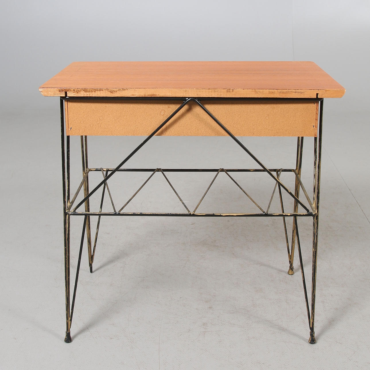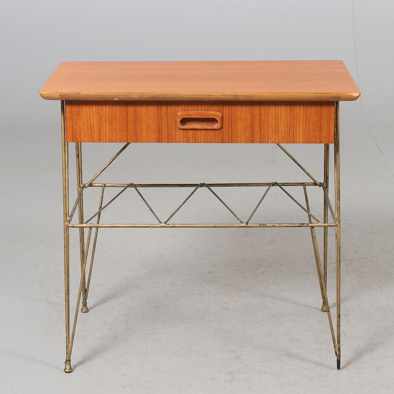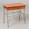 Sengebord med skuffe og magasinstativ. Længde 52, bredde 31, højde 49 cm.