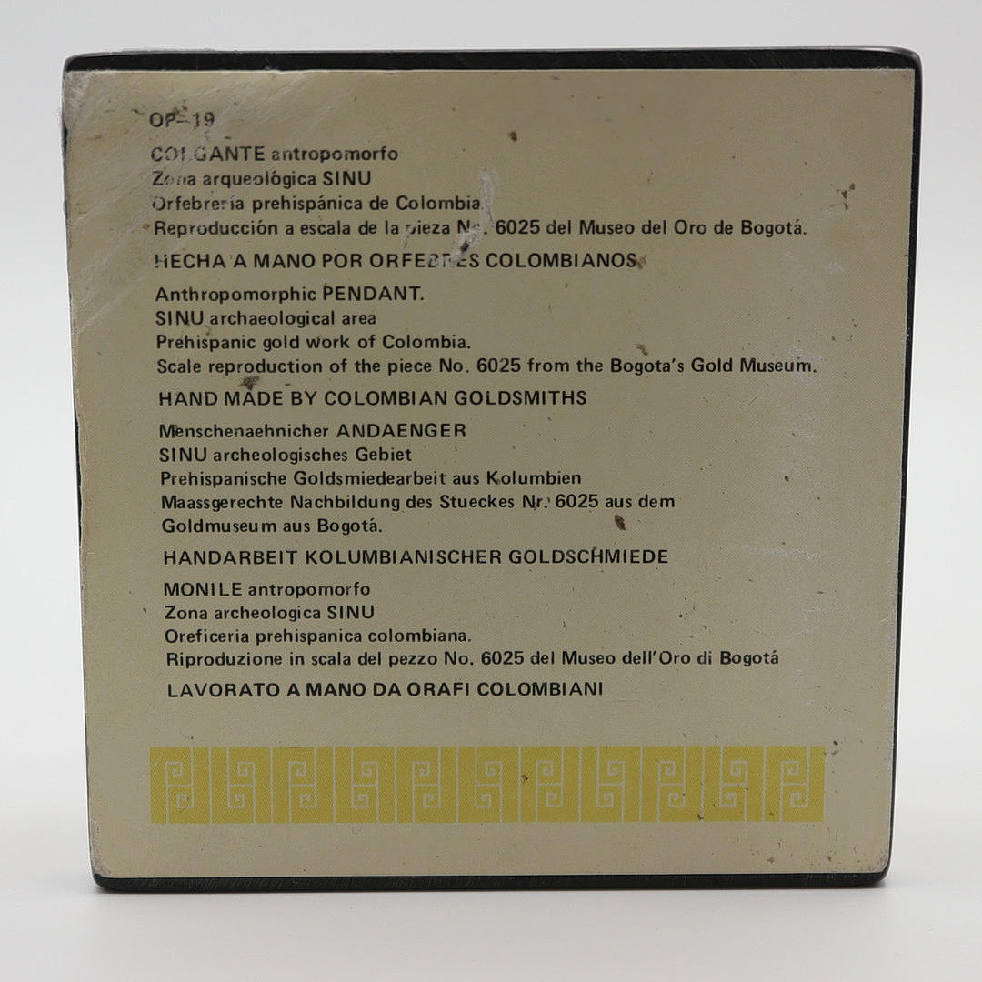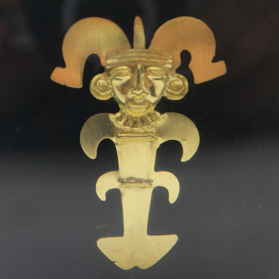 Antropomorfisk vedhæng, SUNO arkæologiske område, præhispansk guldværk i Colombia, skala-reproduktion af stykket nr. 6025 fra Bogotas guldmuseum.