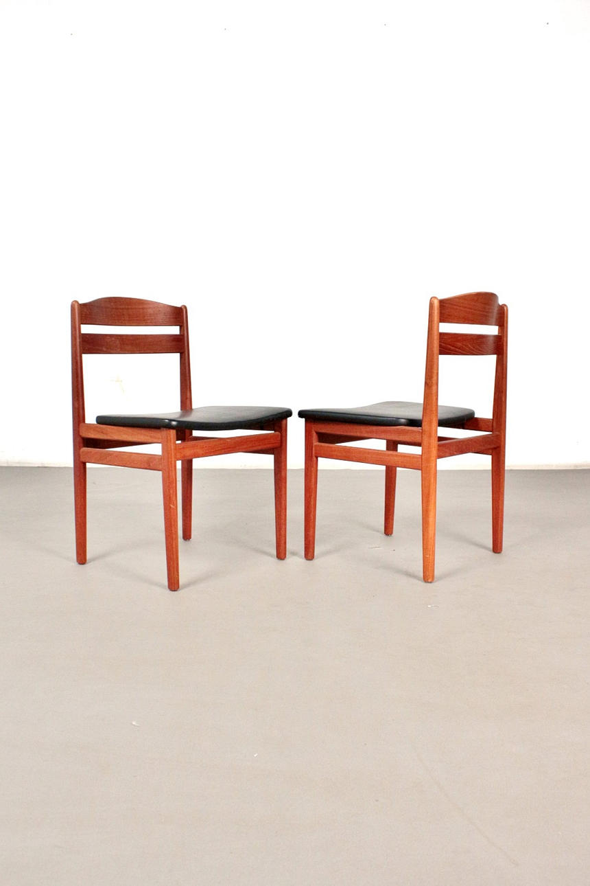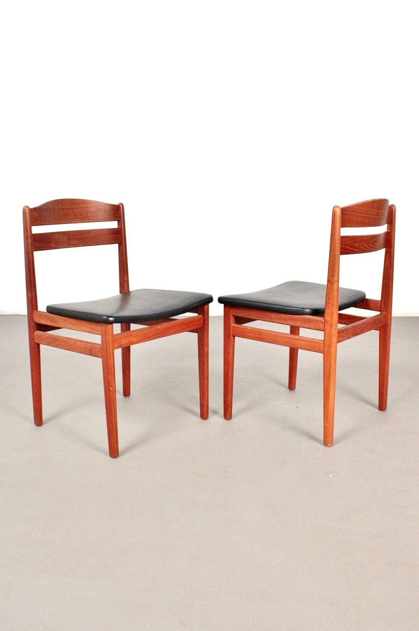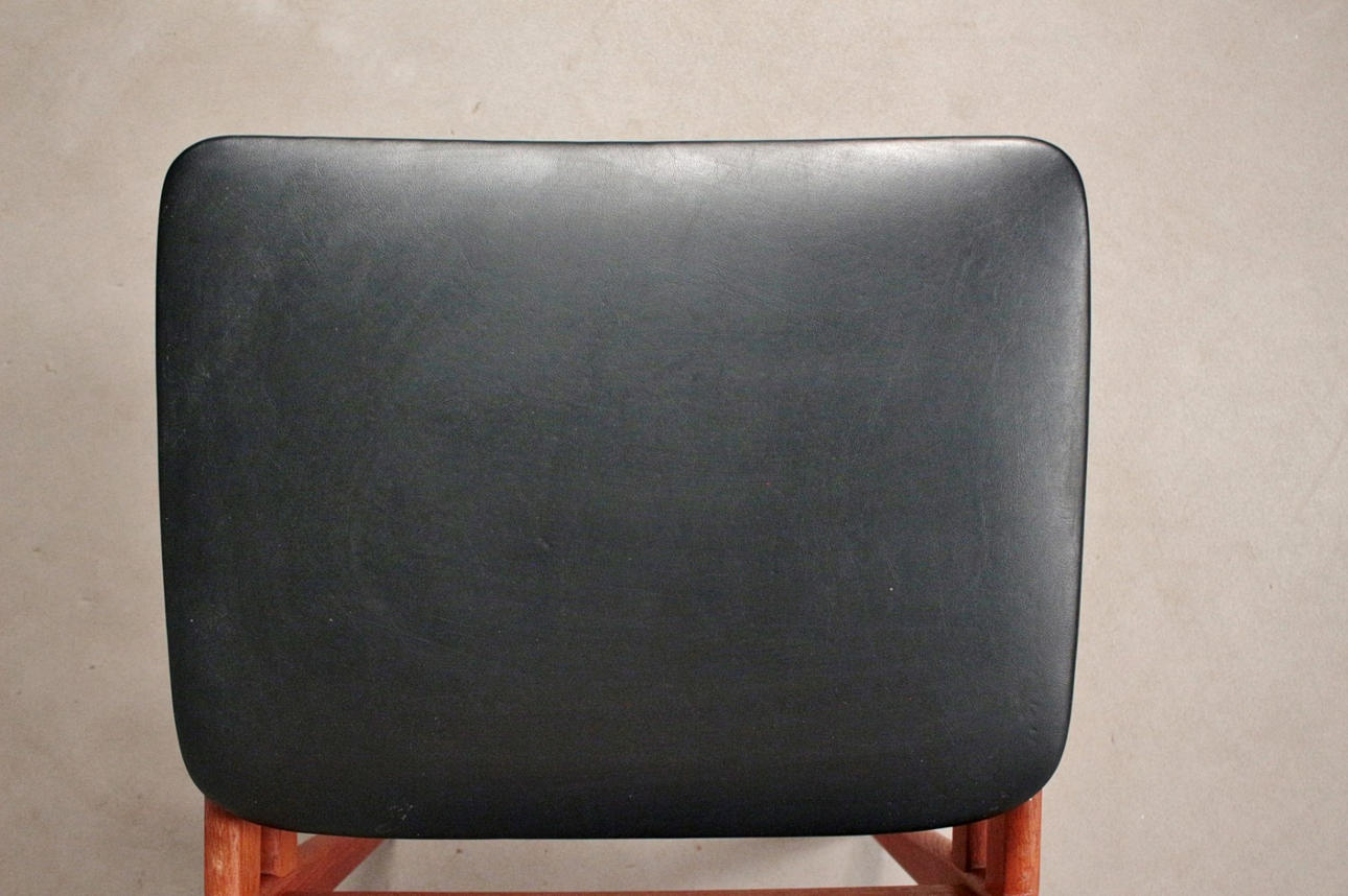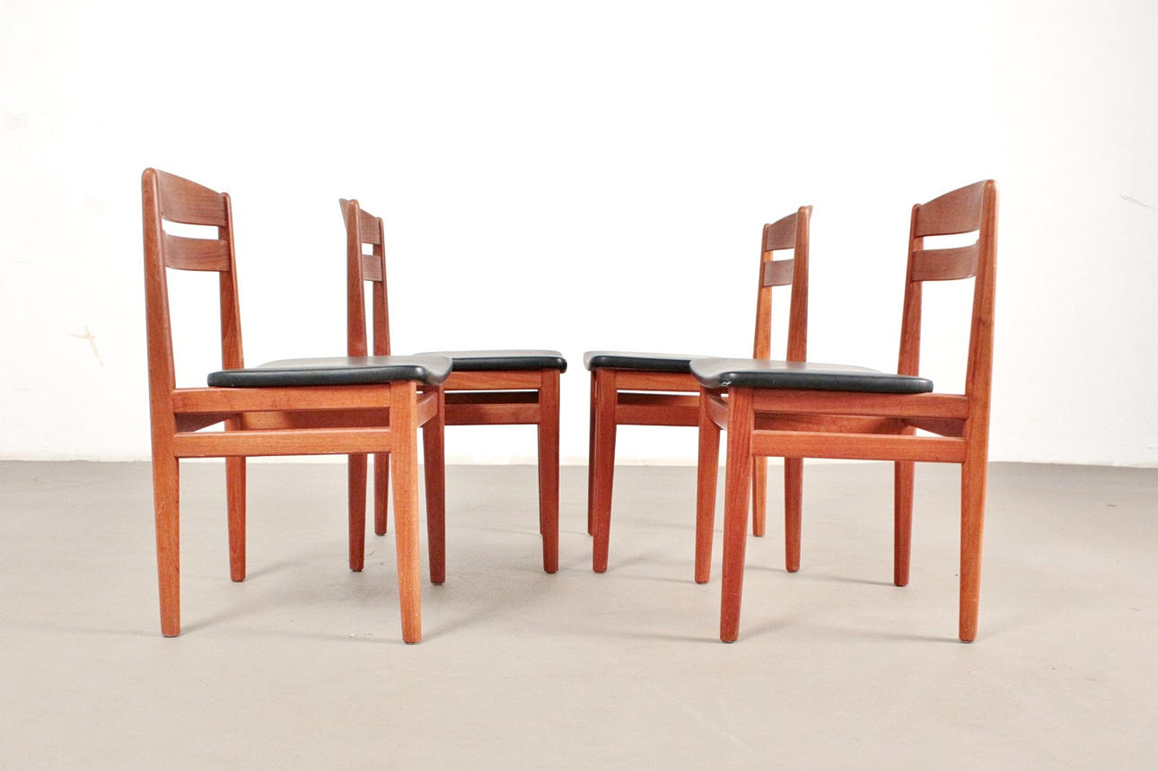 Sæt stole model nr. 82. Design af BS Møbler, Danmark. Mærket på undersiden med stempel. Konstruktion af massiv teaktræ, krydsfinersæde med sort vinylbetræk.