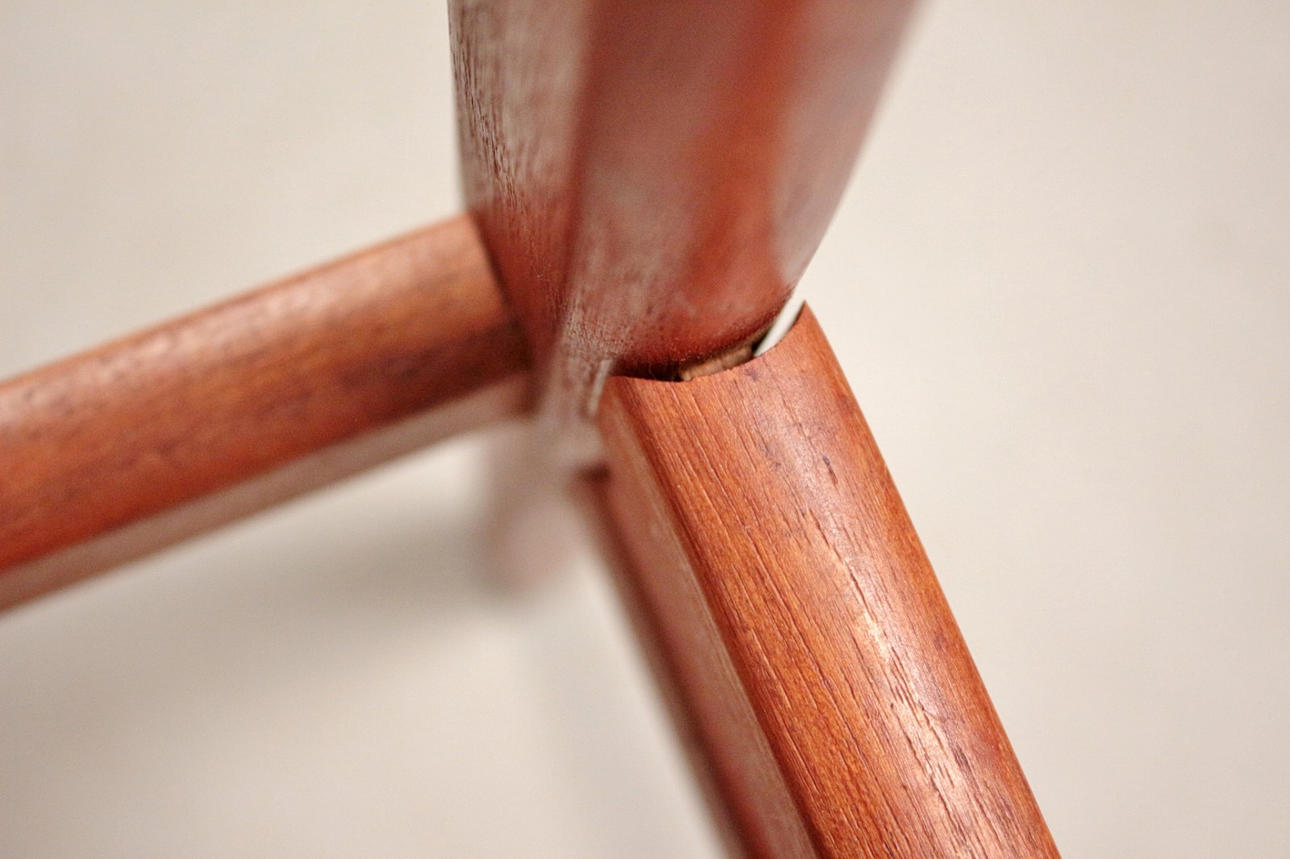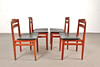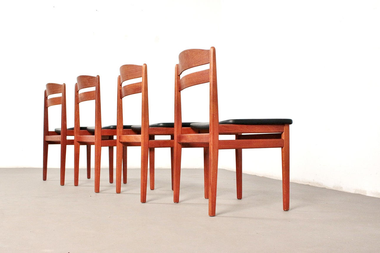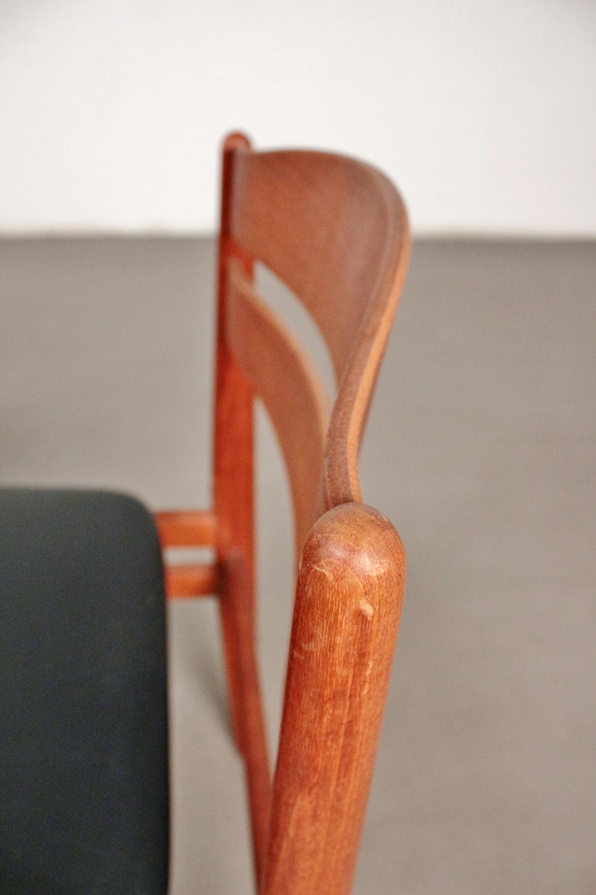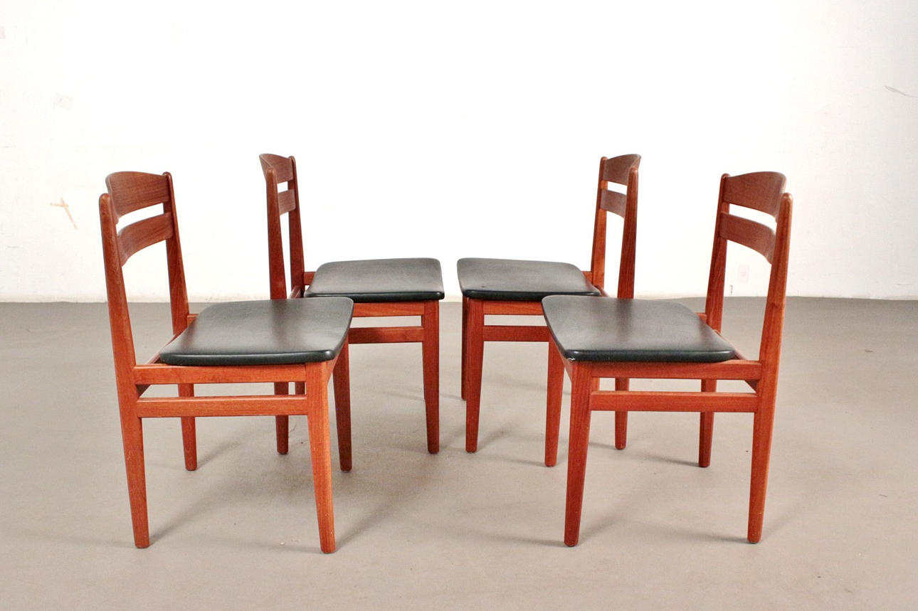 Sæt stole model nr. 82. Design af BS Møbler, Danmark. Mærket på undersiden med stempel. Konstruktion af massiv teaktræ, krydsfinersæde med sort vinylbetræk.