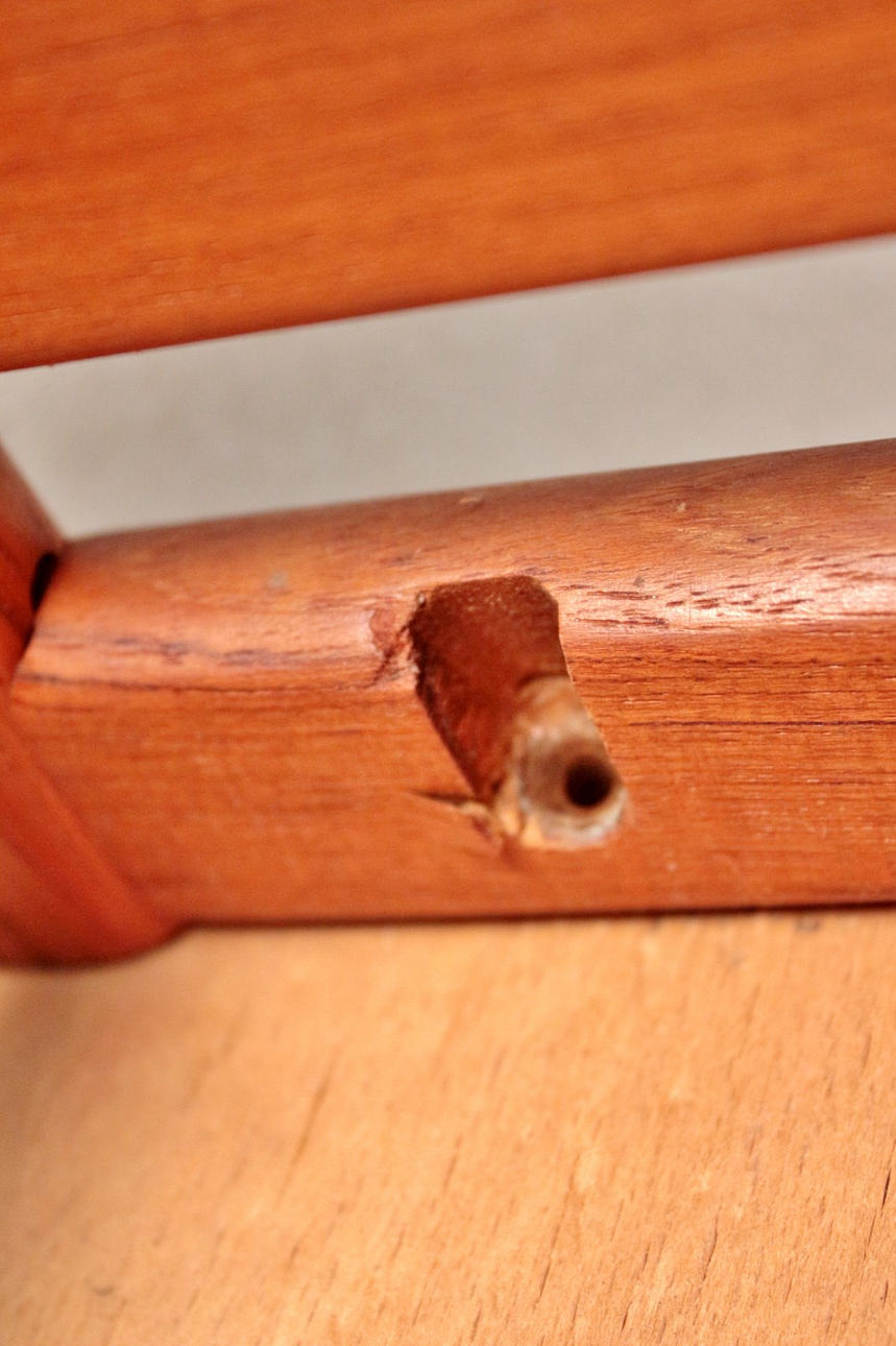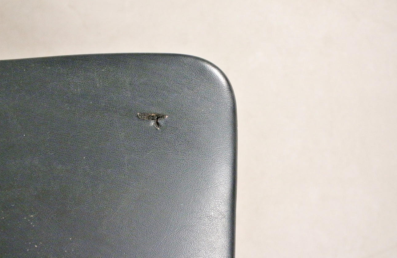 Fremstår med lette aldersmæssige brugsspor, nogle fastgørelsesskruer mangler under sædet, træoverflader med buler og ridser, et sæde med en lille revne/mindre skade, den ene træforbindelse på den ene stol er noget løs. (4).