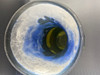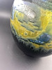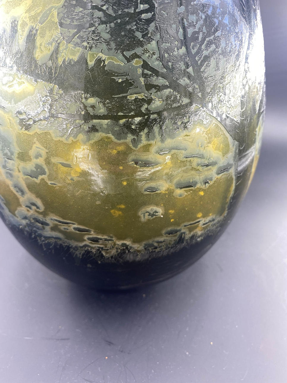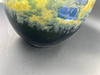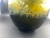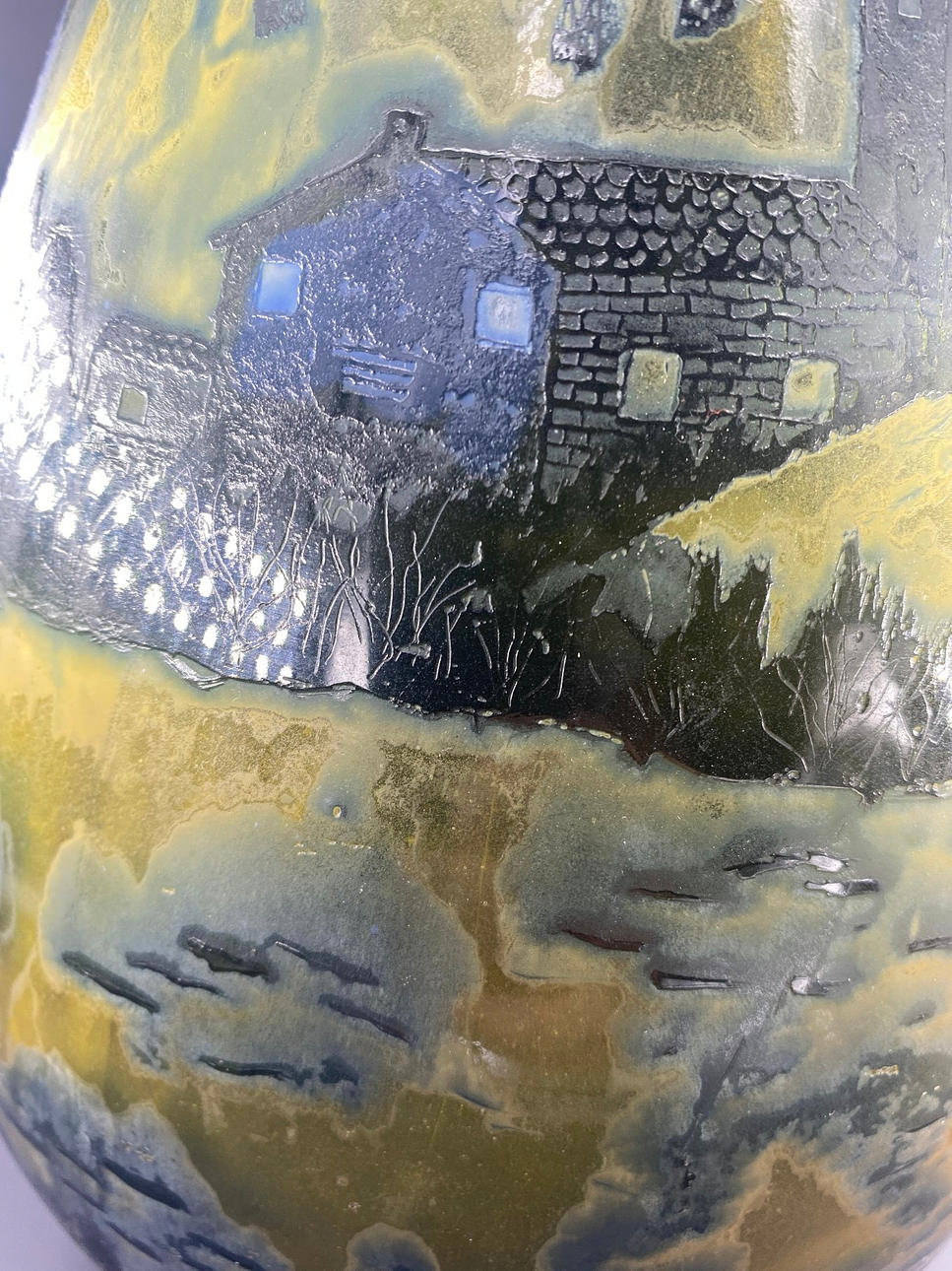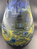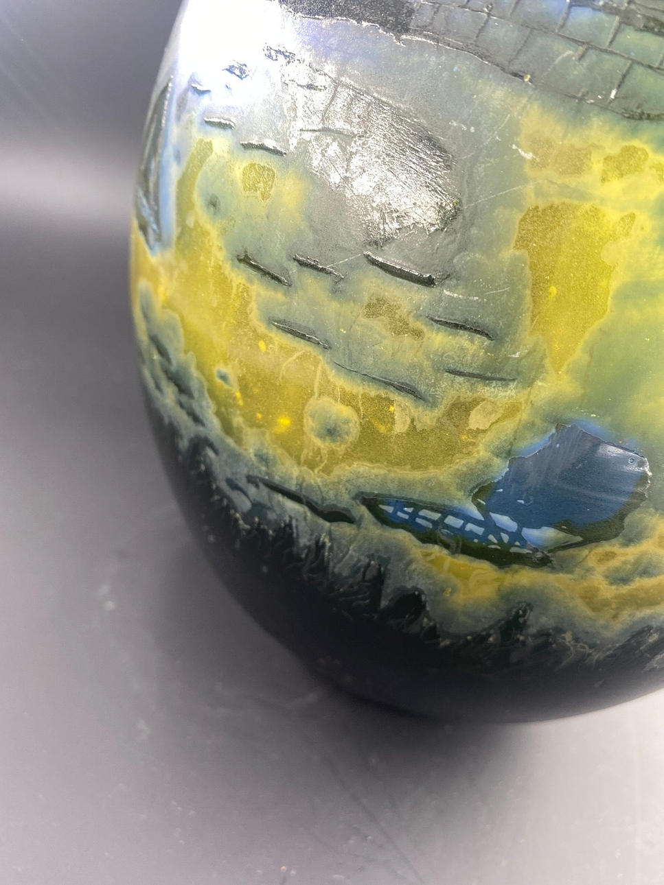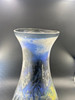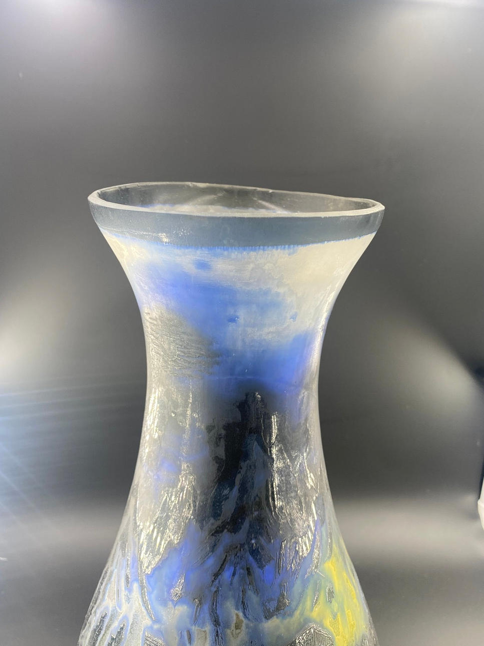Émile Gallé vase, glas, Art Nouveau. Vase af farveløst glas med blå/gul overlejring og ætset landskabsdekoration hele vejen rundt, affladet kugleformet mave med tragthals, signeret øverst på kanten, H.42 cm, D.12,5 cm.