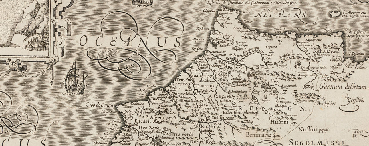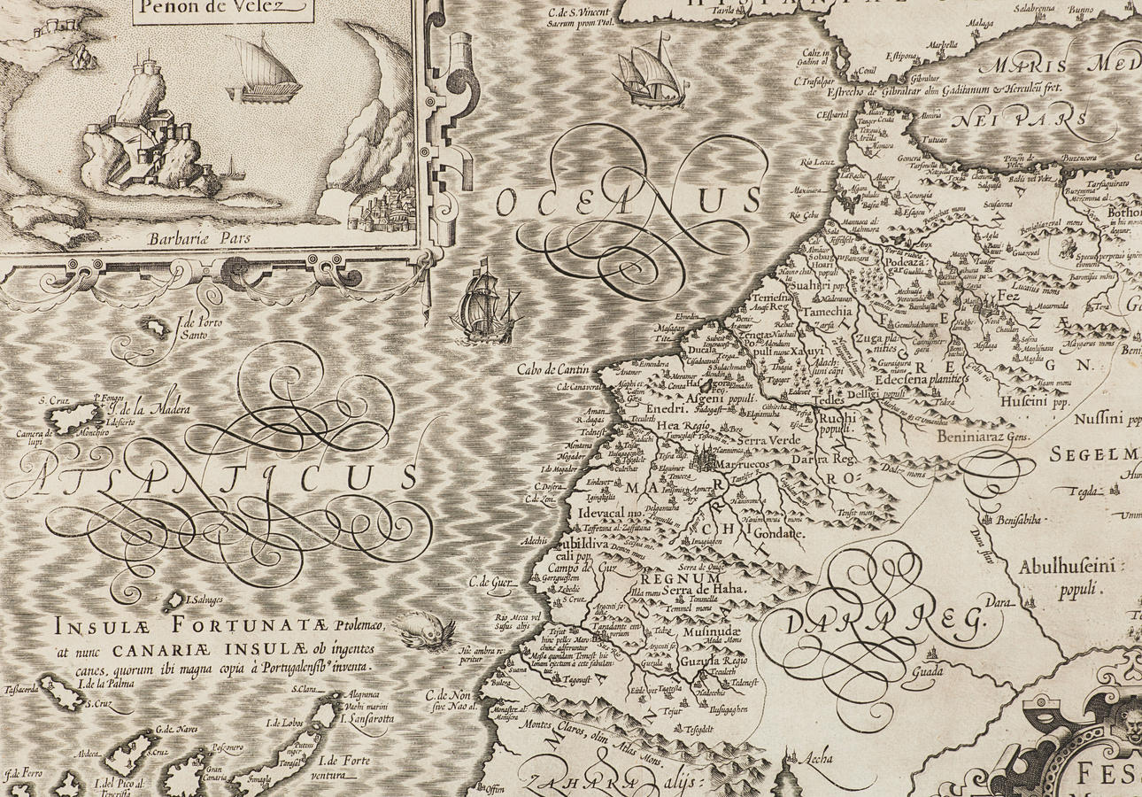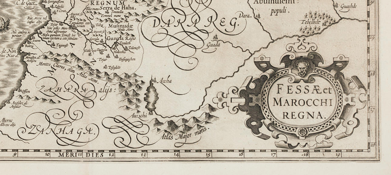Dette er et af de mest dekorative kort over de vigtige kongeriger Fez og Marokko. En stor indsats med titlen Penon de Velez viser det spanske fort ud for Barbarys kyst. Kortet omfatter De Kanariske Øer og Madeira.