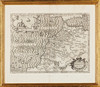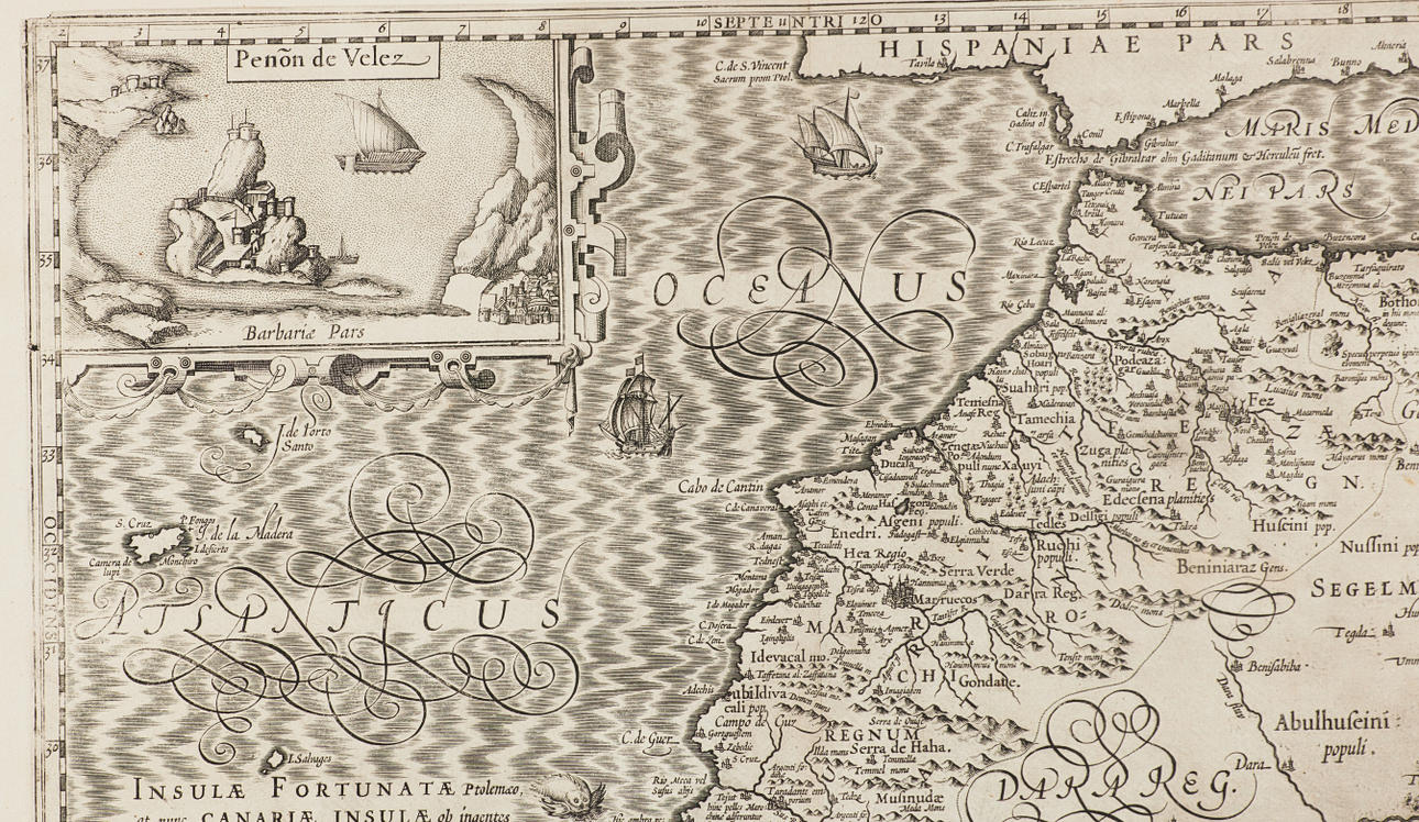Indgraveret kort med udsmykket titelkartouche og indsat kort over Penon de Velez, sejlskibe og havdyr. C. 355x480 mm. Indrammet.