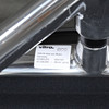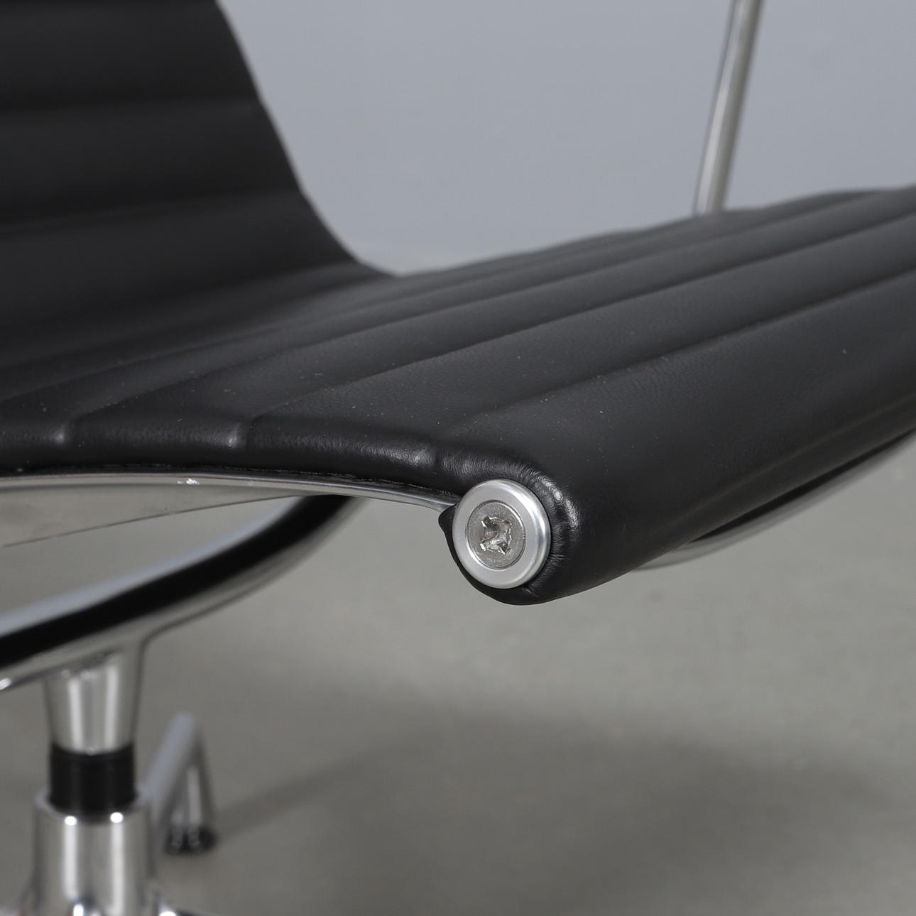 Modellen er designet i 1958. Drejeligt stel i aluminium på firedelt fod. Polstring i sort læder.