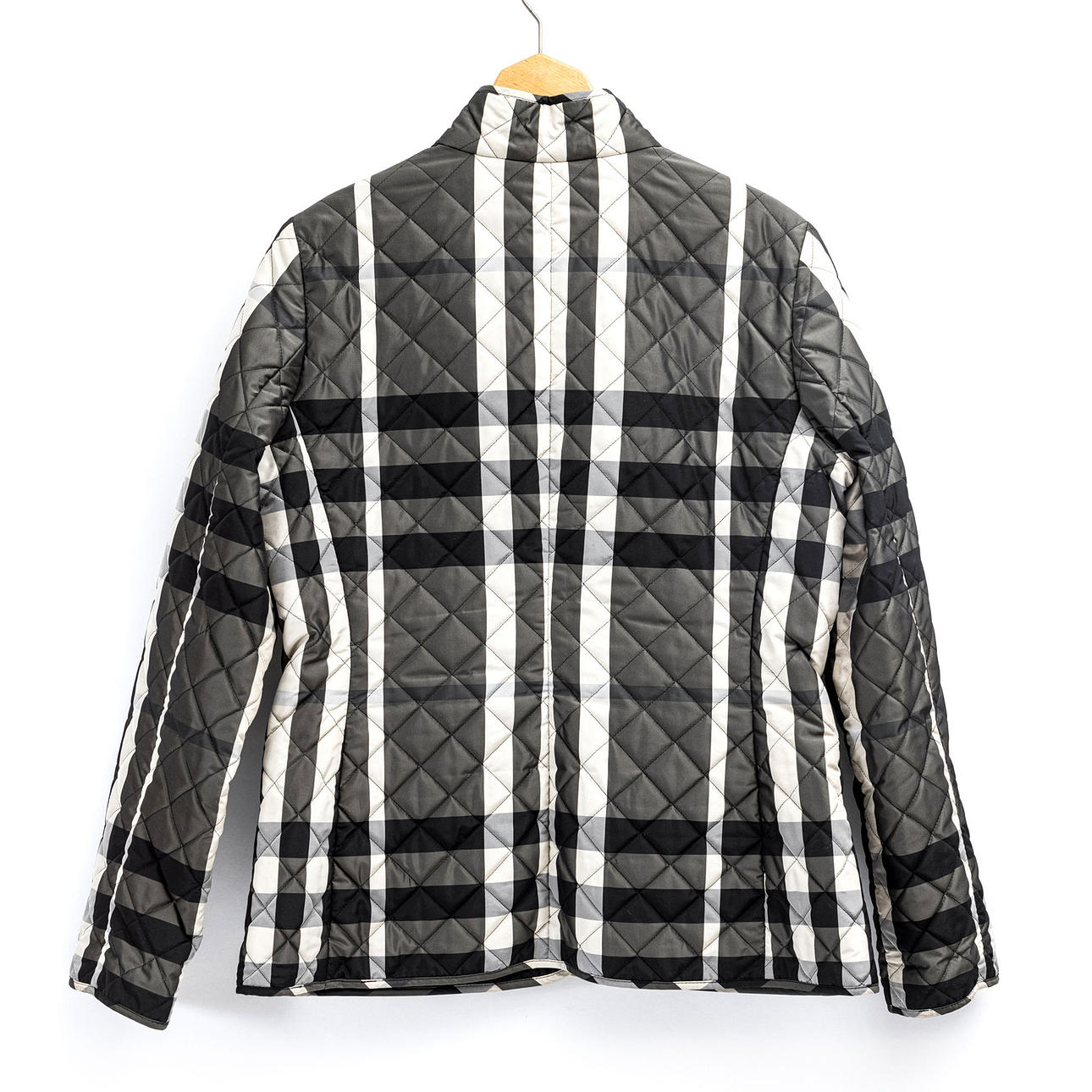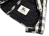Matsnøret og let blankt ternet stof. Lille opretstående krave, to lommer udstyret med lommeflapper og sorte trykknapper præget med "BURBERRY". Sort forstof med "BURBERRY" indvævet. Mærket "BURBERRY LONDON". Størrelse efter mærke M.