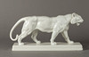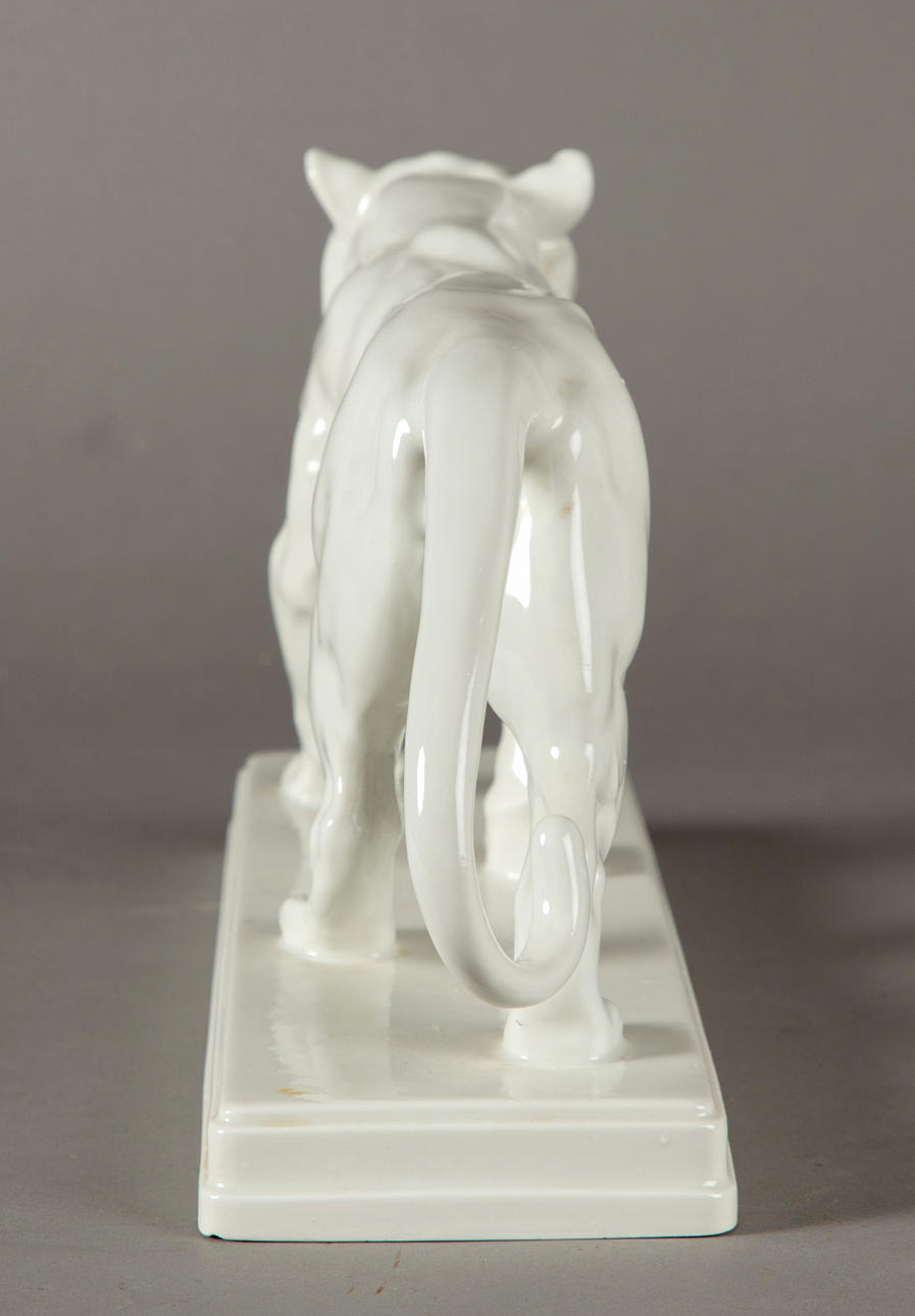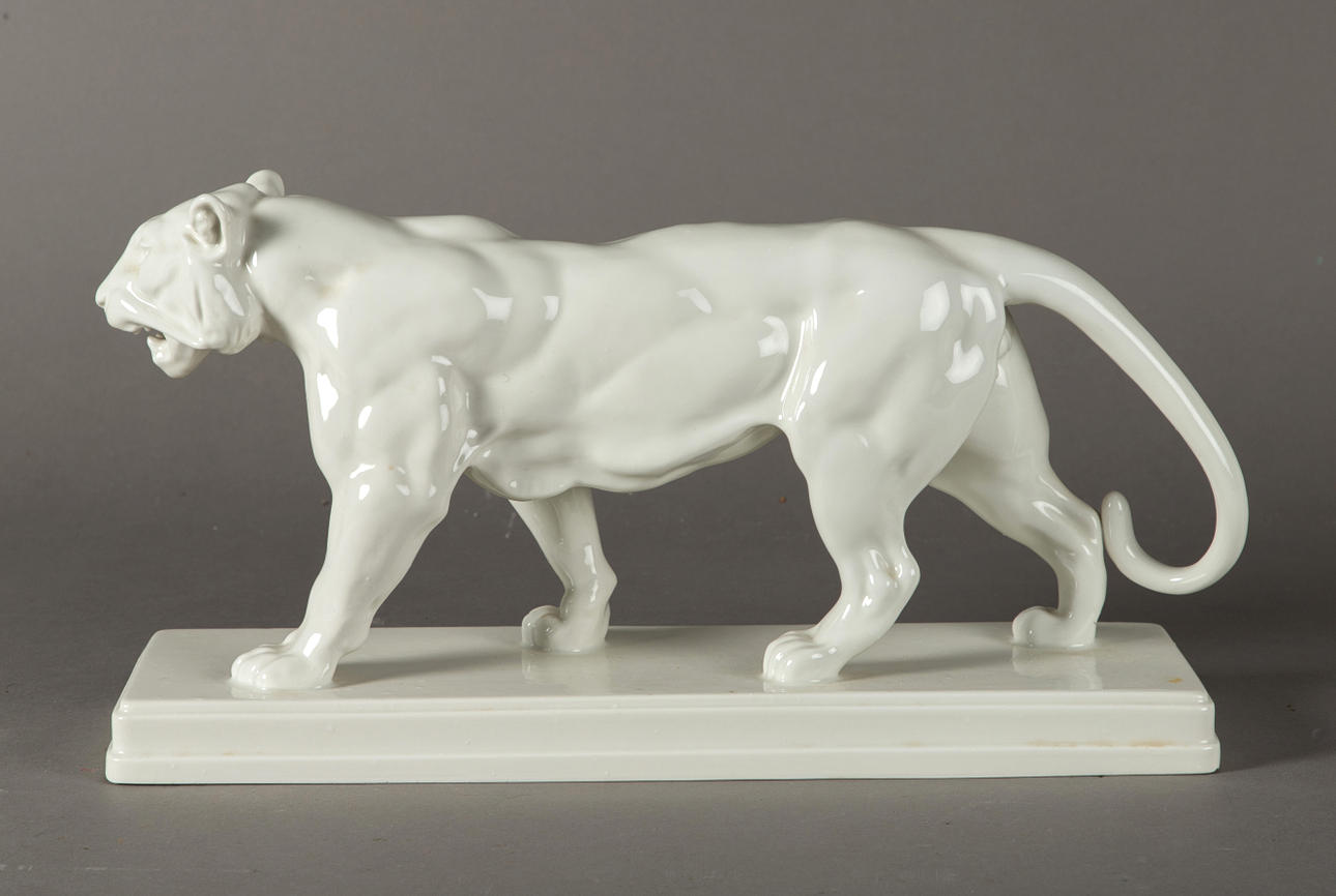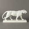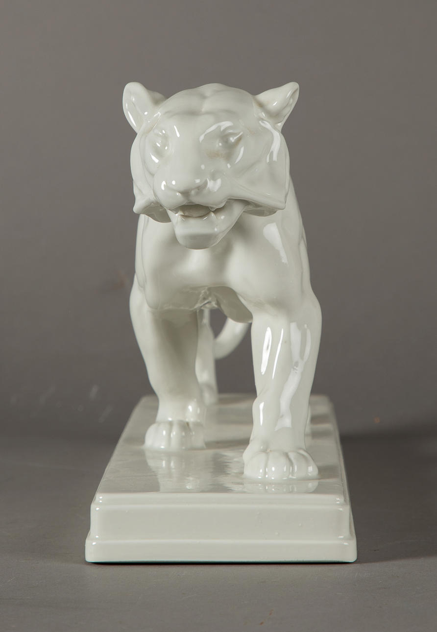 hvidt porcelæn. På en rektangulær sokkel, den tredimensionelle figur baseret på et design af Antoine-Louis Barye (1796 - 1875) - fransk billedhugger, fra 1836, med titlen "Striding Tiger". HxBxD: 18,5 x 34,5 x 10 cm. Blåt sceptermærke.