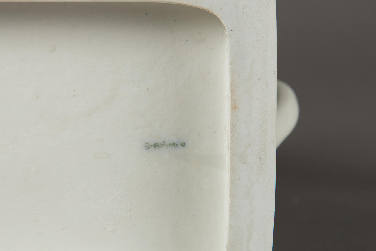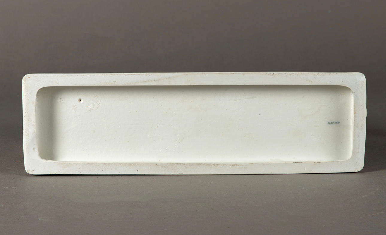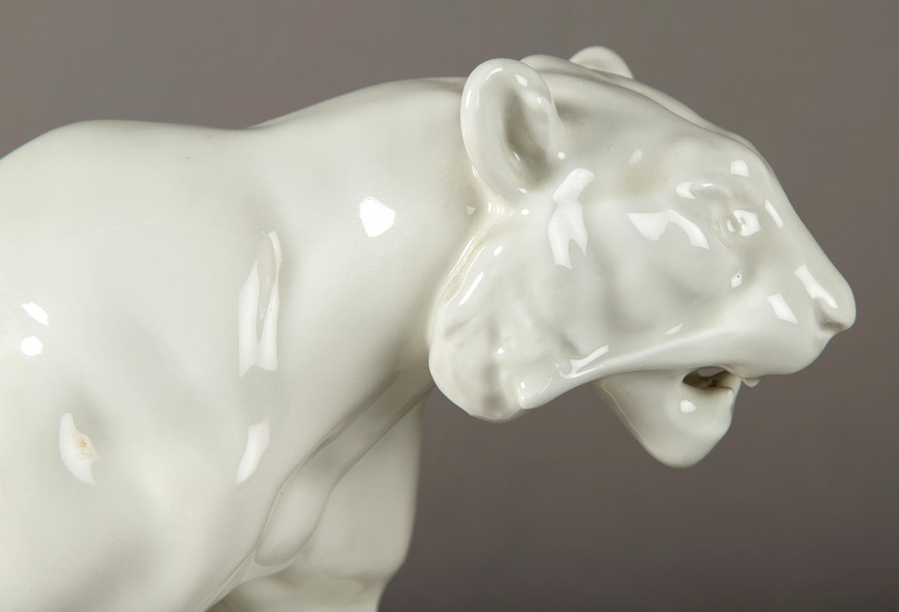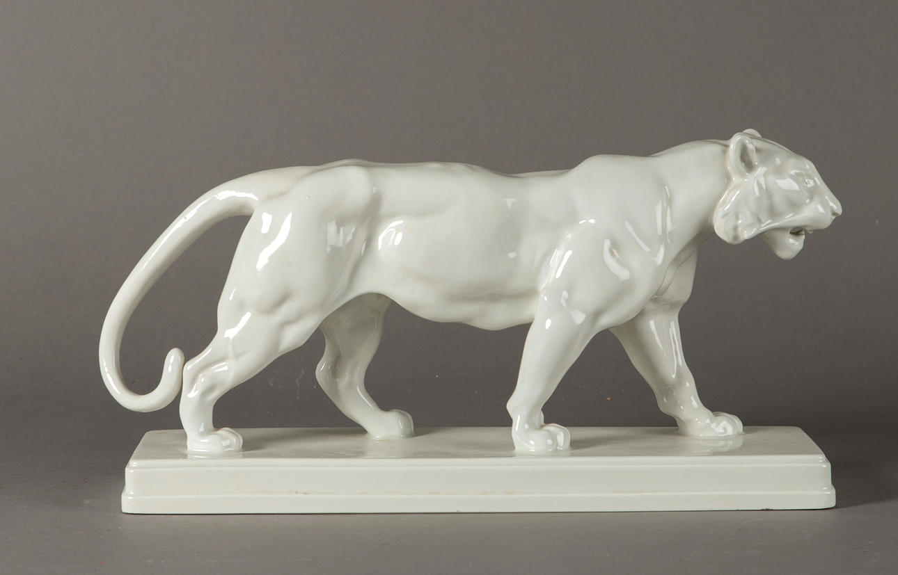 hvidt porcelæn. På en rektangulær sokkel, den tredimensionelle figur baseret på et design af Antoine-Louis Barye (1796 - 1875) - fransk billedhugger, fra 1836, med titlen "Striding Tiger". HxBxD: 18,5 x 34,5 x 10 cm. Blåt sceptermærke.