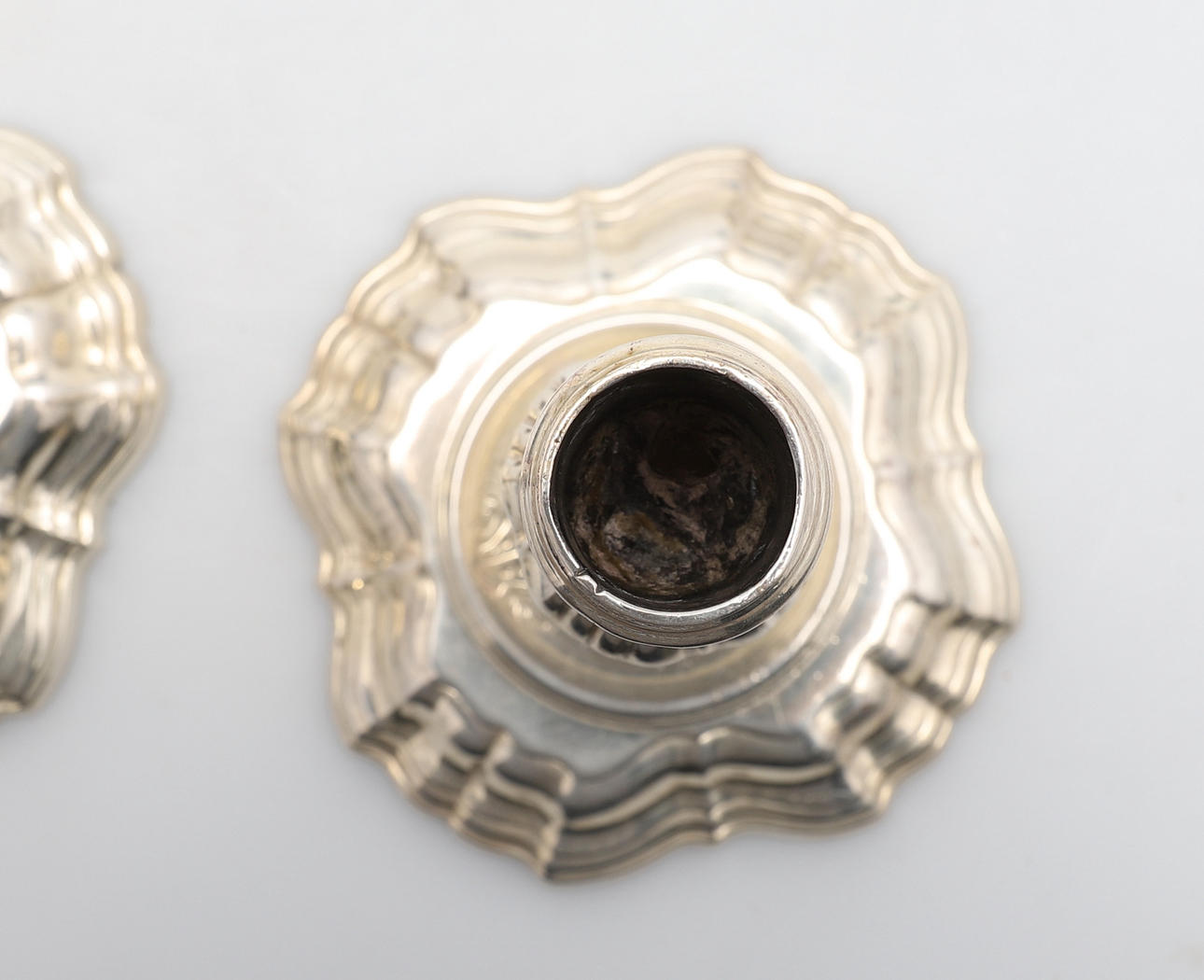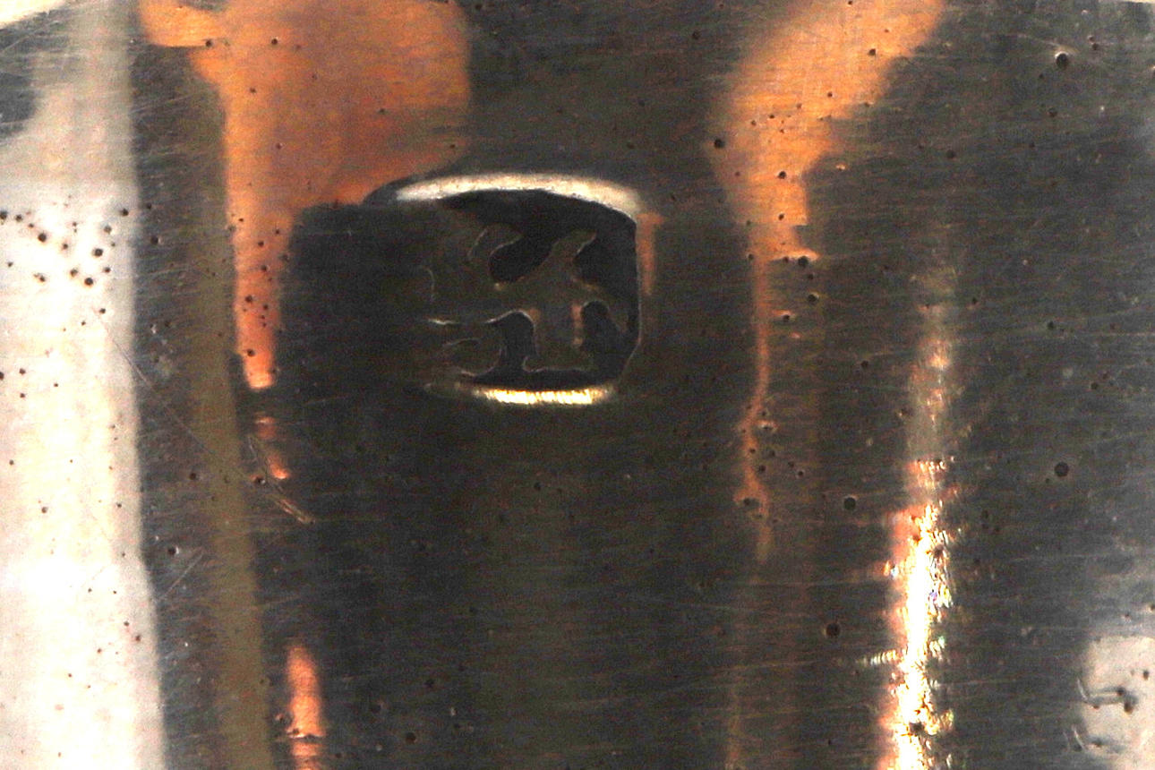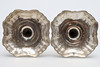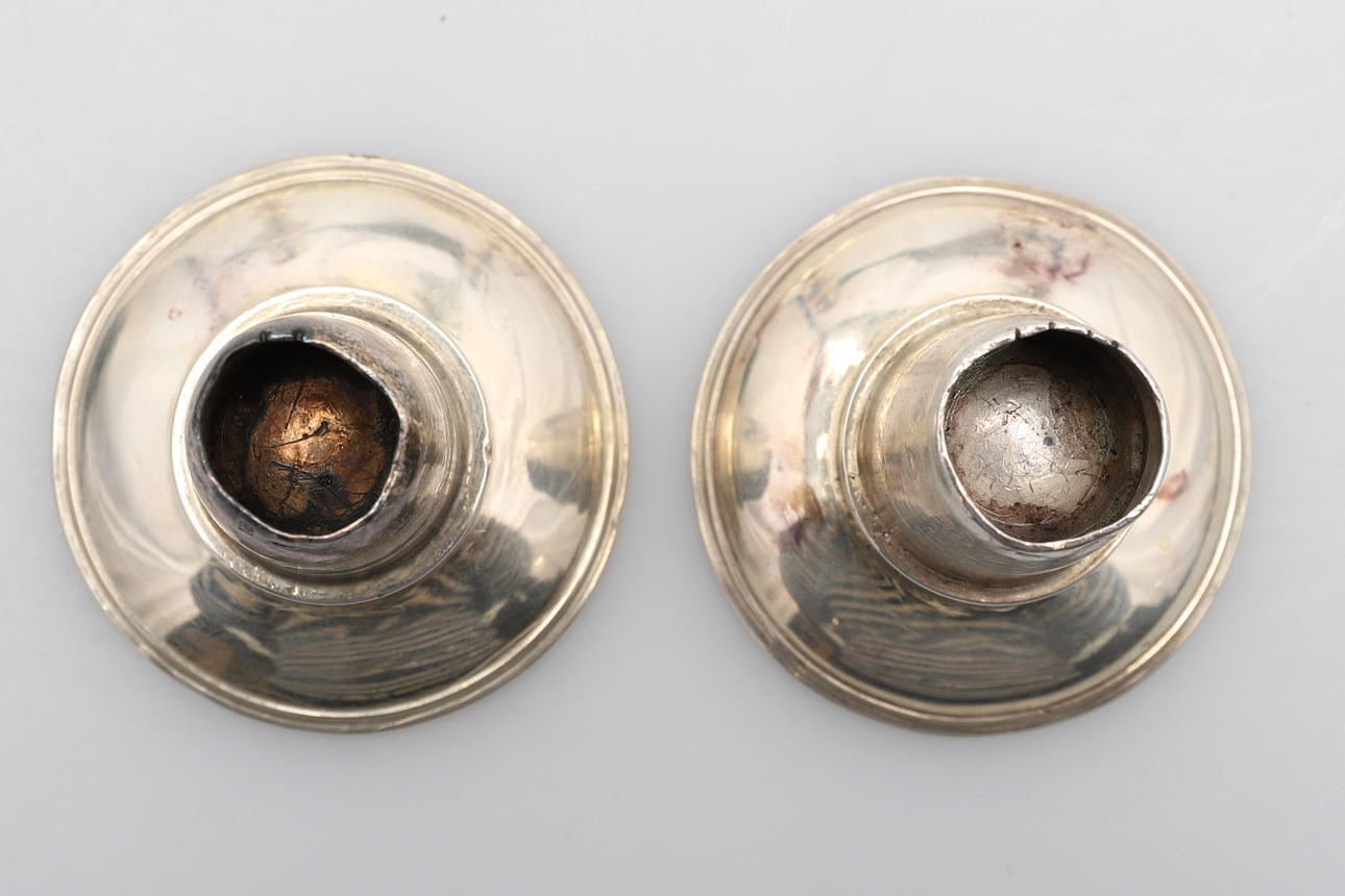 almen poleringsslitage svarende til alder og brug, dyserne med små kantmærker og skår, let anløbning, den ene lampet med kantbule, den anden med et par dybere ridser.