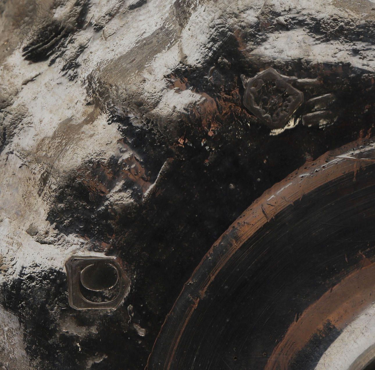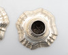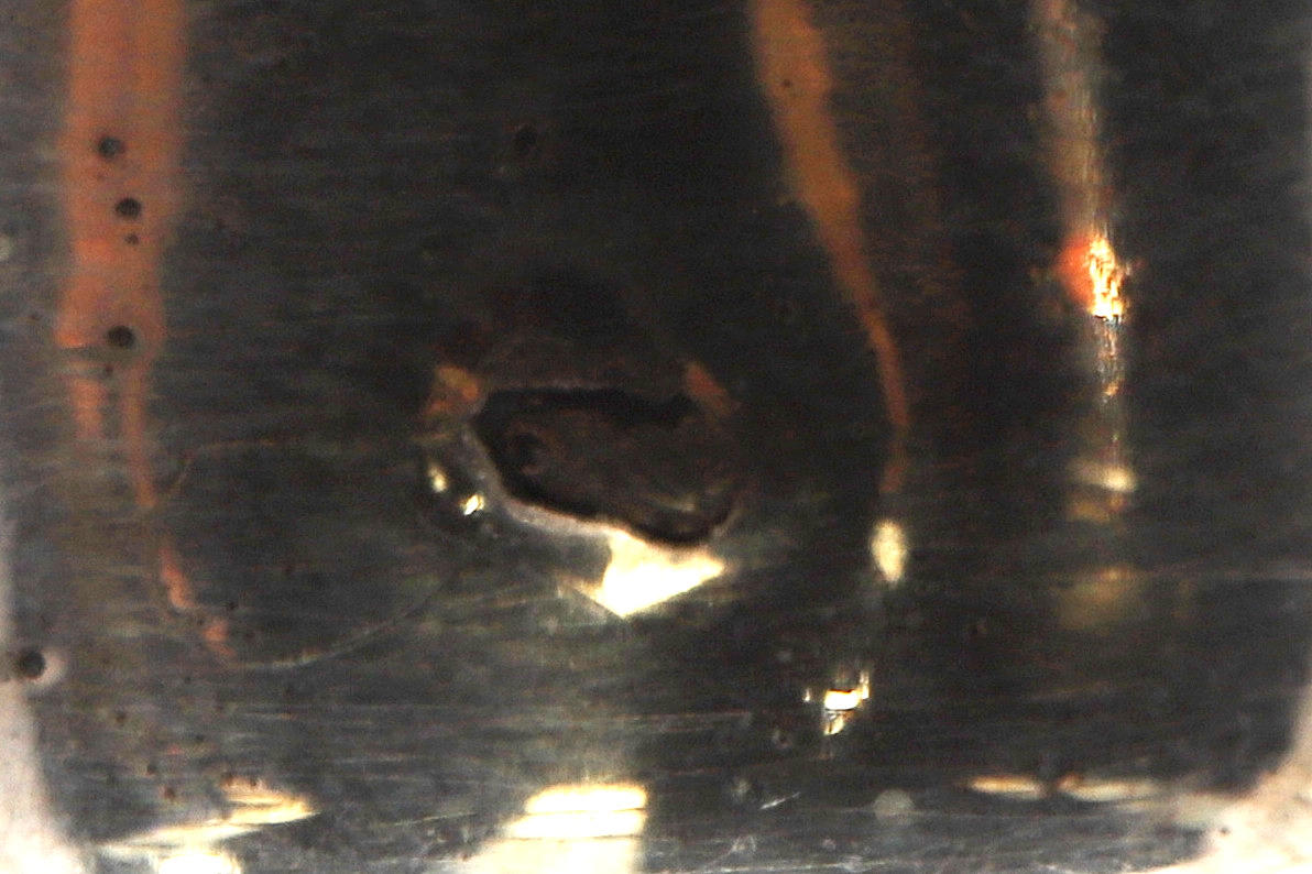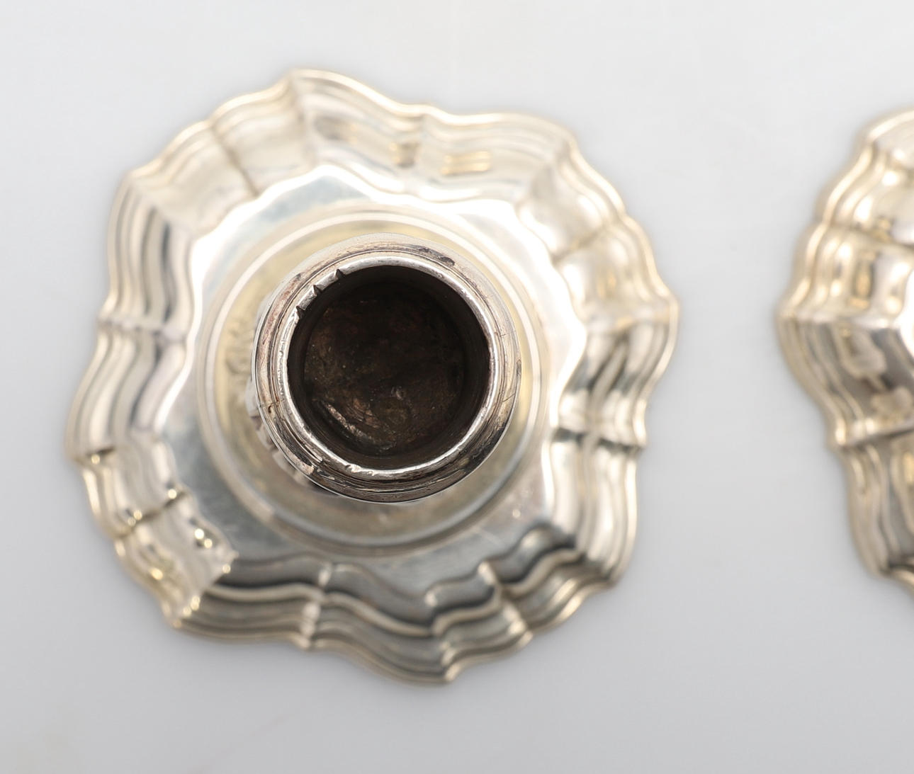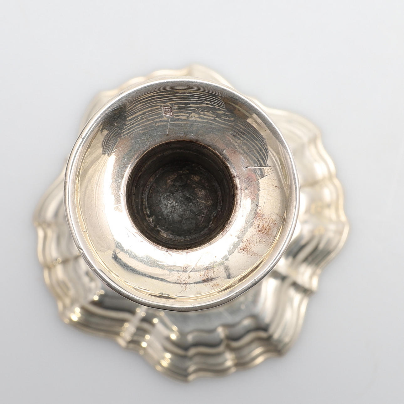 almen poleringsslitage svarende til alder og brug, dyserne med små kantmærker og skår, let anløbning, den ene lampet med kantbule, den anden med et par dybere ridser.