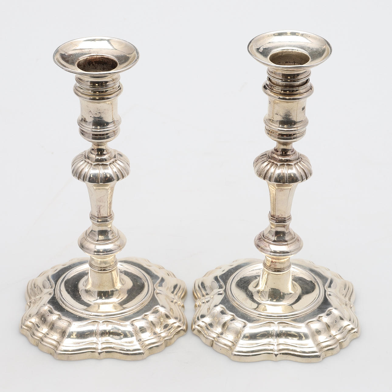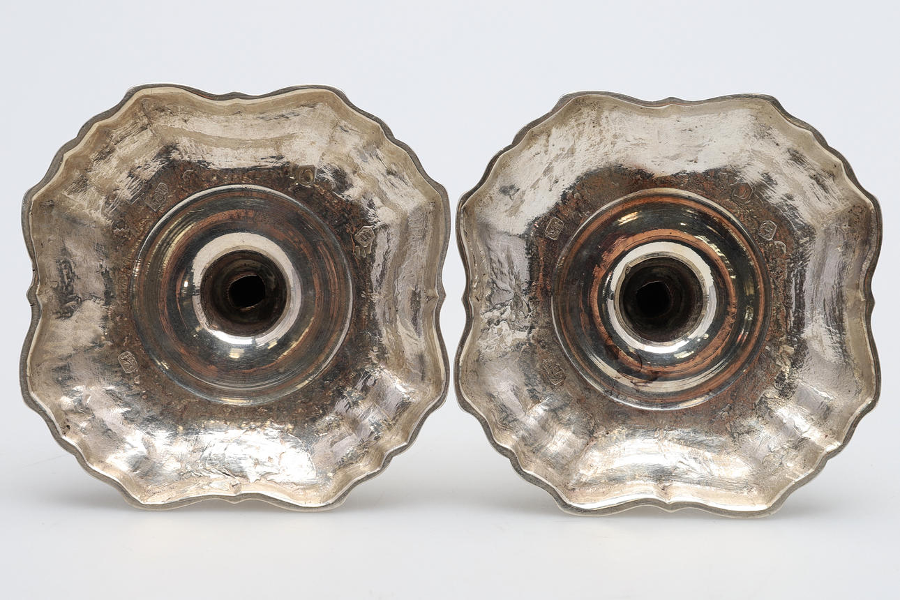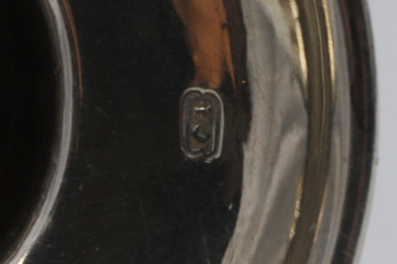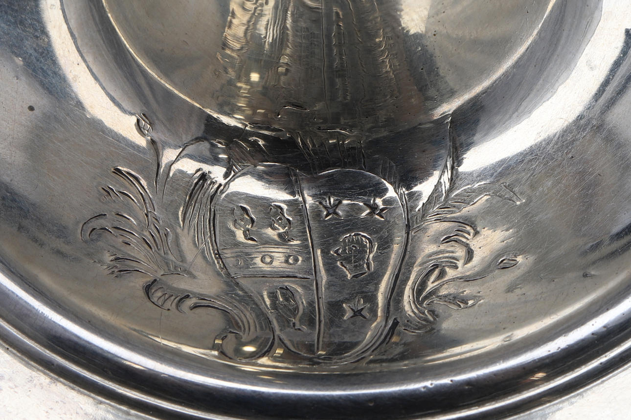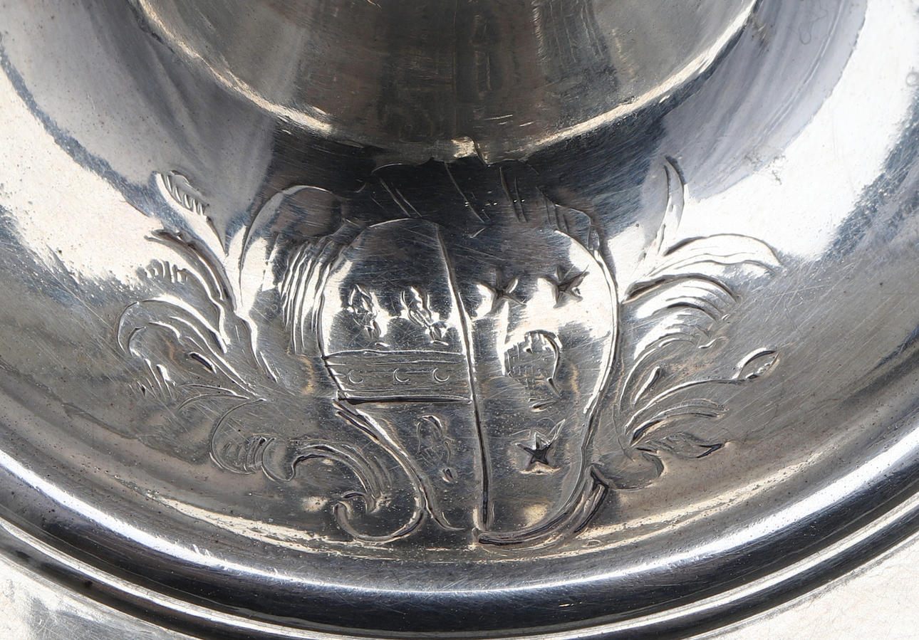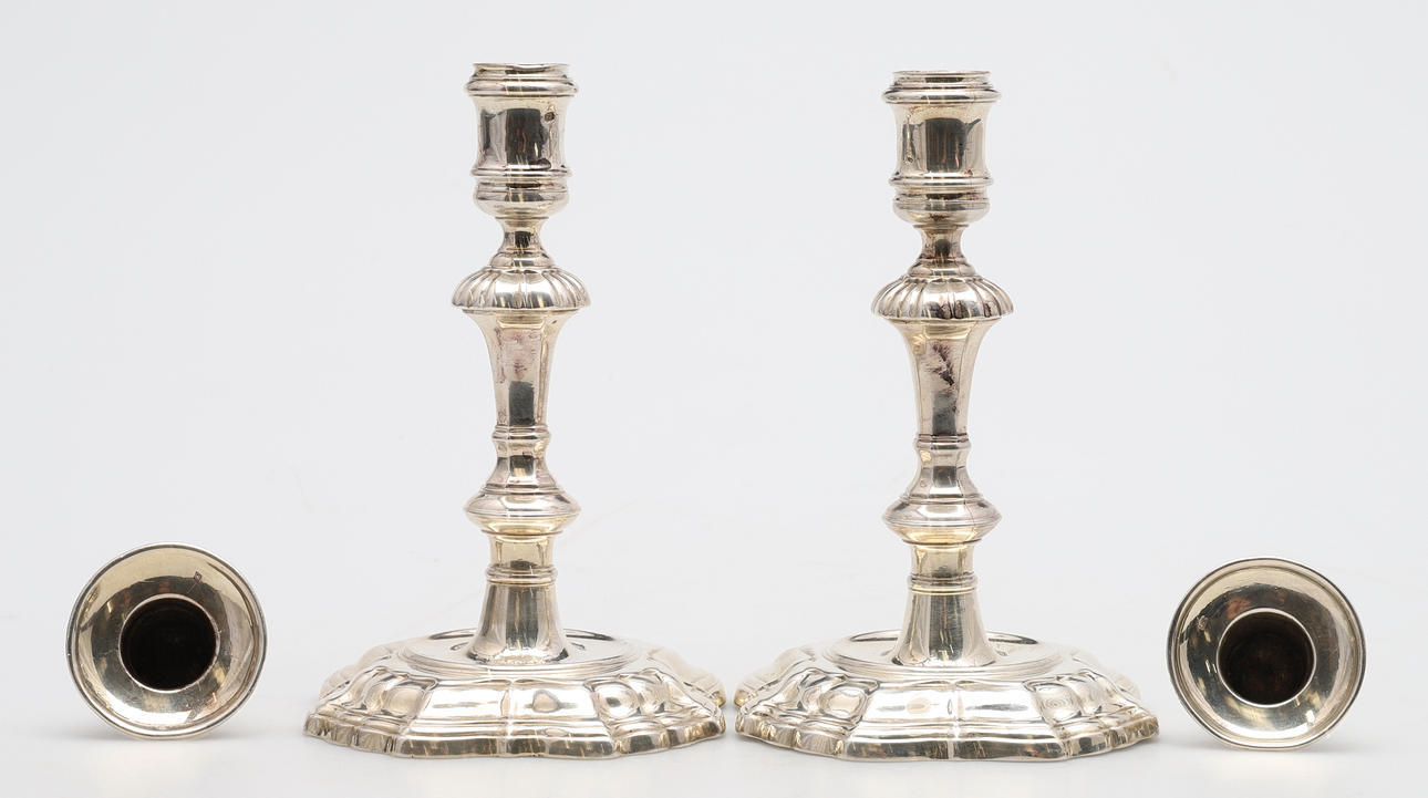 de ringformede cylindriske dyser på ottekantede knoppede stilke og firkantede trinbaser, indgraverede moderne våbenvåben af Boissier af James Gould, stemplet London 1738, senere modslag på dyserne, sammen med et par tilhørende cirkulære aftagelige dryppander, slået med fabrikationsmærket ET og mærke af et ørnehoved.