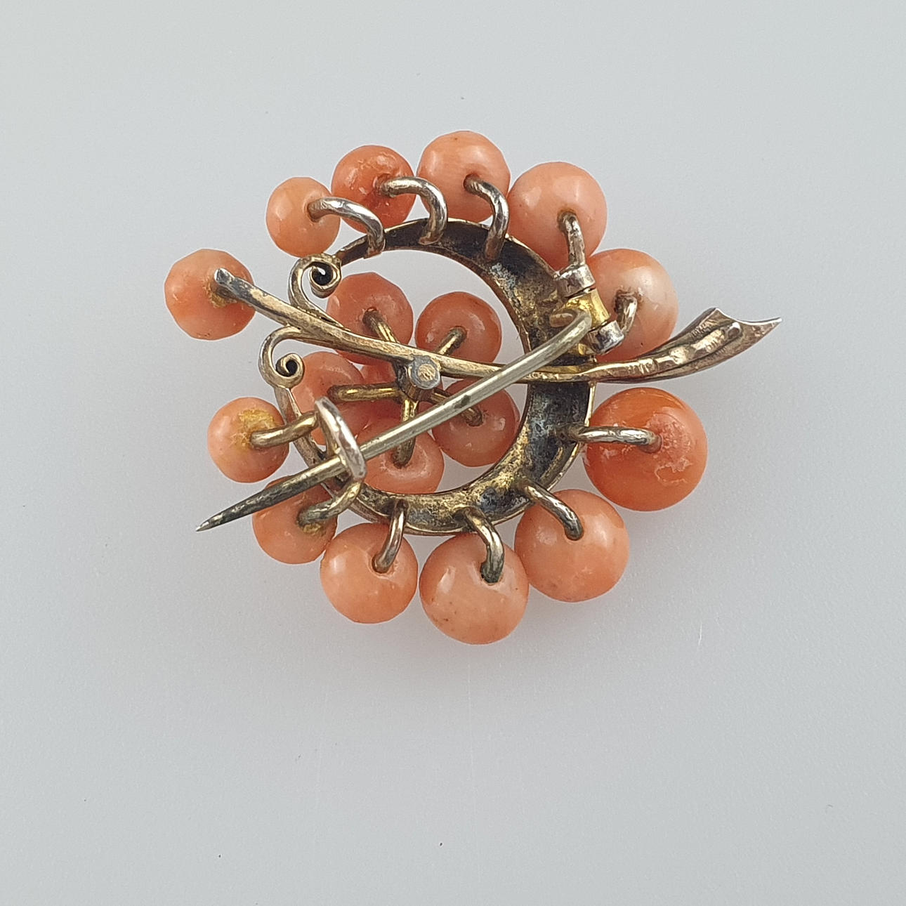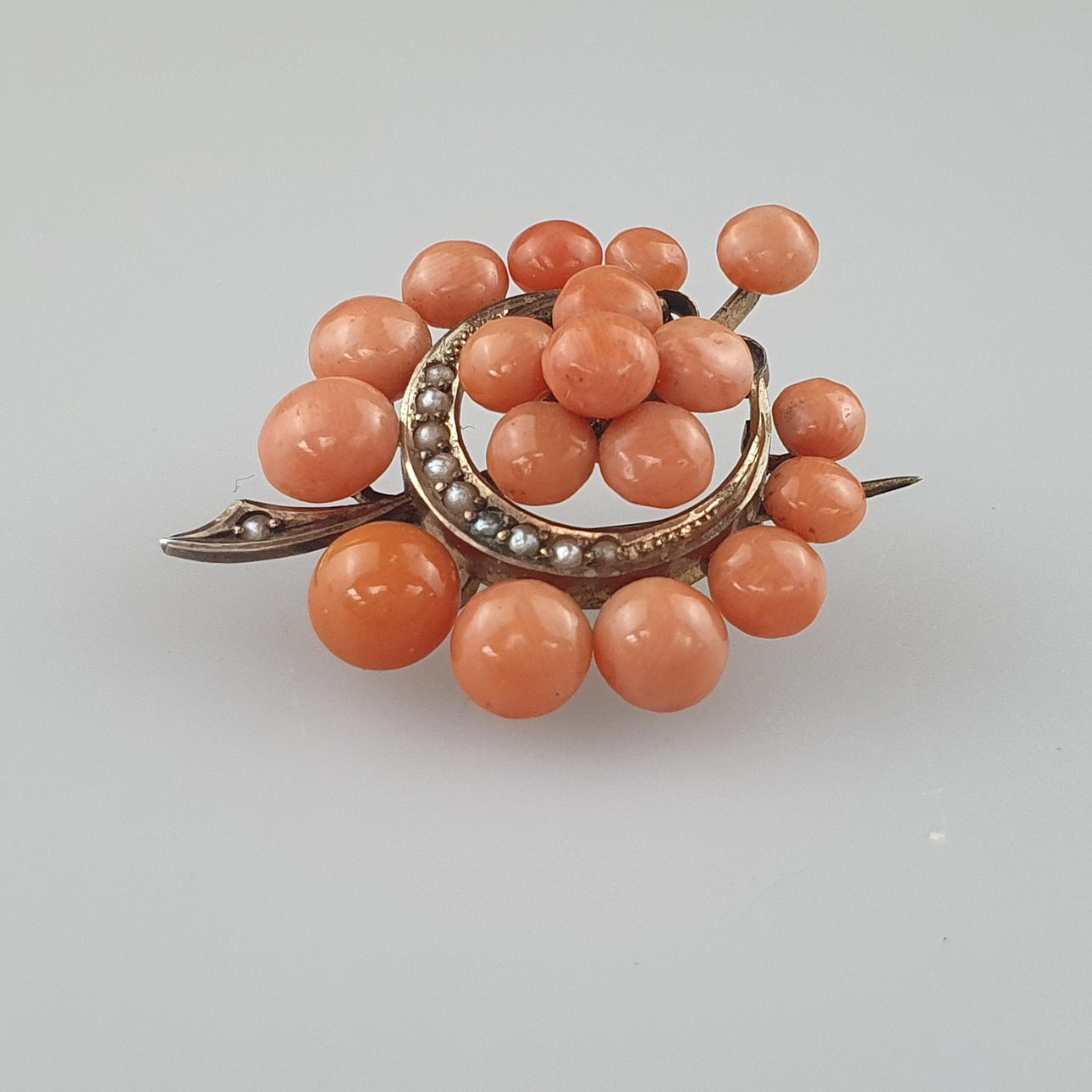 1857092. - ANTIKBROCHE med engleskindskoraller, halvmåneformet.