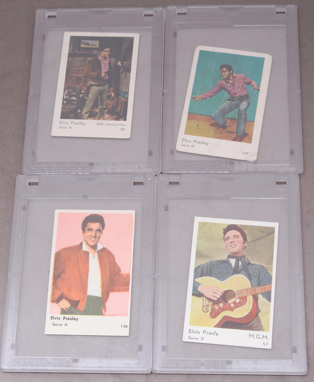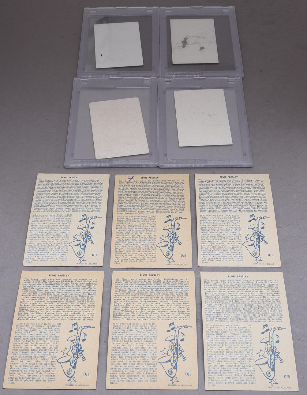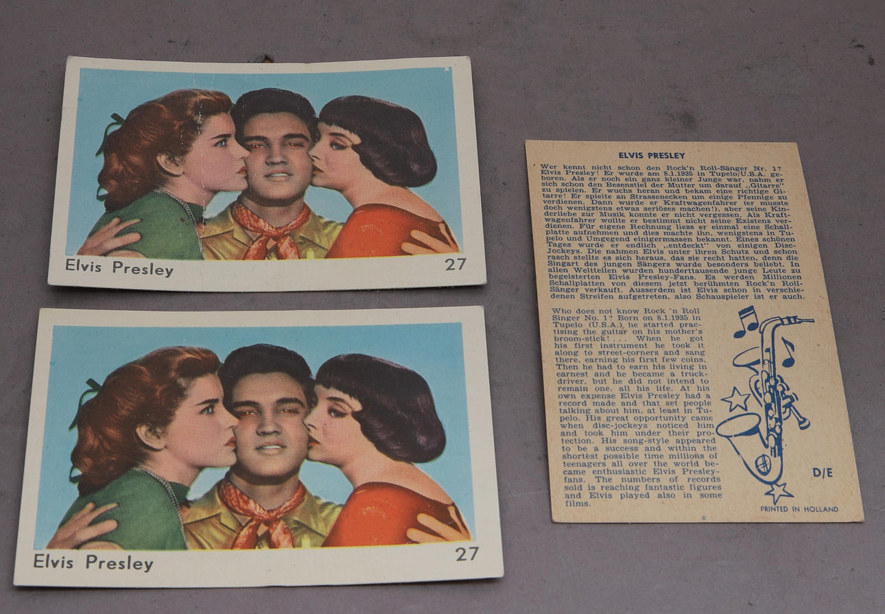 6 Collectable Elvis with Two Girls, nr. 27, fra 'Rock 'n Roll Jazz Toppers', 1959 Maple Leaf Chewing Gum, Amsterdam, Holland, distribueret af Mardi Gras Distributing Corp i Montreal, Canada. Mål ca 9x6 cm Elvis med guitar, Series X, MGM 57, mål ca 7x4,5 cm Elvis med kniv, Serie N, nr. 159, mål ca 7x4,5 cm Elvis med pistol, Serie N 20th Century Fox, nr. 89, mål ca 7x4,5 cm Elvis med rød jakke og lyserød baggrund , Serie A, nr. 146, mål ca 7x4,5 cm De sidste tre i samlerkort emballage.