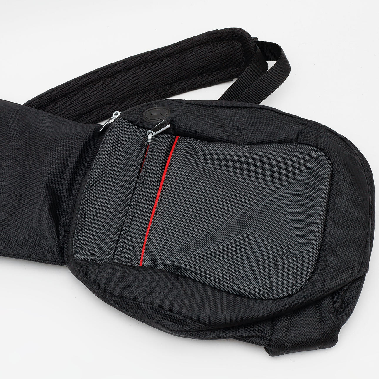 Foret taske med lynlås og justerbar skulderrem. Sort og gråt stof, tre rum og en udvendig lynlåslomme.
