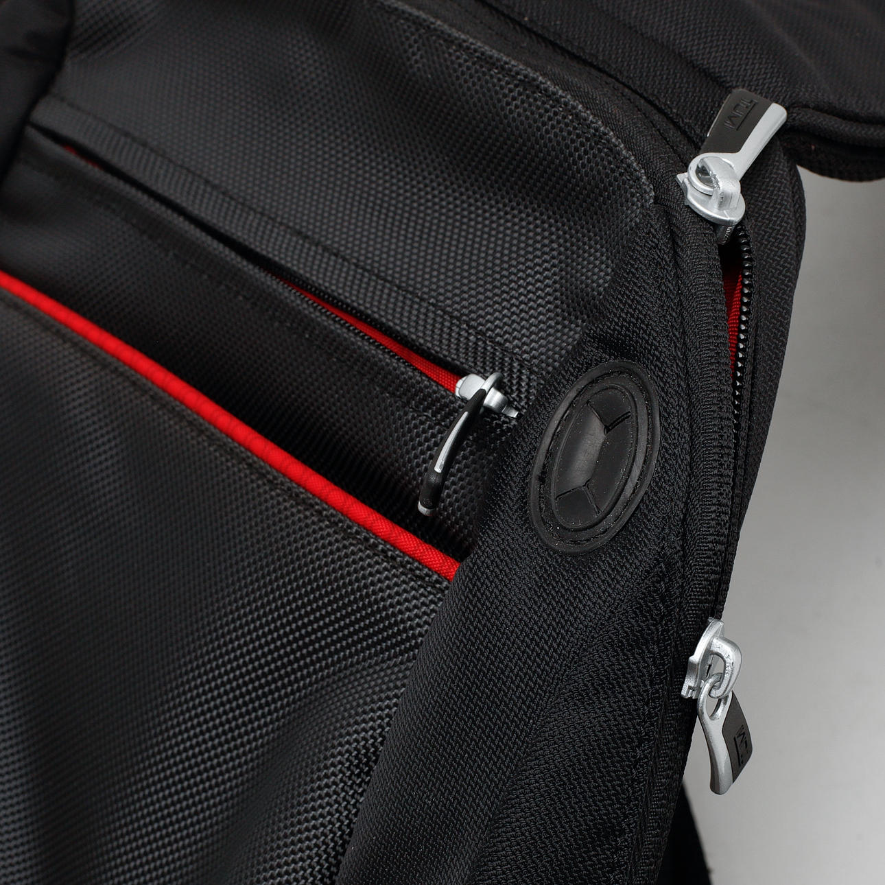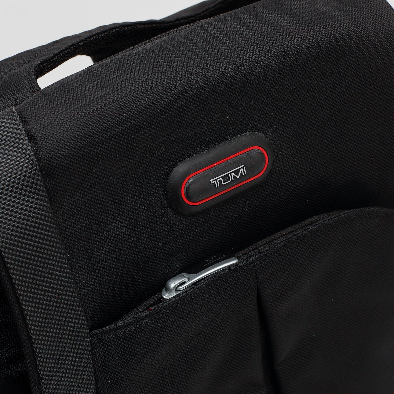 Mærket "TUMI" på plaketter.