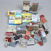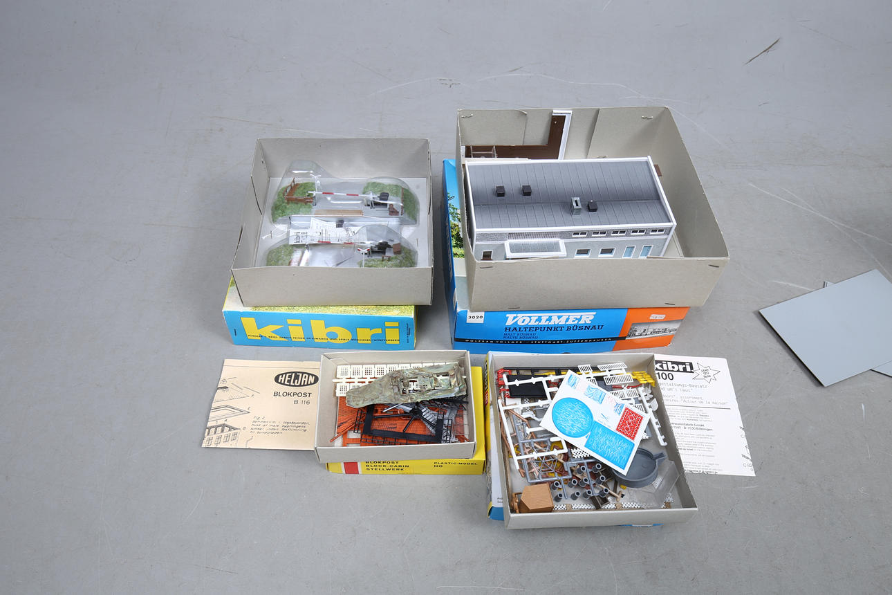 MODELJERNBANE, tilbehør, plast, huse med mere, omkring 43 dele.