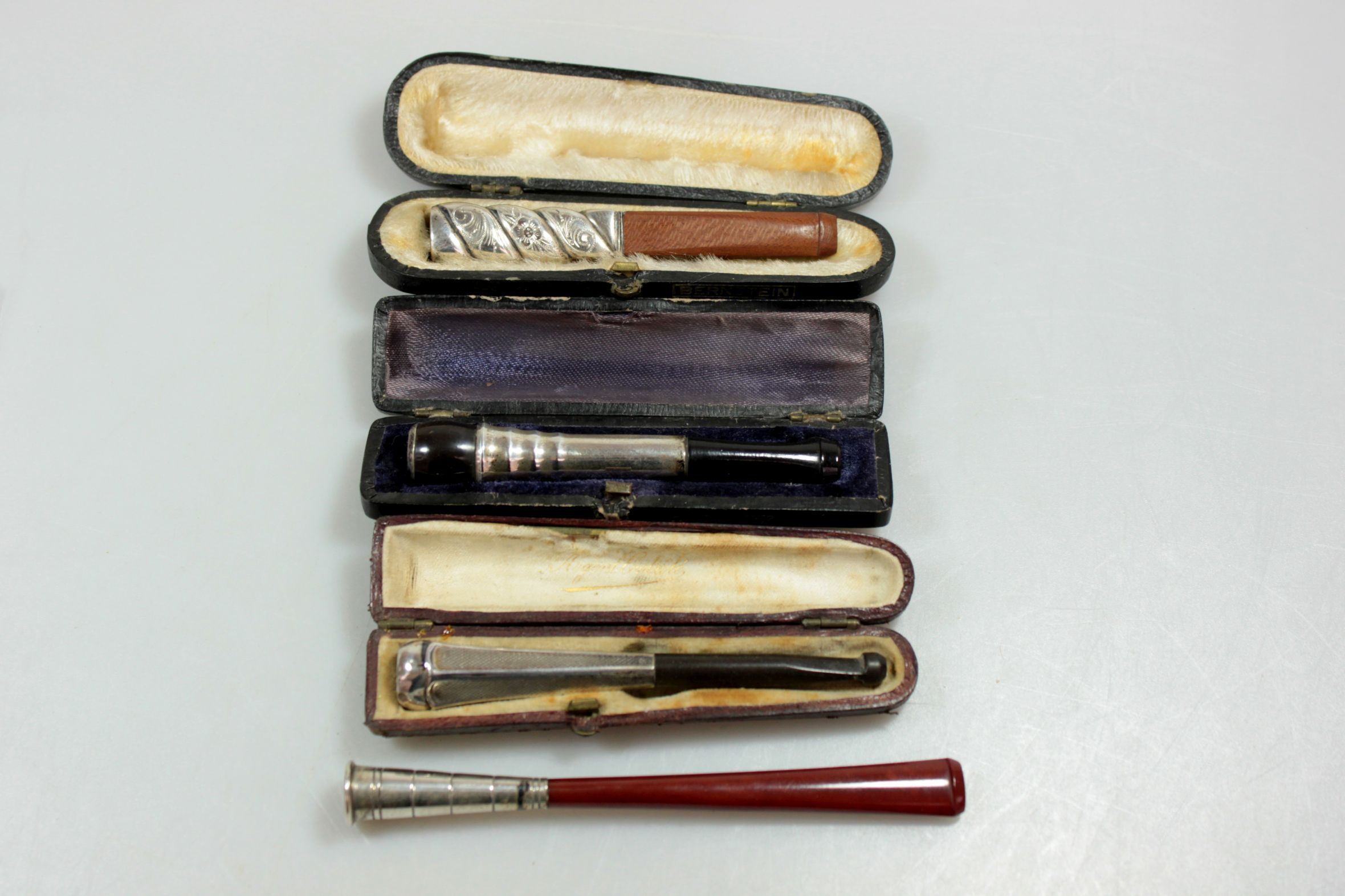 188492. FIRE CIGARETHOLDERE, sølv, træ, bakelit.