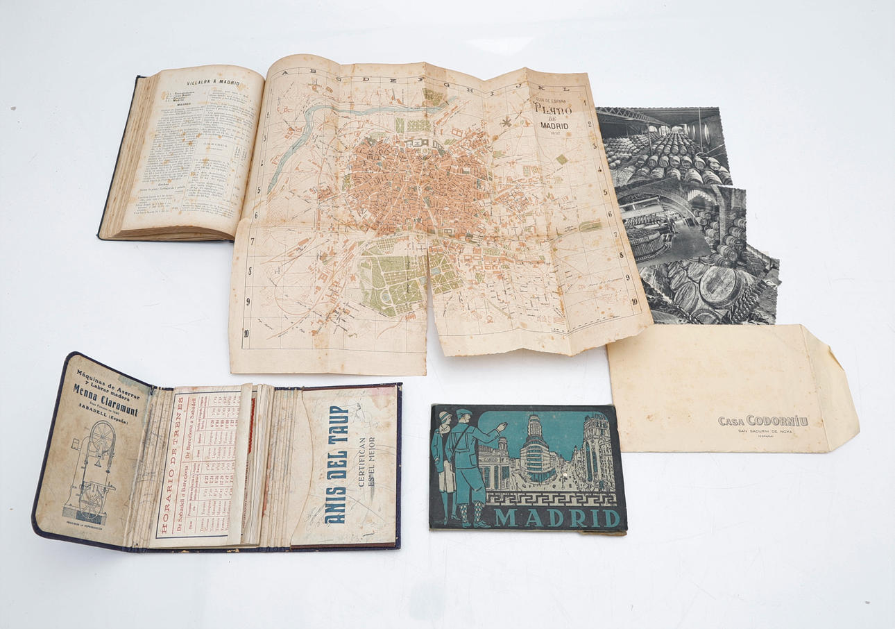 Eduardo Toda, "Guide to Spain and Portugal", Barcelona, Enrique López, 1892, XXIV og 243 s. (tallige udfoldninger), forlagsstofbind; "Sabadell. Festes 1918", togkøreplansguide med ark til noter og reklamer, på redaktionelt karton; fold ud med tolv postkort fra Madrid; komplet samling af ti postkort fra Codorniu, i deres originale kuvert.