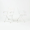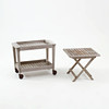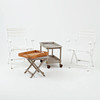 Teaktræ og malet teaktræ, tagmærket. Stelstole, foldbare, bredde ca 56, sædehøjde ca 46 cm. Serveringsvogn/bakkebord (+ ekstra bakke), længde ca 61, bredde ca 36, højde ca 50 cm. Klapbord ca 46x46, højde ca 40 cm.