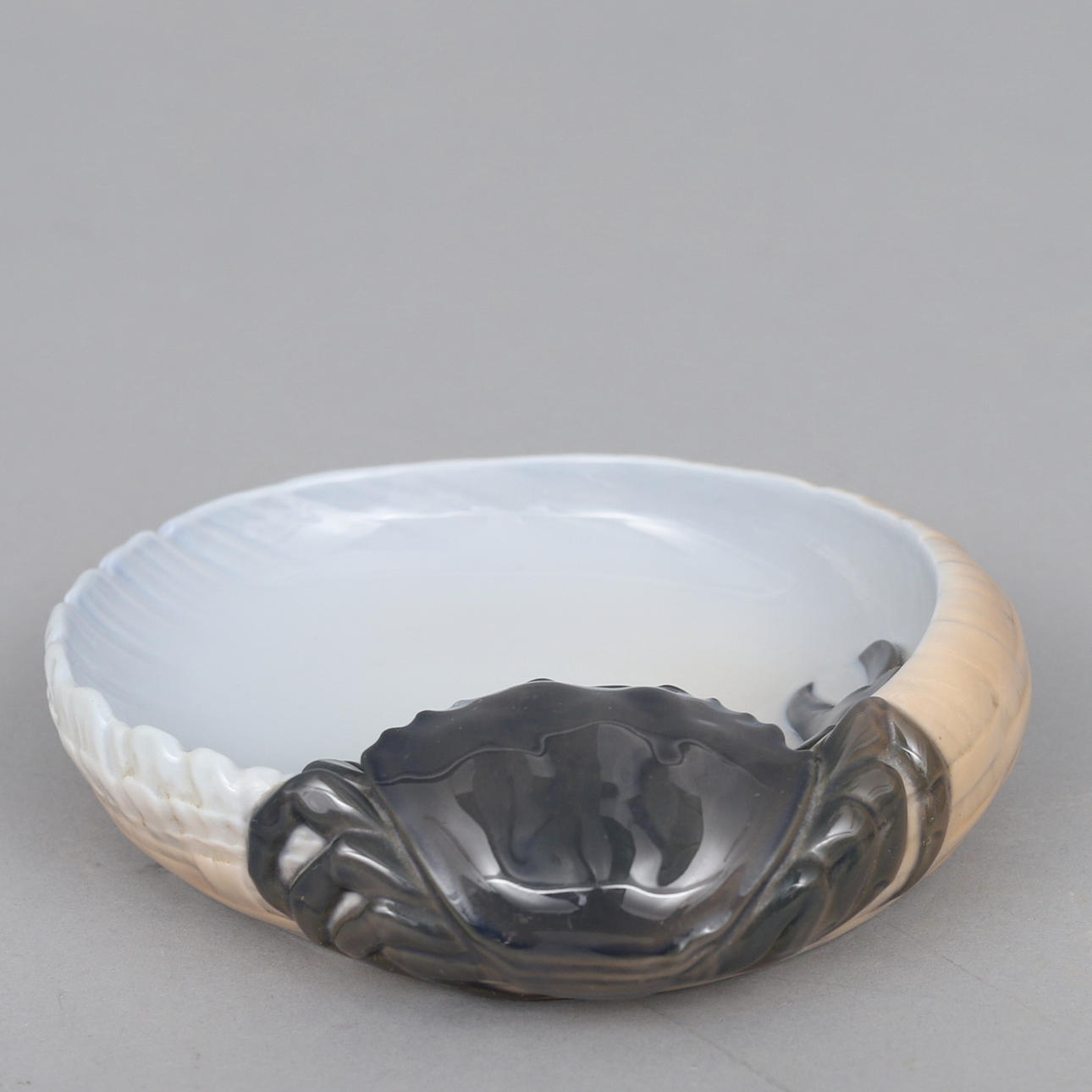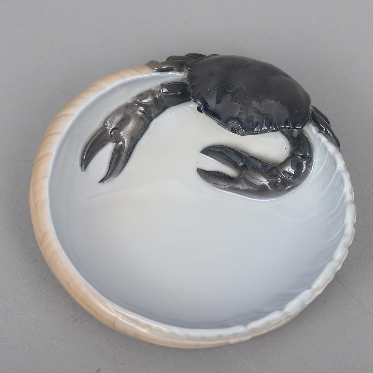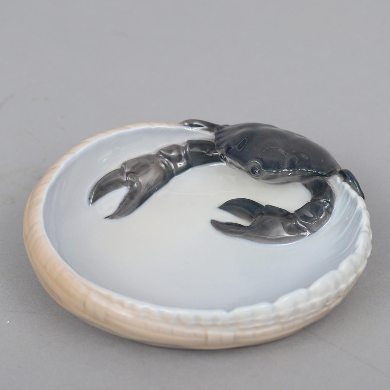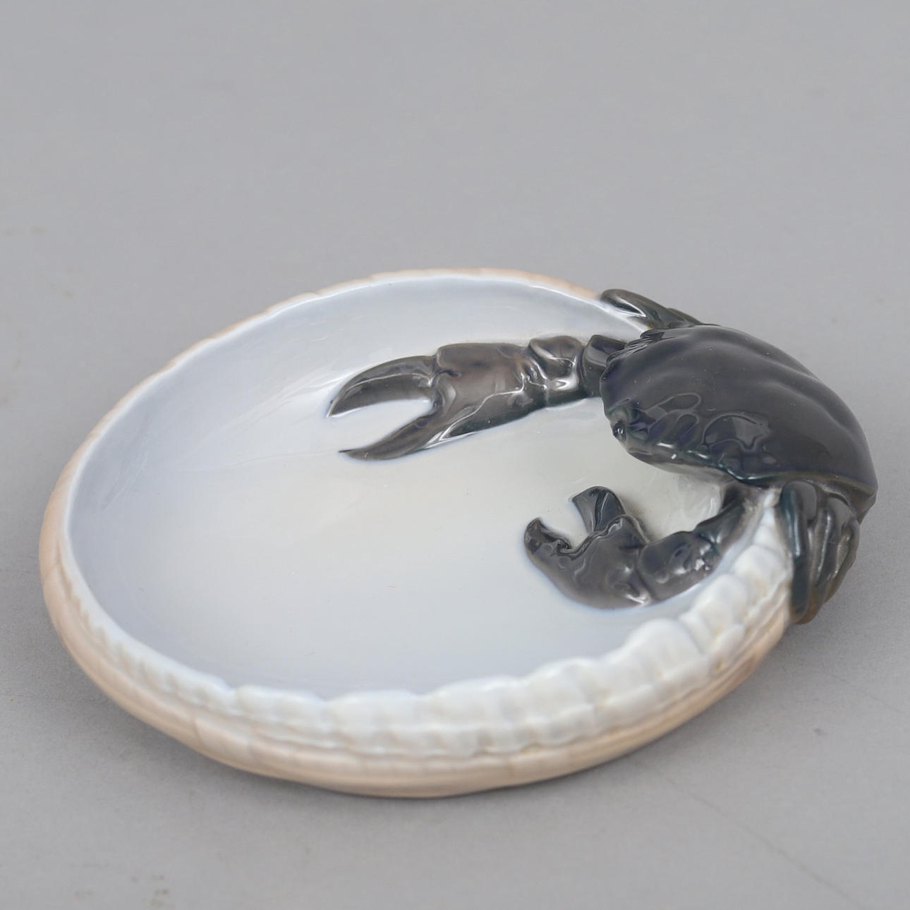 Snegleformet skål med krabbe i relief, porcelæn, modelnr. 3131. Diameter ca 16 cm.
