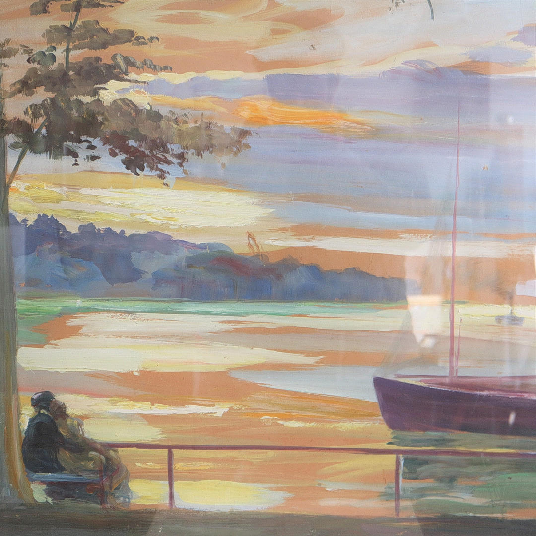 Olie på lærred, flodlandskab med mennesker & bådmotiv, indrammet med glas, signeret Peter Bayer, billedmål: 68 x 93 cm, rammemål: 74 x 100 cm.