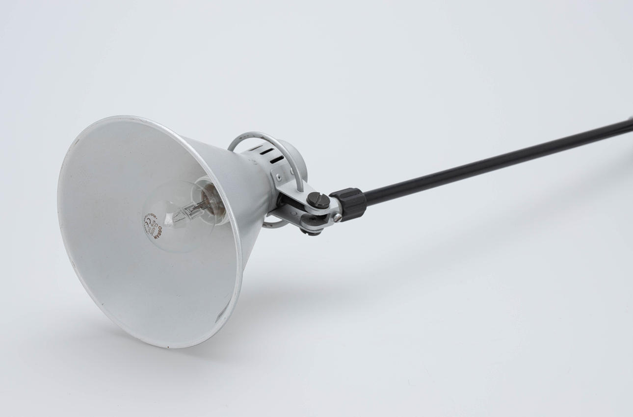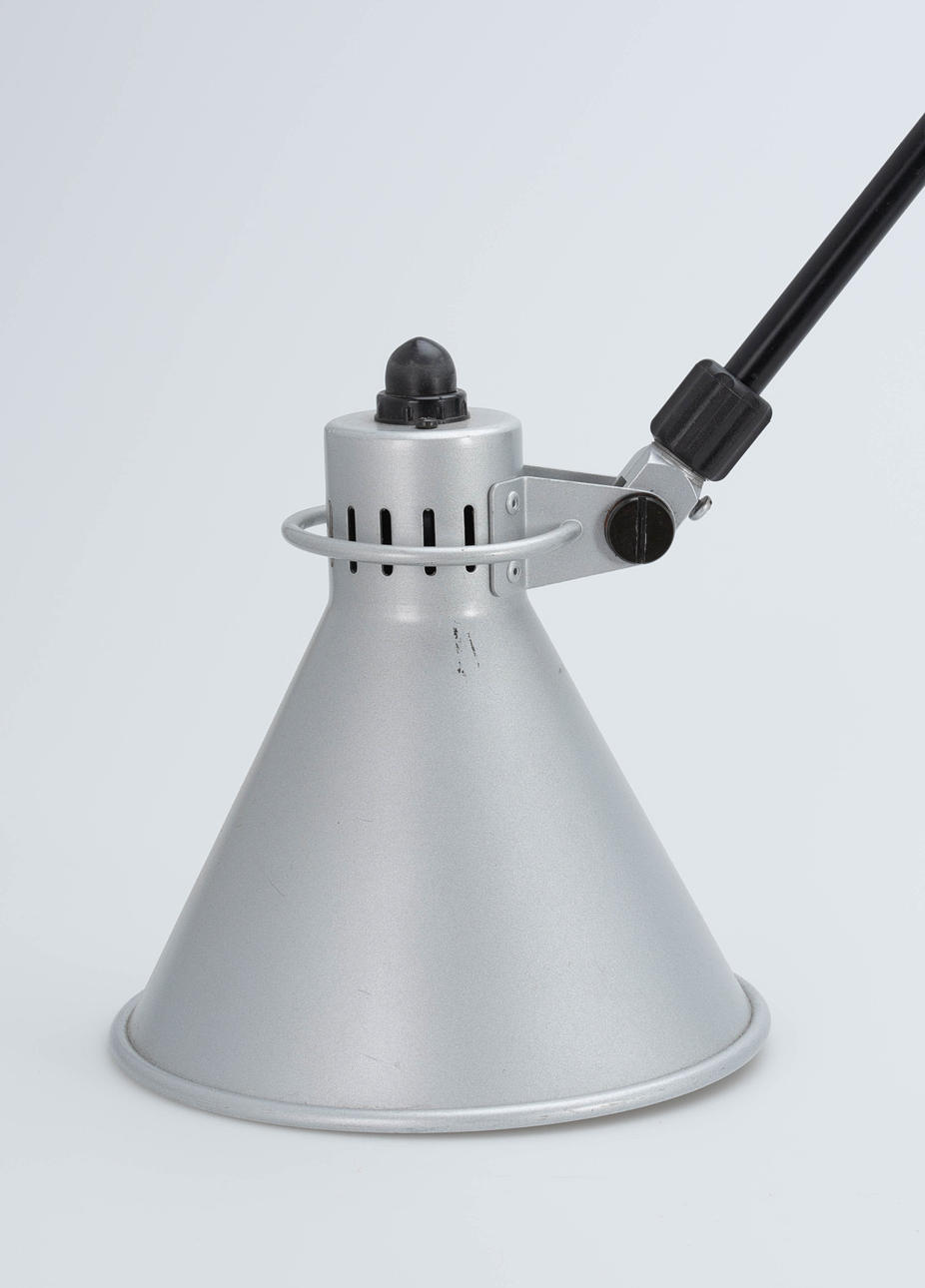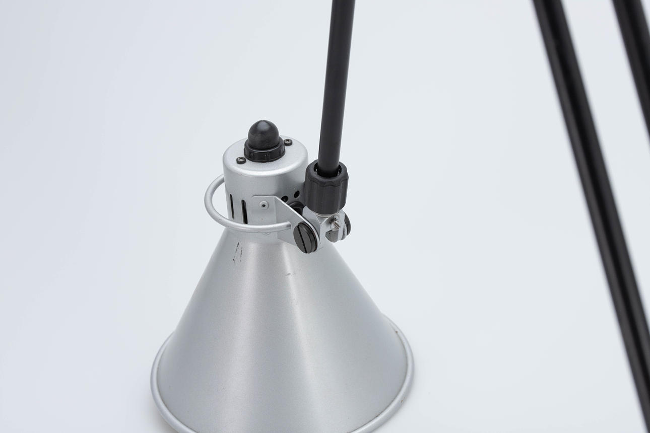 Udkast: 1980. Anodiseret aluminium reflektor. Stænger stål, sort. Fod med skruegevind til fastspænding. H. ca. 80 cm, diameter 18 cm.