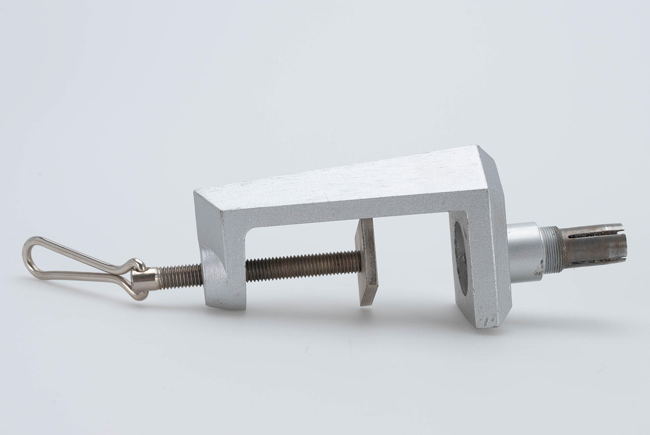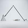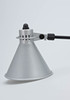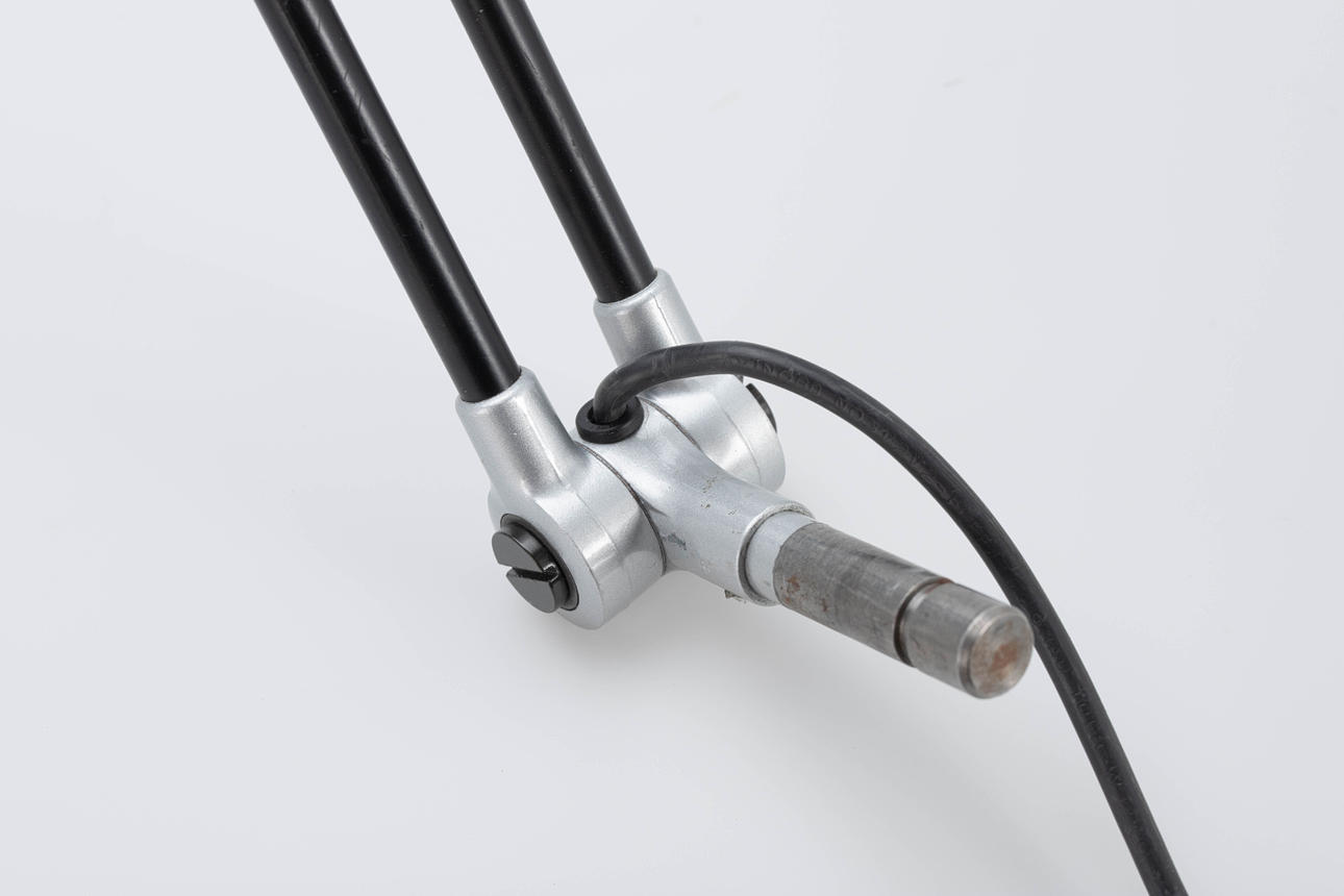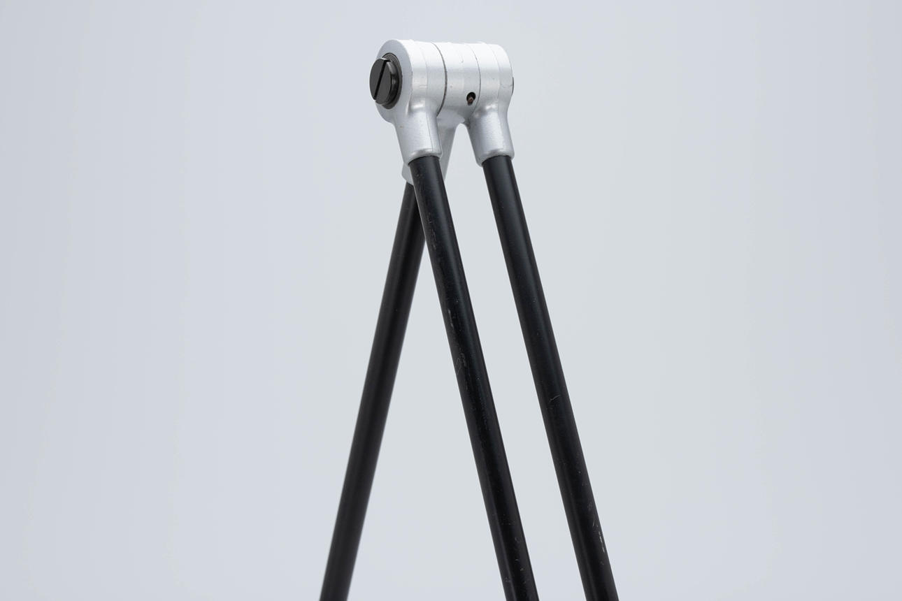 Udkast: 1980. Anodiseret aluminium reflektor. Stænger stål, sort. Fod med skruegevind til fastspænding. H. ca. 80 cm, diameter 18 cm.