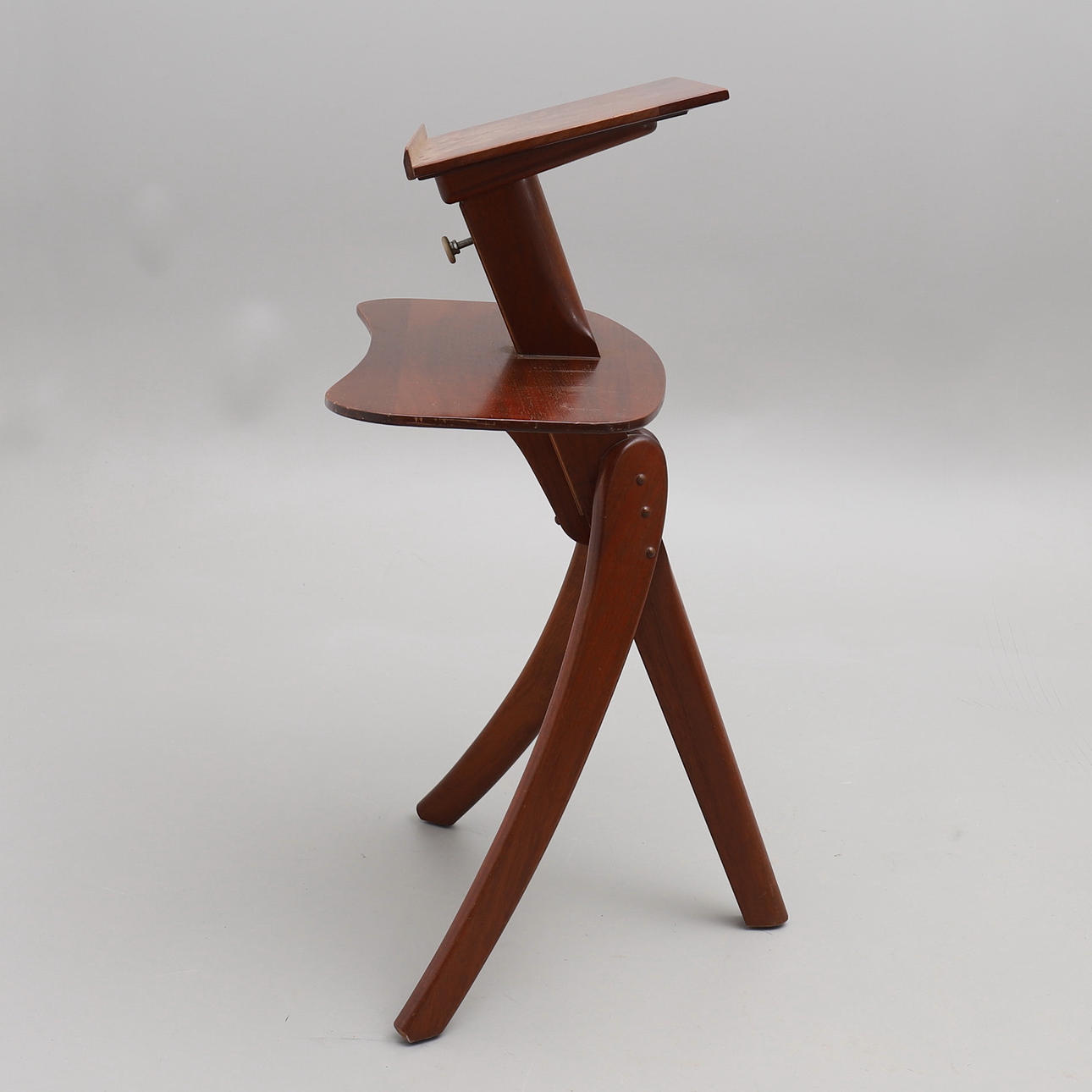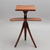 Mahogni. To skiver, den øverste justerbar. Bredde 81, laveste højde 114 cm. Nederste tallerkenhøjde 79 cm.