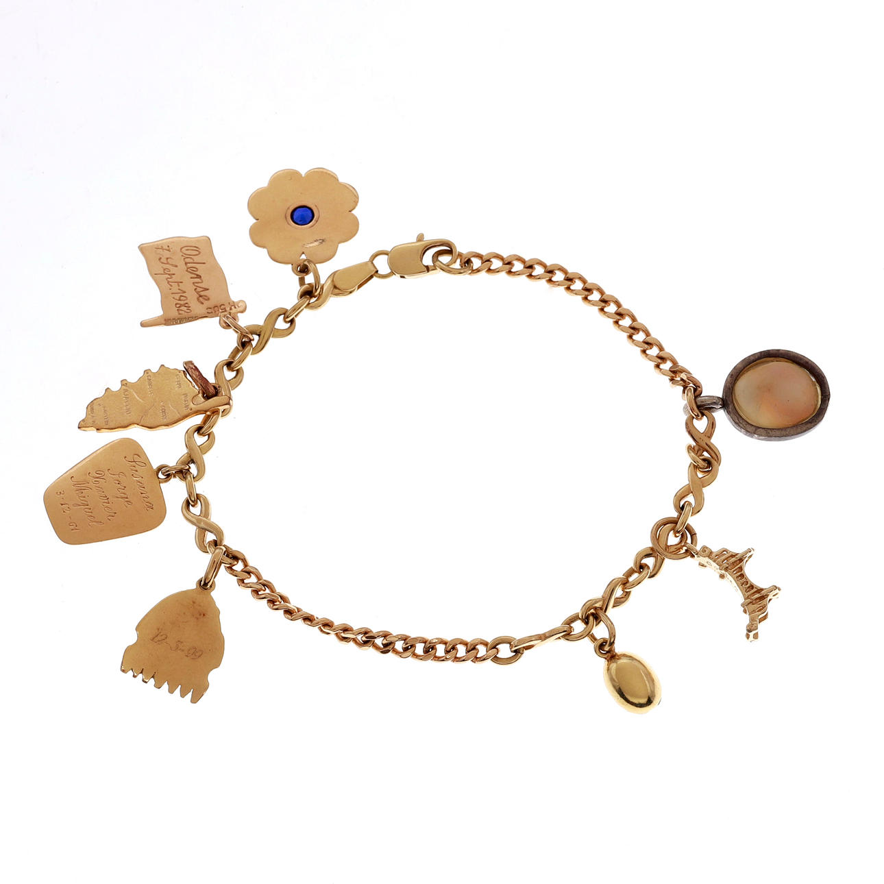 18K guld og guld charms af forskellige karat, sølv, forgyldt sølv, forgyldt metal, rund skåret safir, ca 0,22 ct, skal og emalje. 20 cm. 18,8 gram.