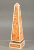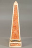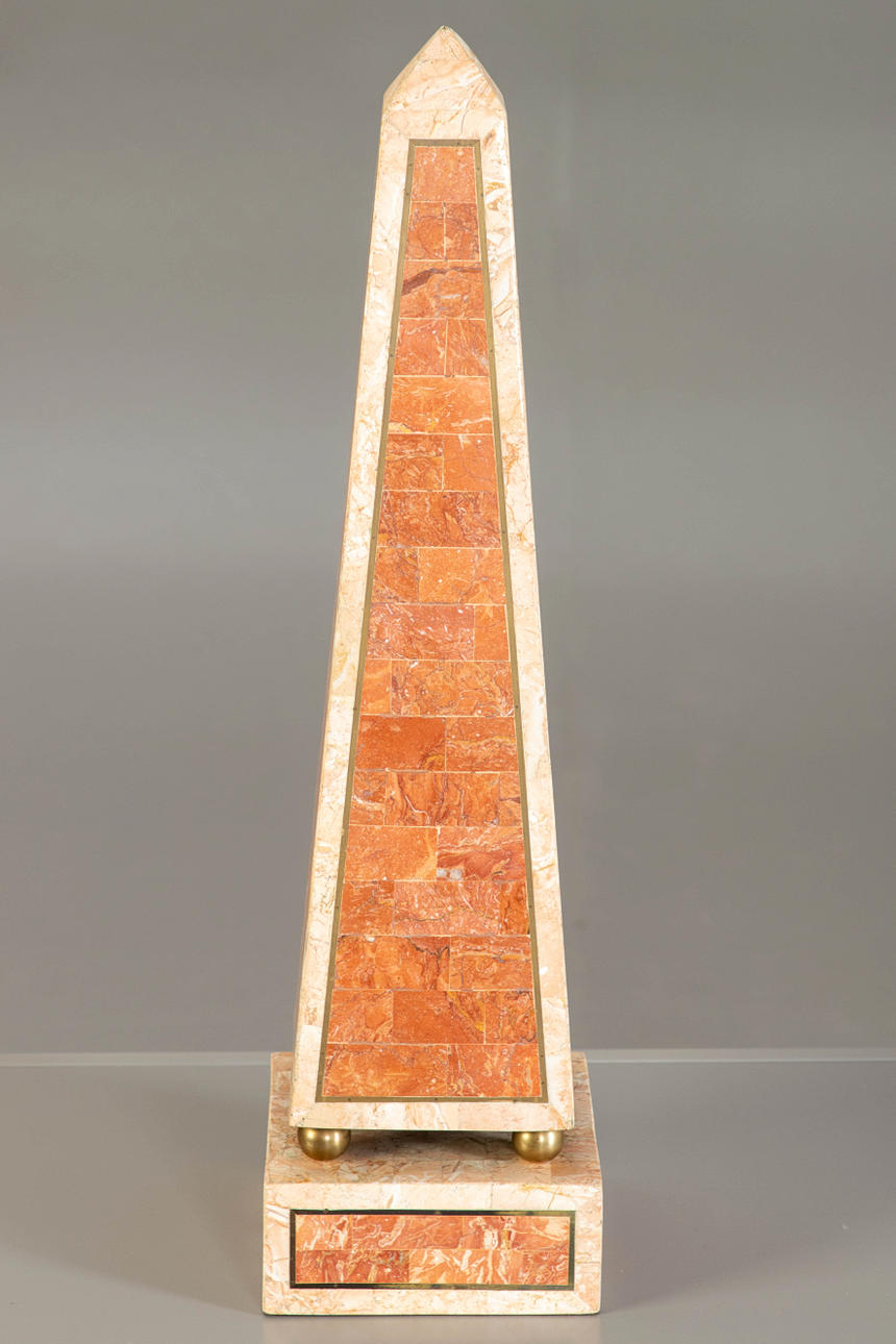 Marmorplader i forskellige nuancer af laks. Firkantet bund med trinpaneler. Den konisk tilspidsede firkantede søjle med en sidste pyramidion på messingkugler. HxBxD: 60 x 16 x 16 cm.