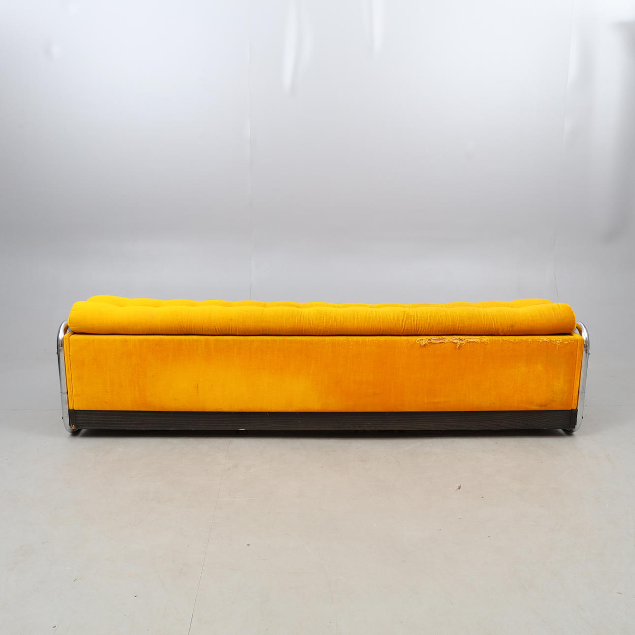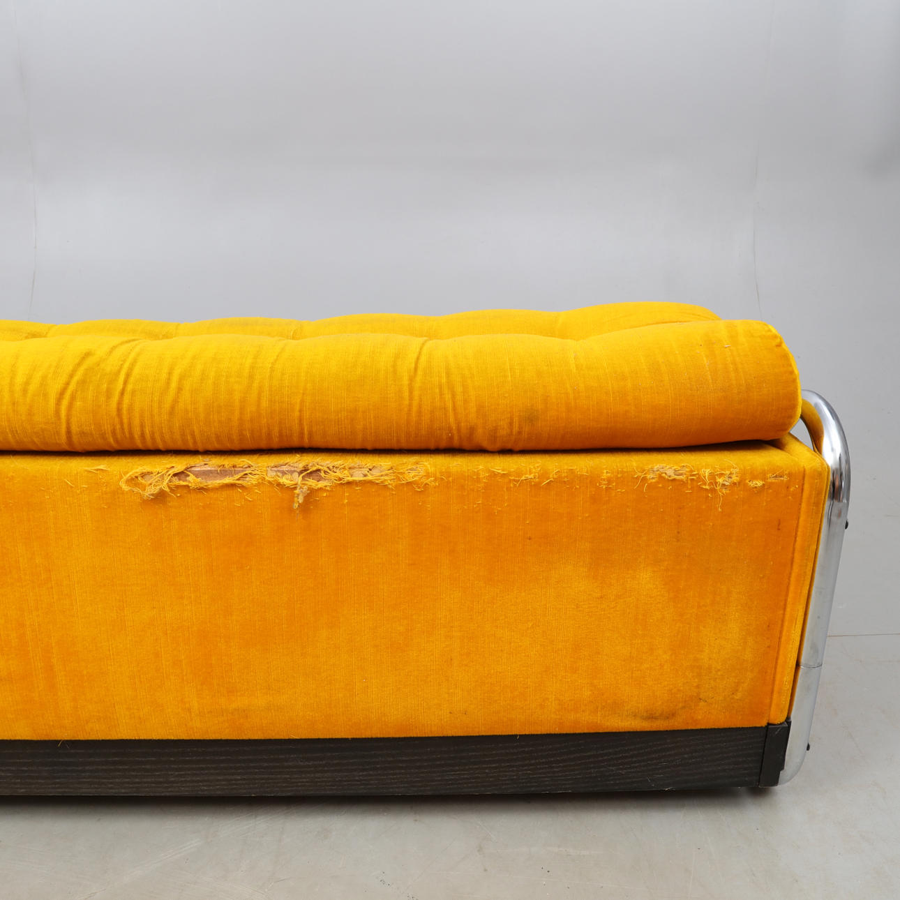 Gult, dybt syet plysbetræk på et forkromet stel. Undervogn og tværstang bag i malet træ. Længde 205, højde 54, total dybde 104 cm. Sædehøjde 25 cm.