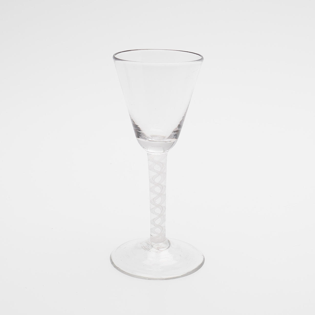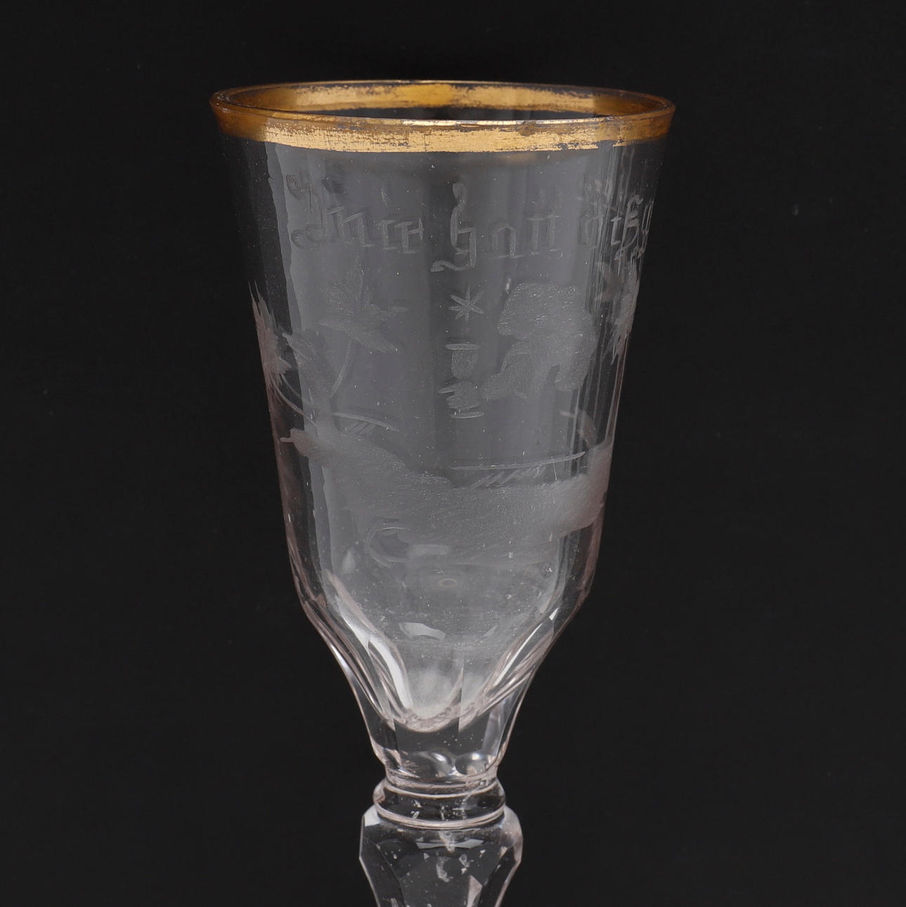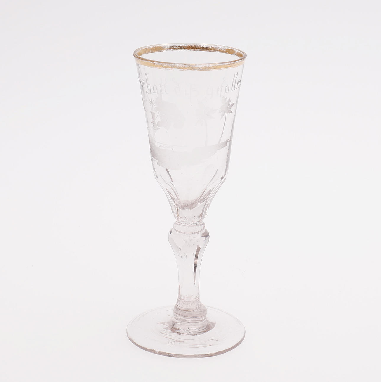 Med blandt andet graveret dekoration, indblæst hvid spiral og teksten "Min gott dig gefallen", omkring år 1800, højde 13-6-15,7 cm.