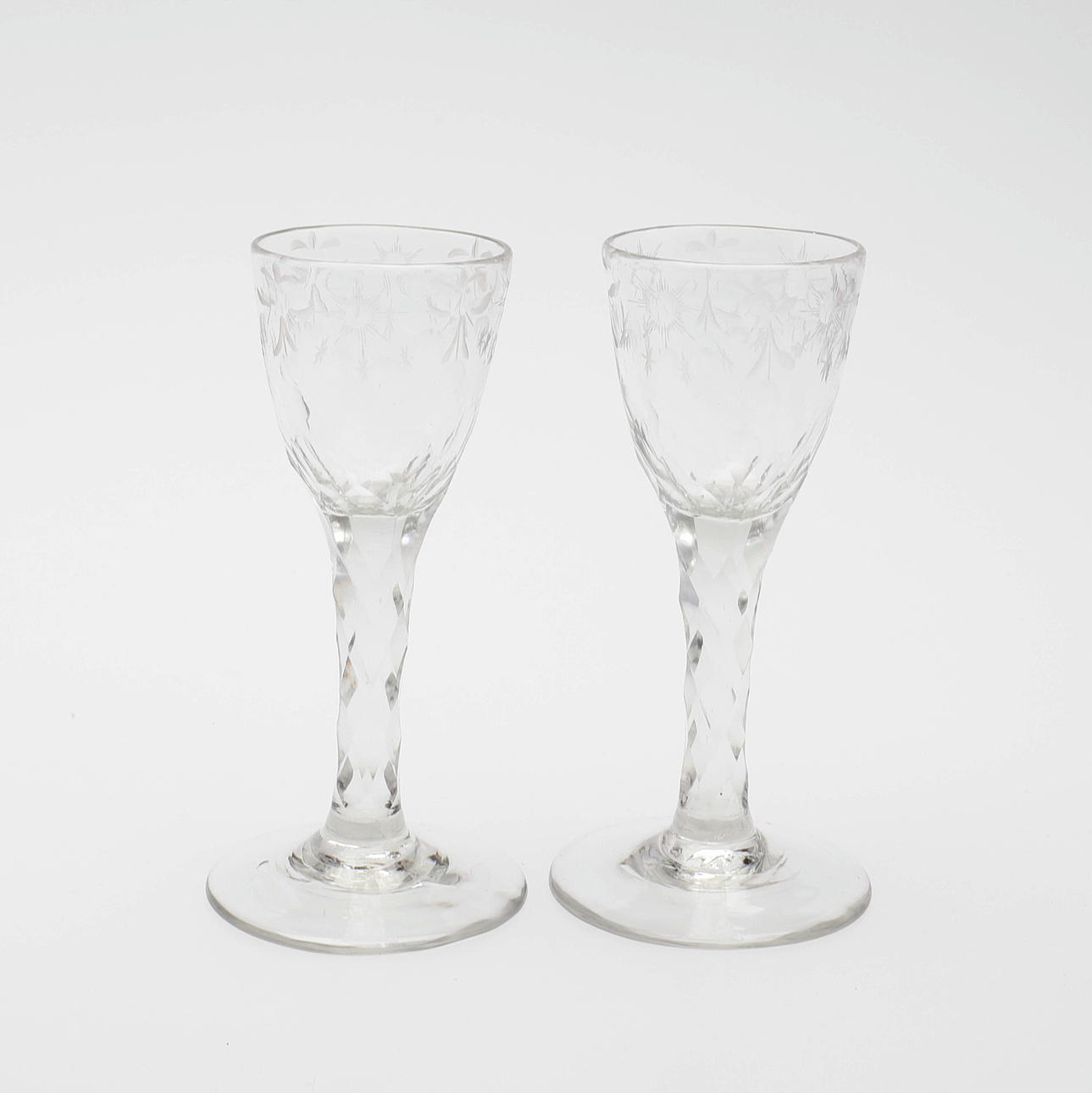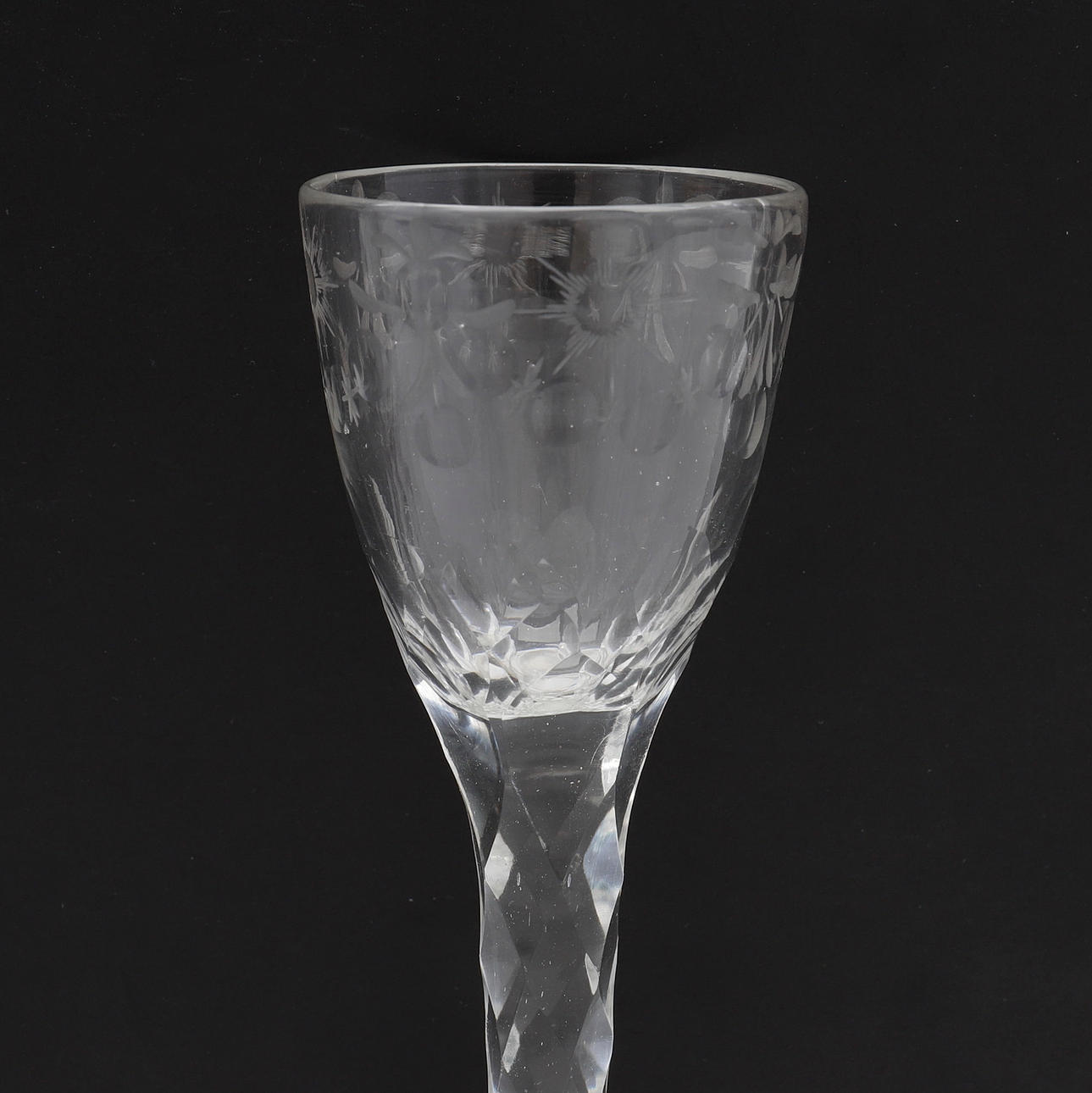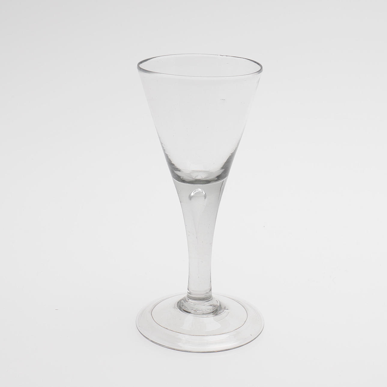 Med blandt andet graveret dekoration, indblæst hvid spiral og teksten "Min gott dig gefallen", omkring år 1800, højde 13-6-15,7 cm.