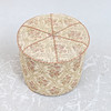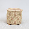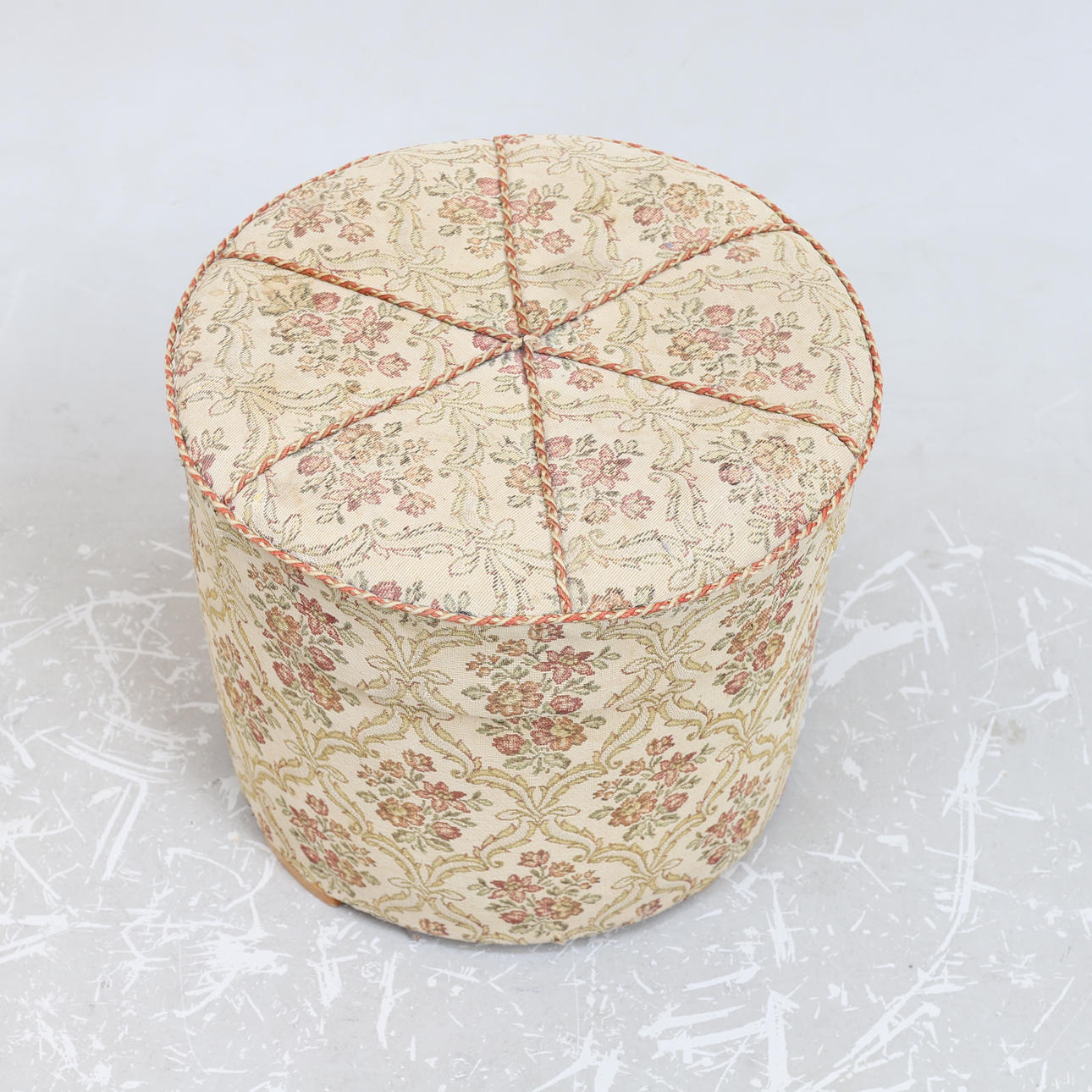 Klædt i stof. Åbningsbar sæde med underliggende opbevaring. Diameter ca 48 cm. Højde ca 42 cm.