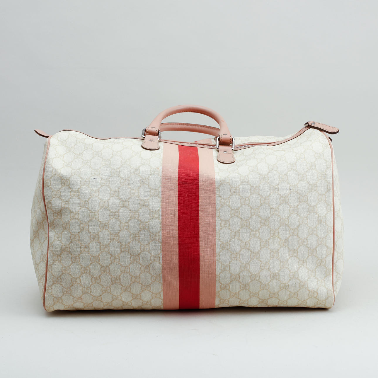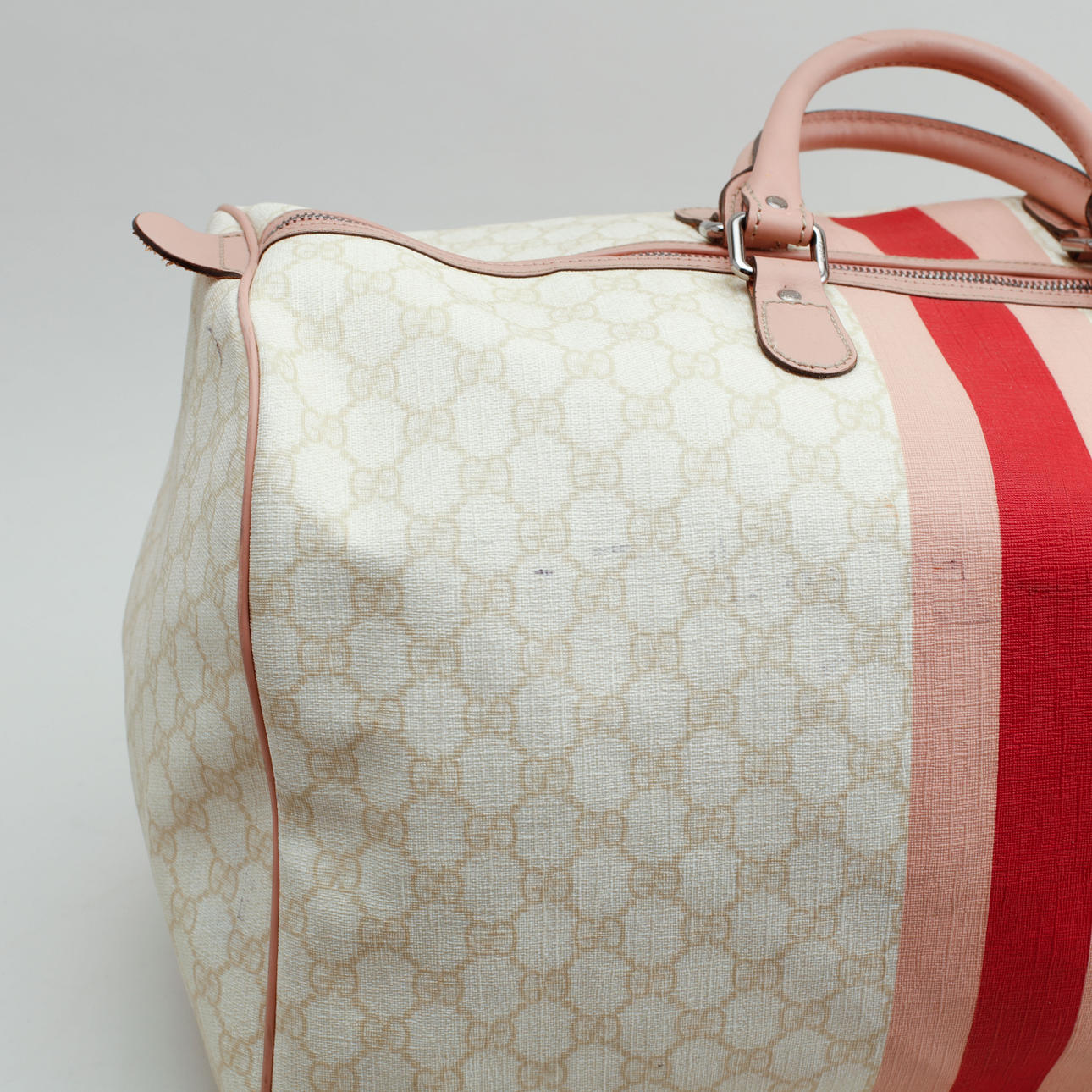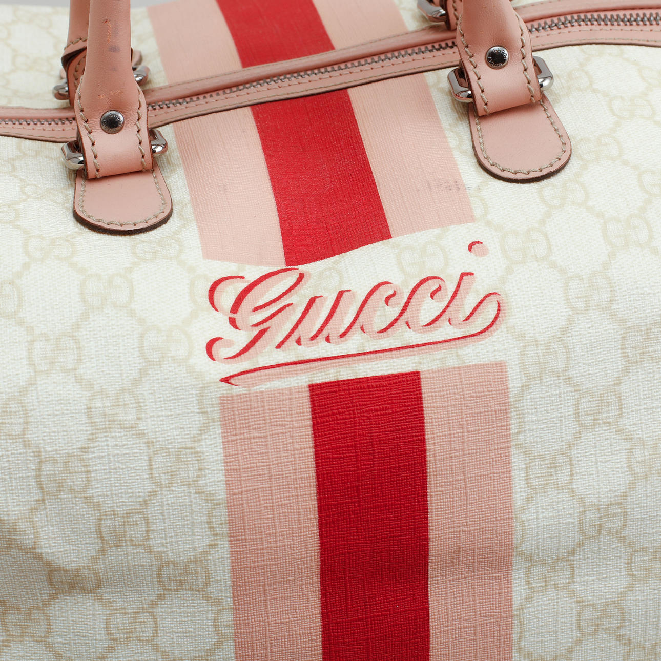 Let monogram lærred med detaljer i pink læder. Trykt dekor af striber i pink og logo. Mærket Gucci Made in Italy og serienummer. 1 indvendigt rum. 41 x 27 x 24 cm.