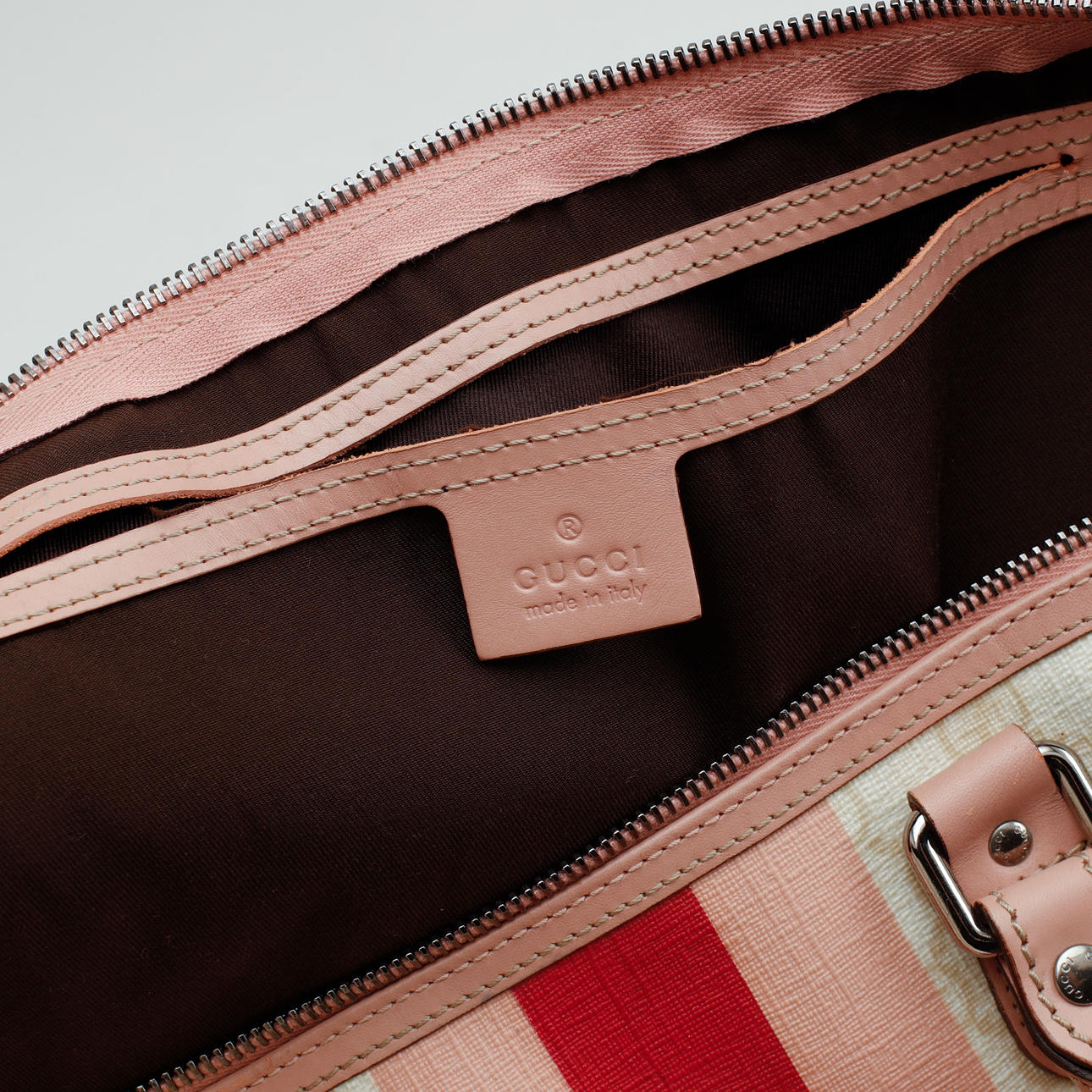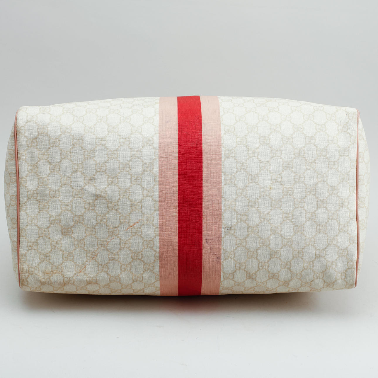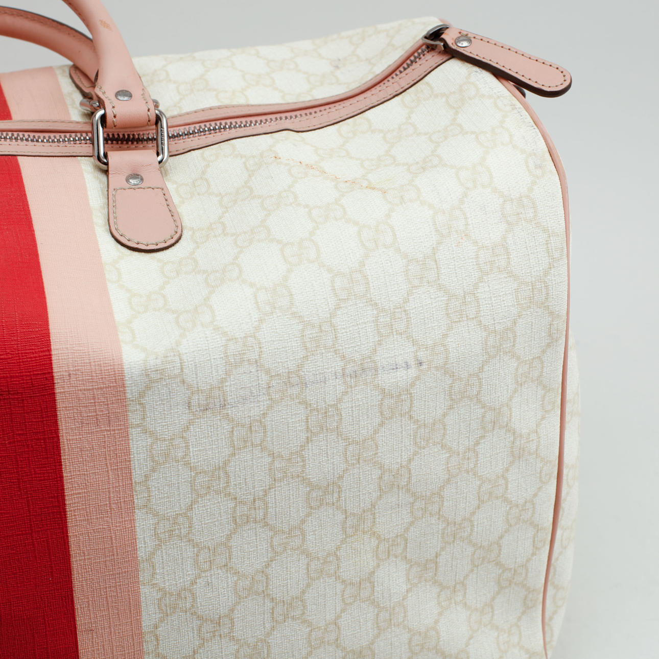 Let monogram lærred med detaljer i pink læder. Trykt dekor af striber i pink og logo. Mærket Gucci Made in Italy og serienummer. 1 indvendigt rum. 41 x 27 x 24 cm.