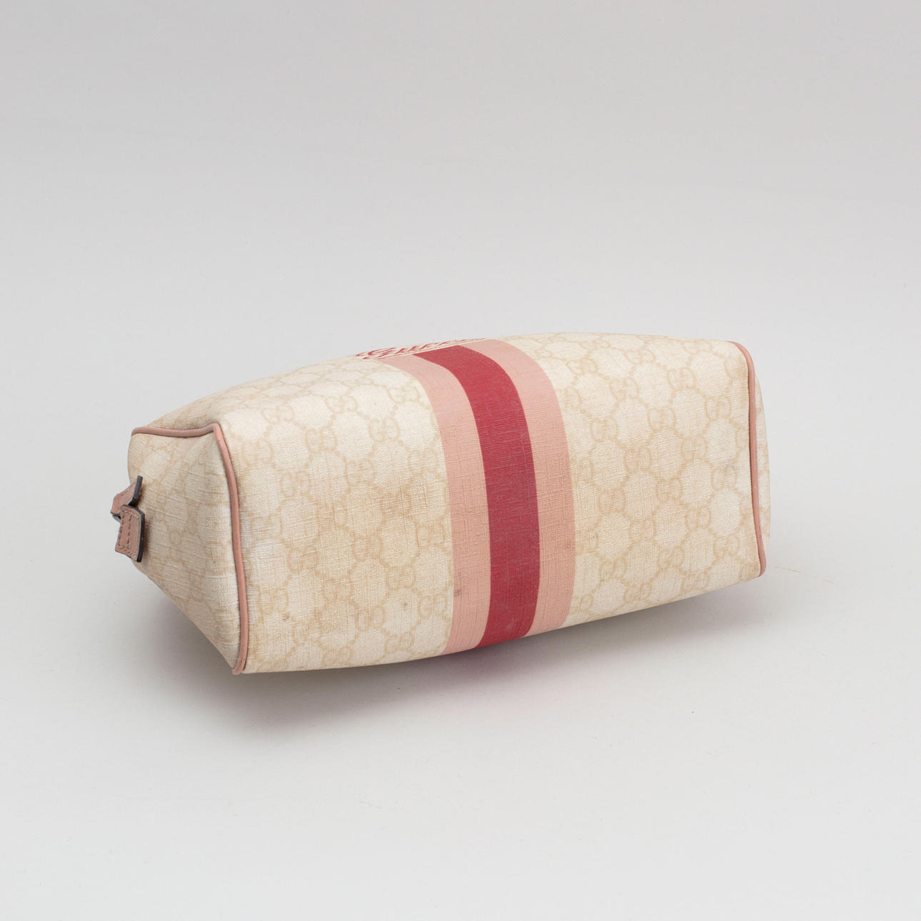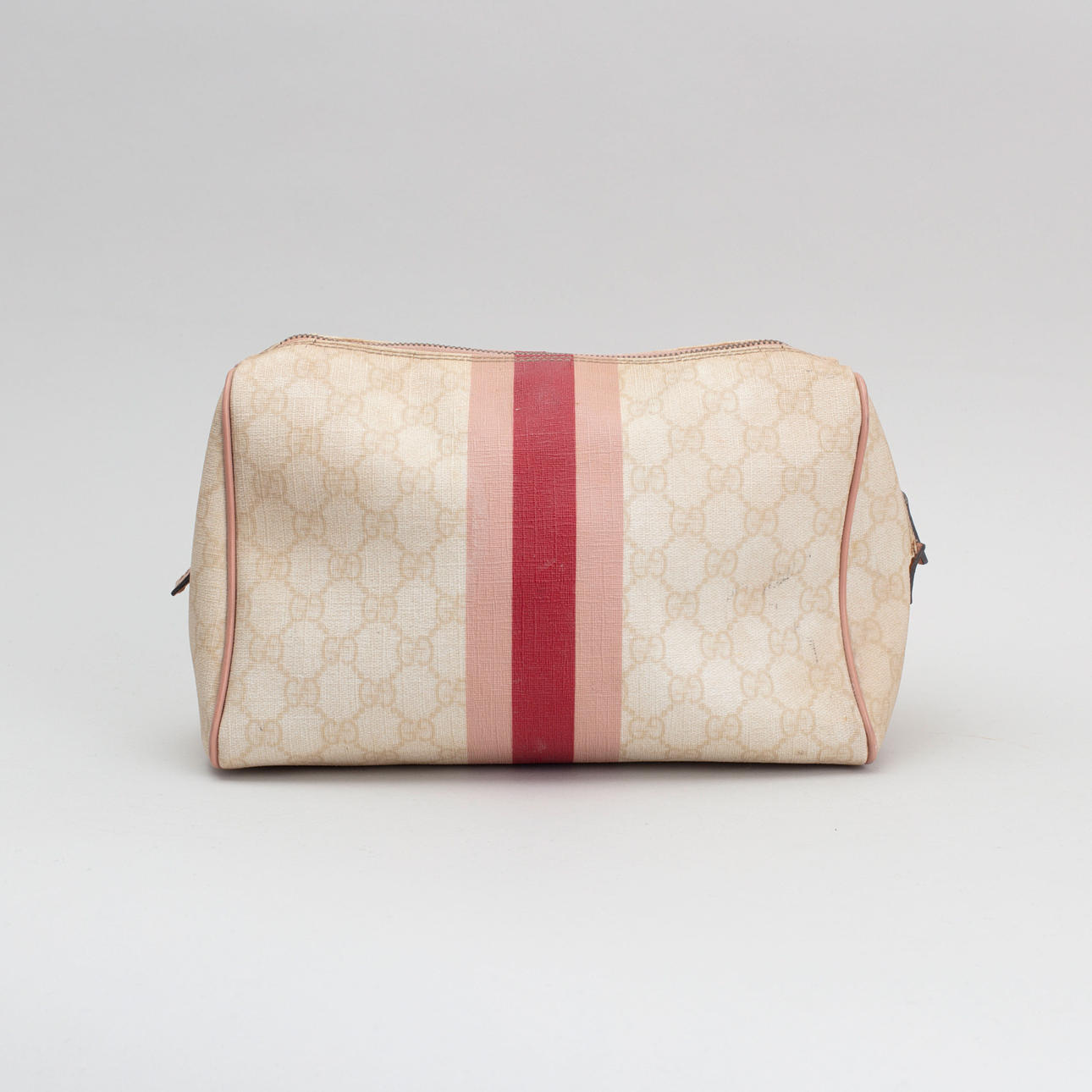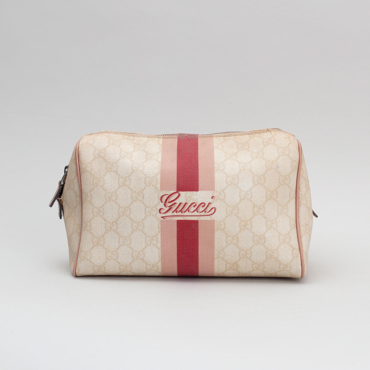 Lyst monogram lærred. Trykt dekor af striber i pink og logo. Mærket Gucci Made in Italy og serienummer. 26 x 18 x 11 cm.