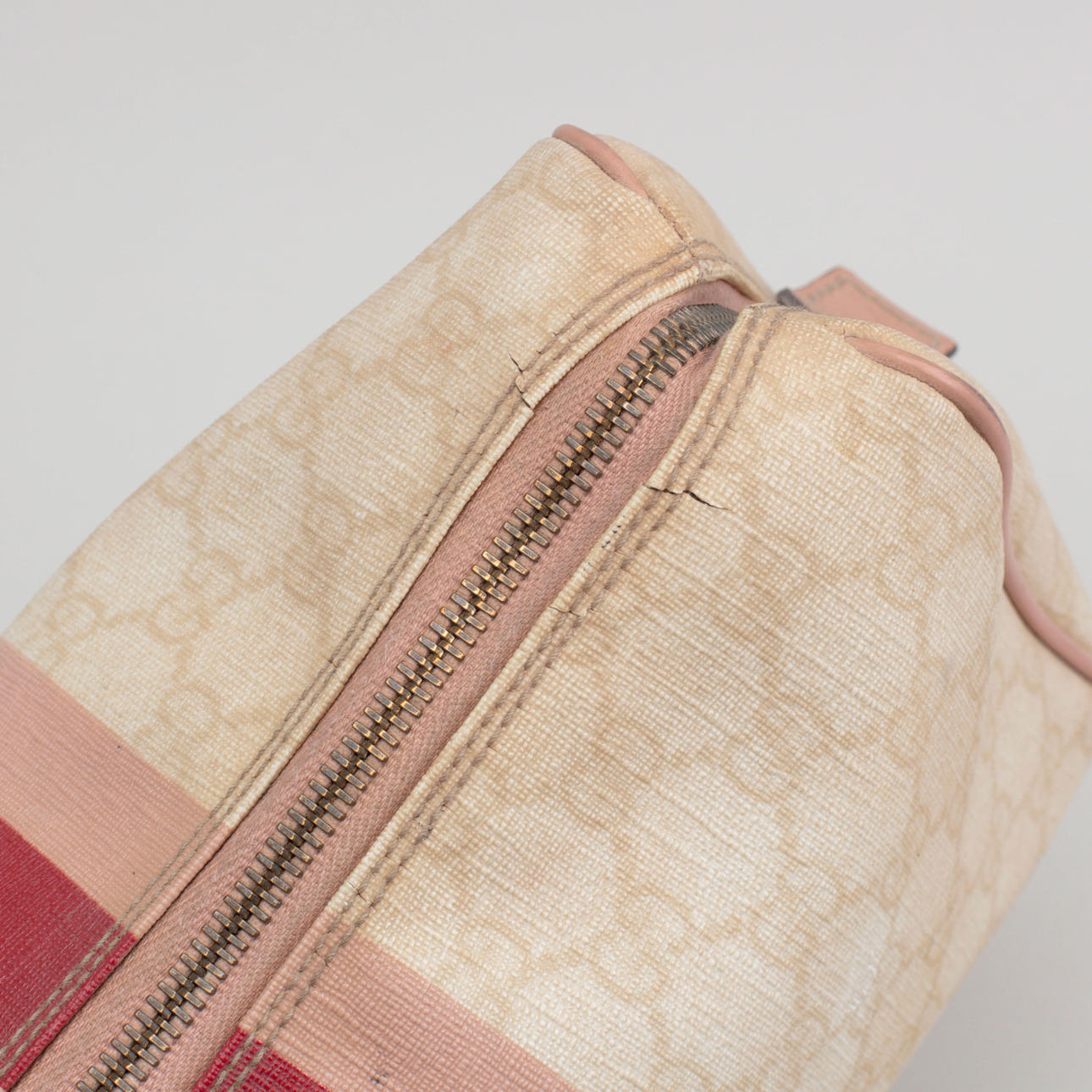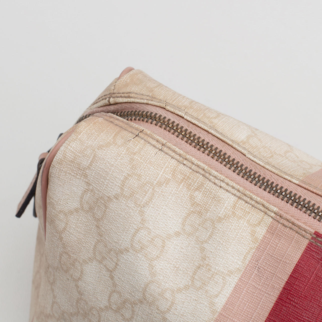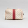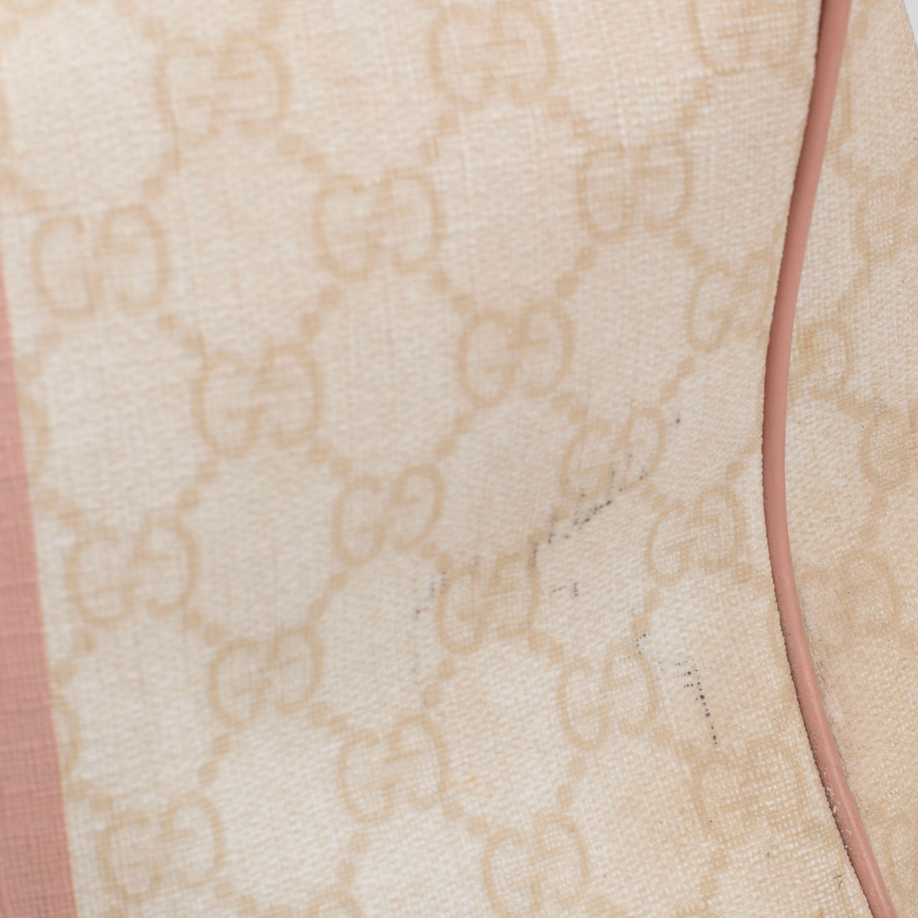 Lyst monogram lærred. Trykt dekor af striber i pink og logo. Mærket Gucci Made in Italy og serienummer. 26 x 18 x 11 cm.