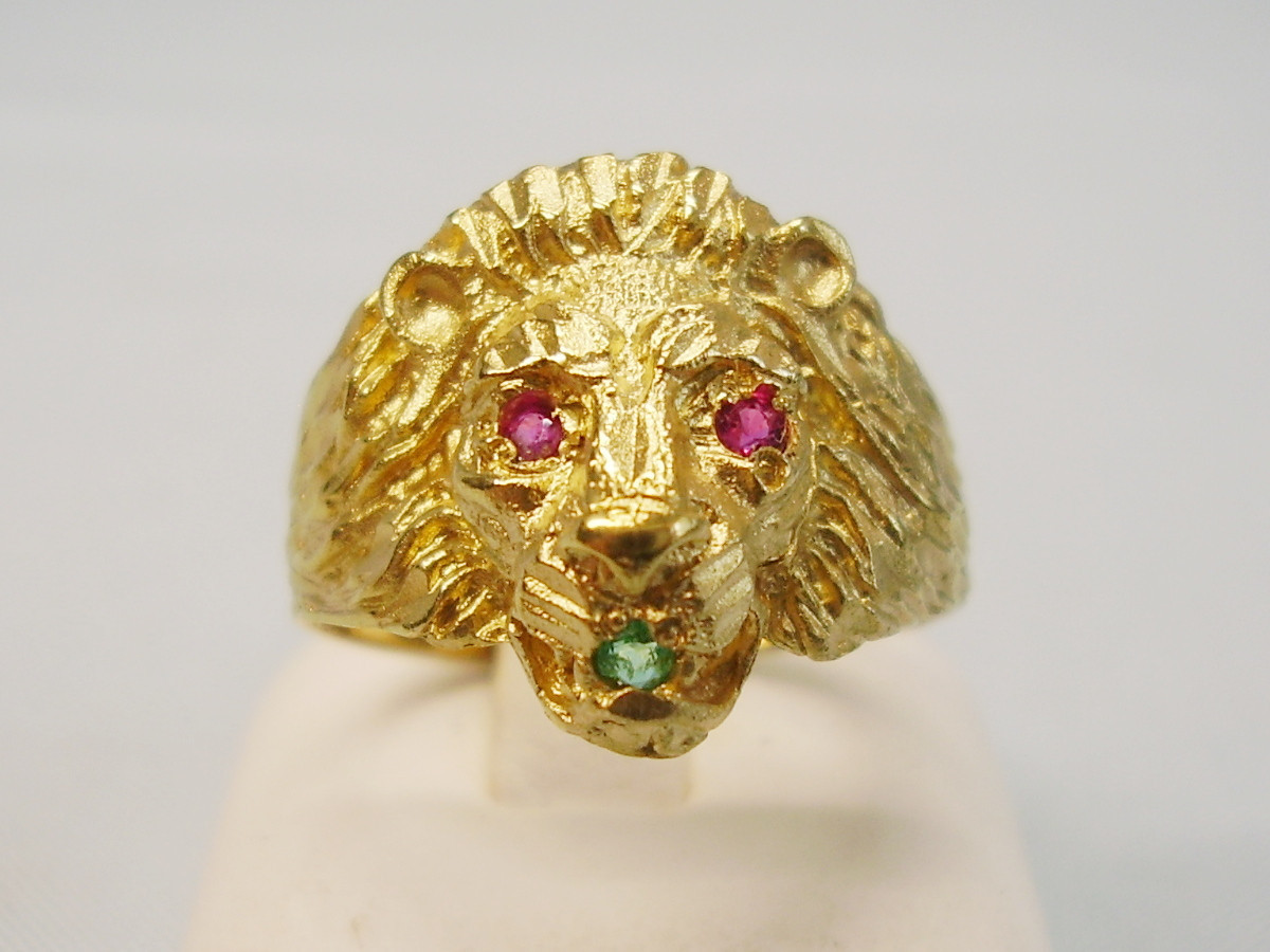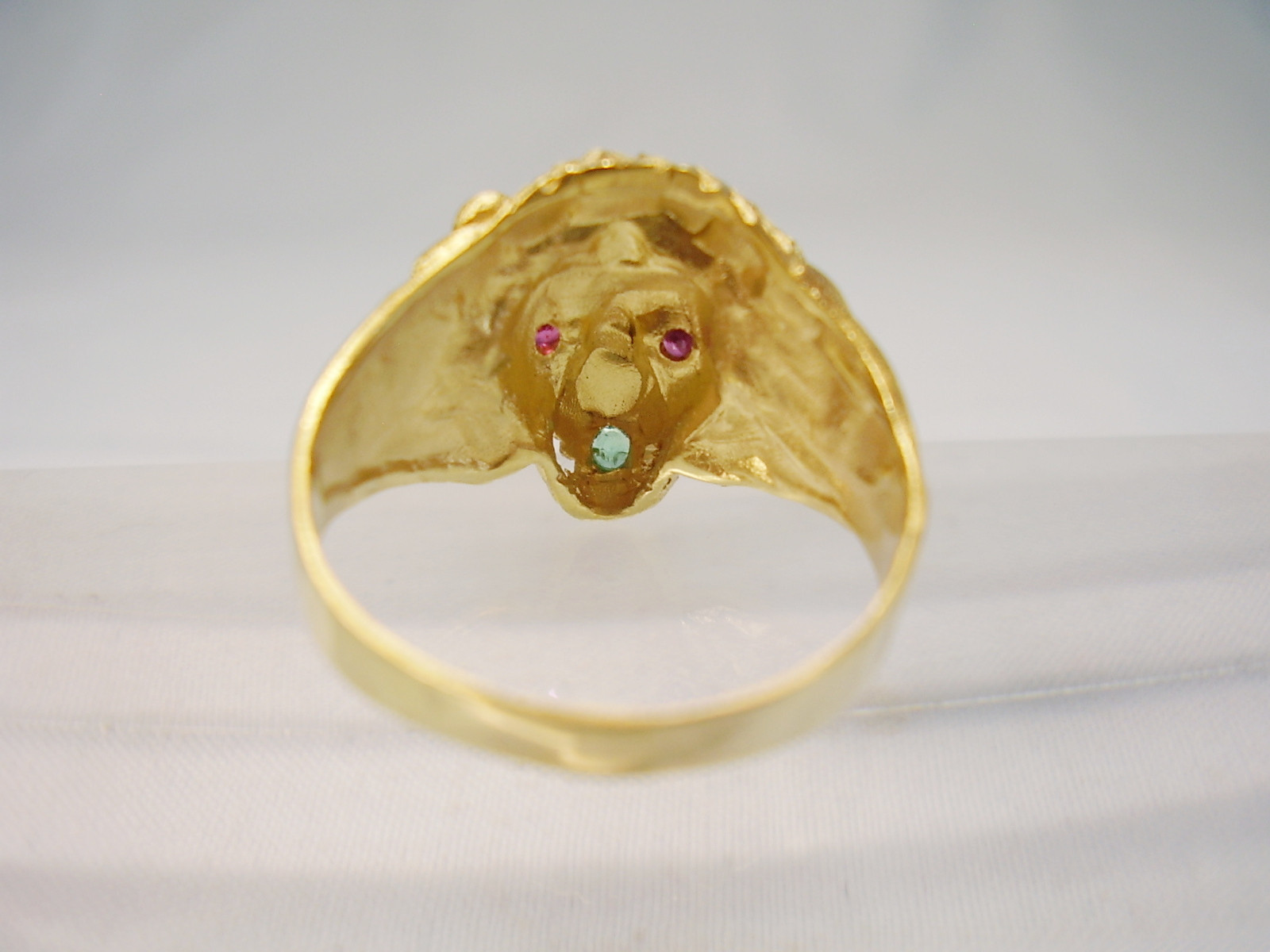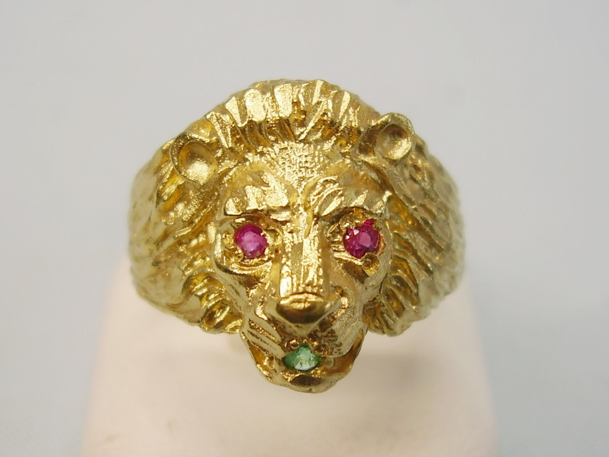 1928902. MÆNDERS RING LØVENS HOVED RING EMERALD + RUBIER.