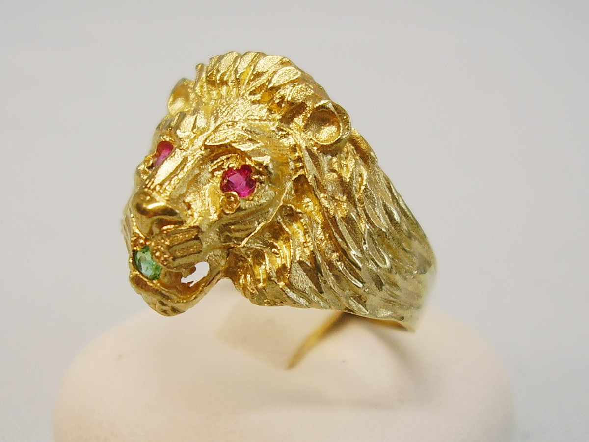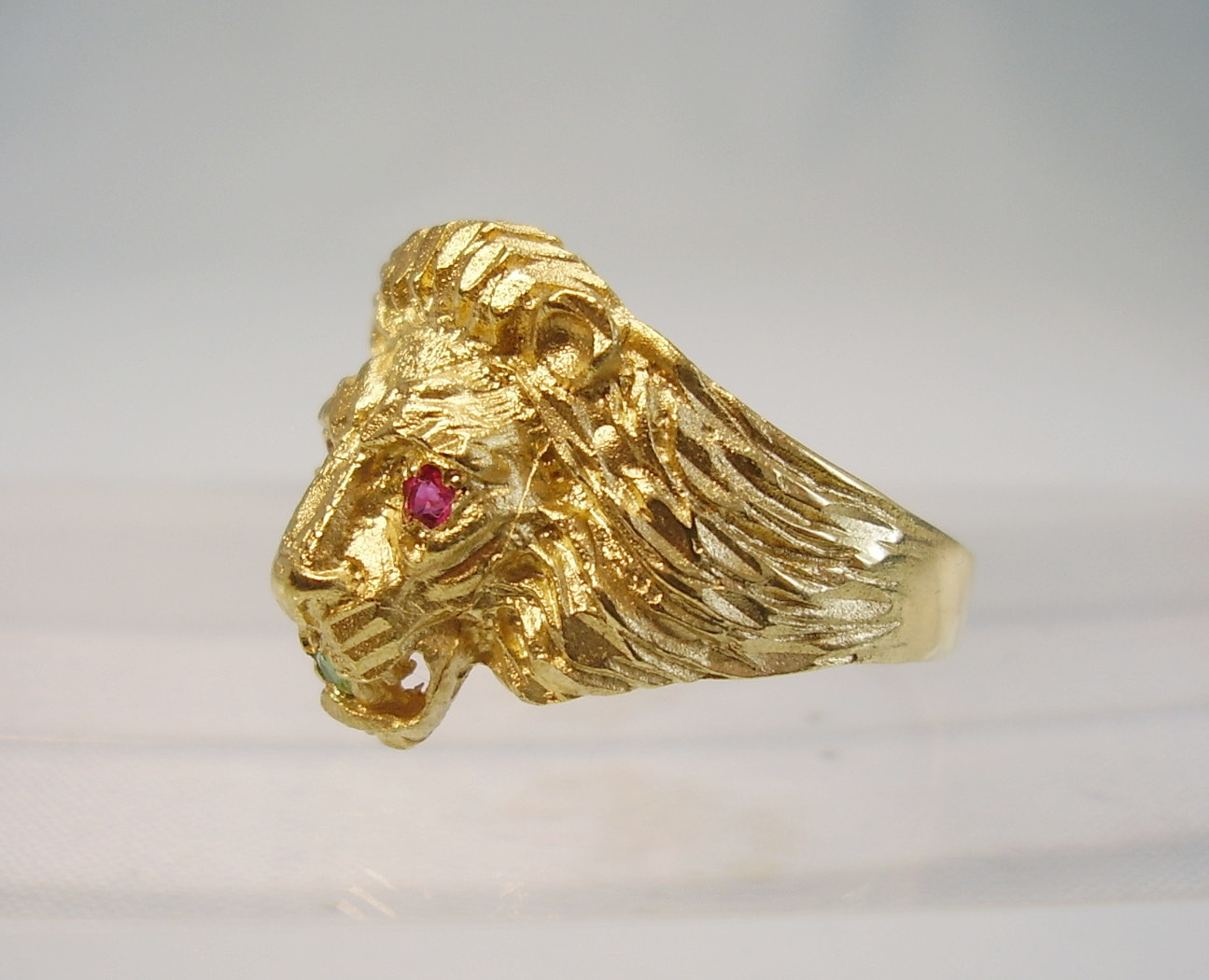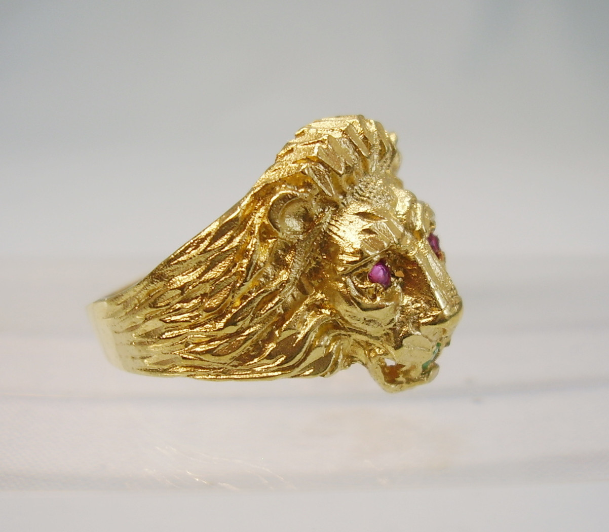 1928902. MÆNDERS RING LØVENS HOVED RING EMERALD + RUBIER.