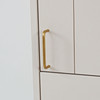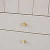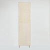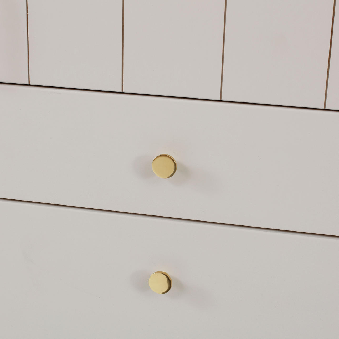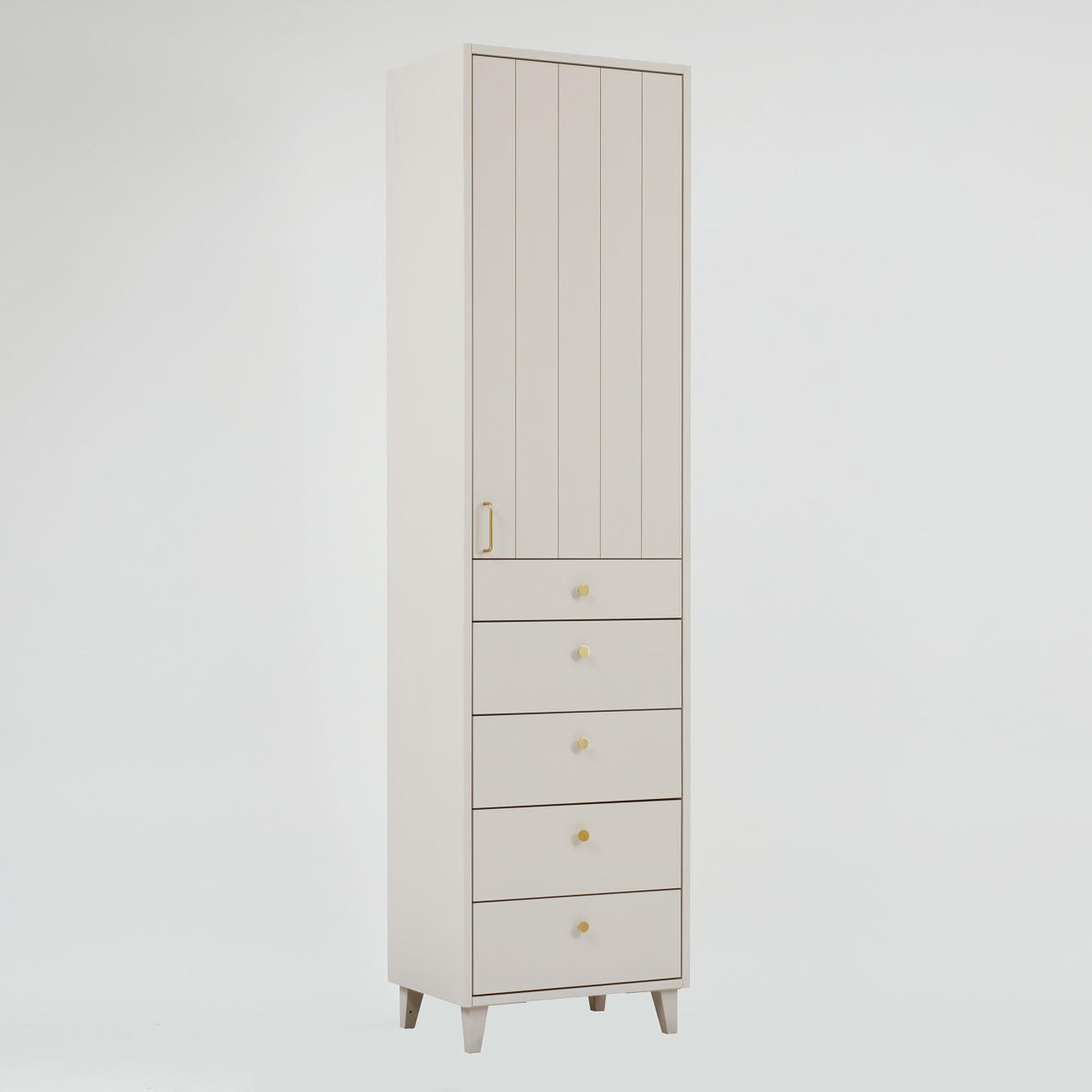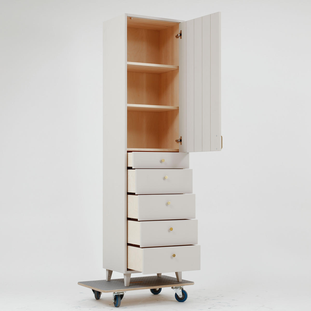 Malet med tempera i lys grå. Låge med hyldeinteriør bagved og fem udtræksskuffer. Beslag i messing. Bredde 54 cm, dybde 38 cm, højde 206 cm.
