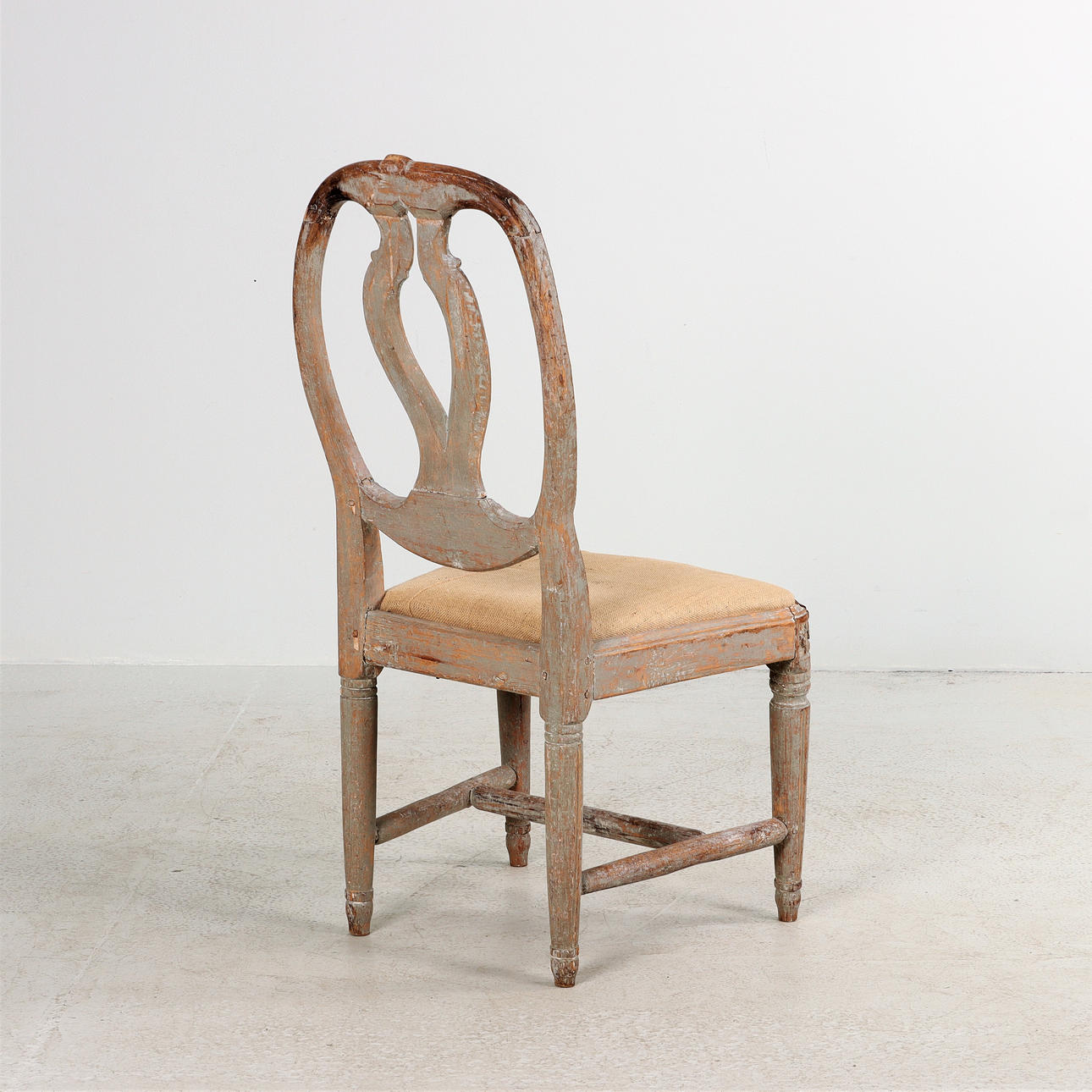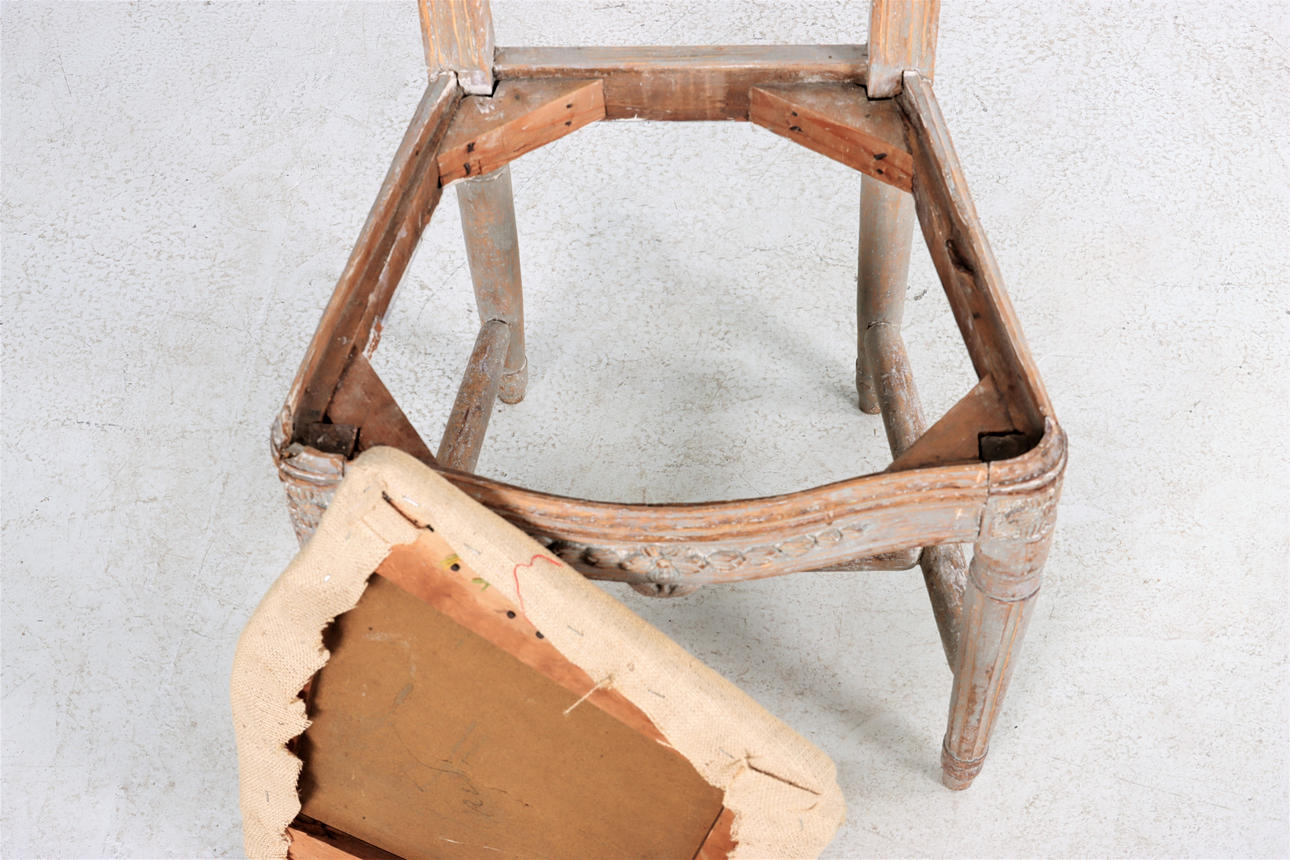 Gustaviansk stol, (Sverige, 1775-1810). Skåret dekoration, riflede ben, buet front. Ridset front "original farve", grå Højde 93,5 cm Sædehøjde 43 cm Front bredde 48 cm.