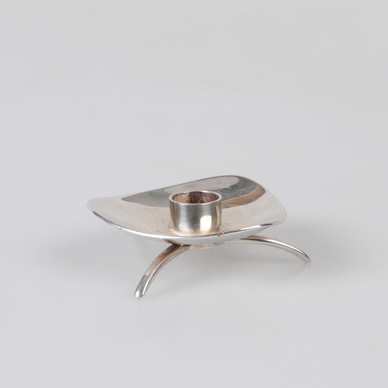 Sølv lysestager, et par med klokkefod, højde 9,5 cm, vægt uden fyld ca 85 gram pr lysestage Stemplet EM, M, 830S, kattefod, S, B9, IMP Trekantede lysestager, 4 stk. i nysølv, stemplet "Cohr ATLA, Danmark" mål ca 5x5 cm.