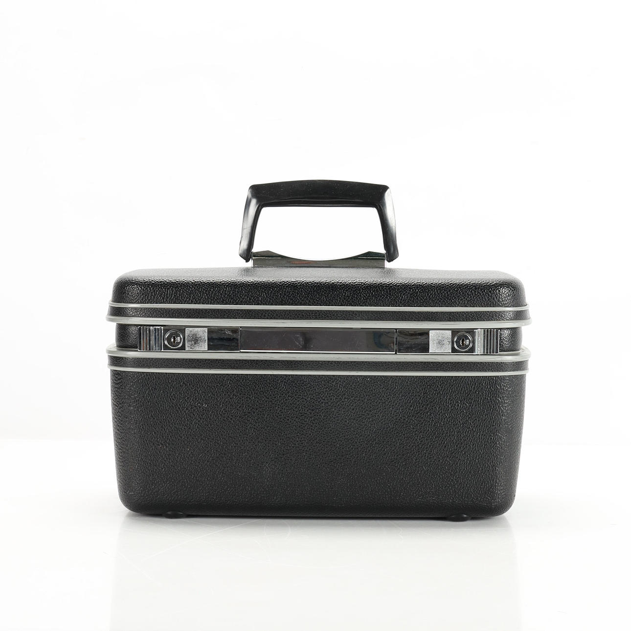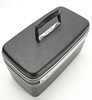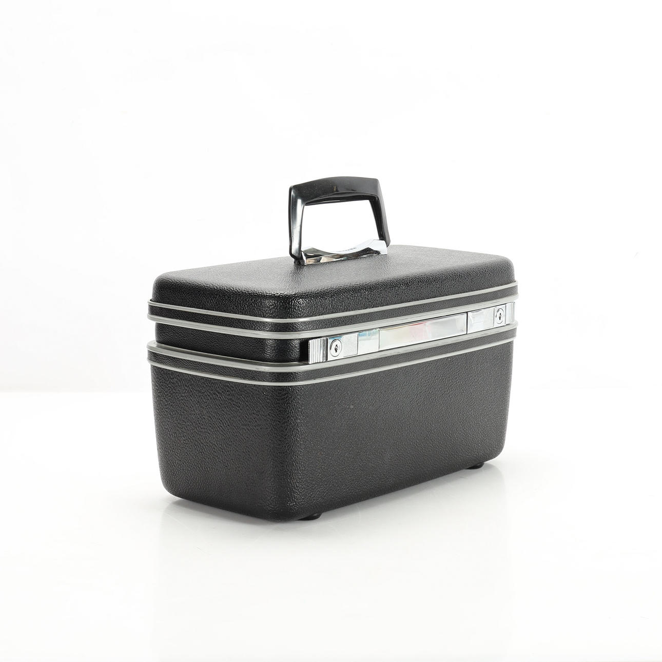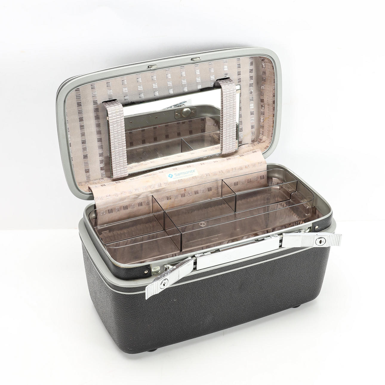 Låsbar skønhedsboks i aluminium og hård plast, fremstillet af Samsonite, 1970'erne/80'erne. Interiør med spejl i låg, aftageligt plexiglas rum, stofbeklædt inderside med lommer og elastik. Højde ca 22 cm, 38x20 cm.
