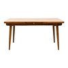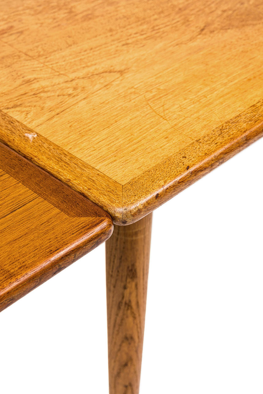 Fineret med teaktræ, ben af eg. Mærkemærket. To udtræksklapper såkaldt hollandsk udtræk på 50 cm. Længde 140 cm, bredde 90, højde 72 cm.