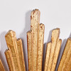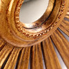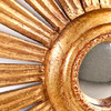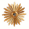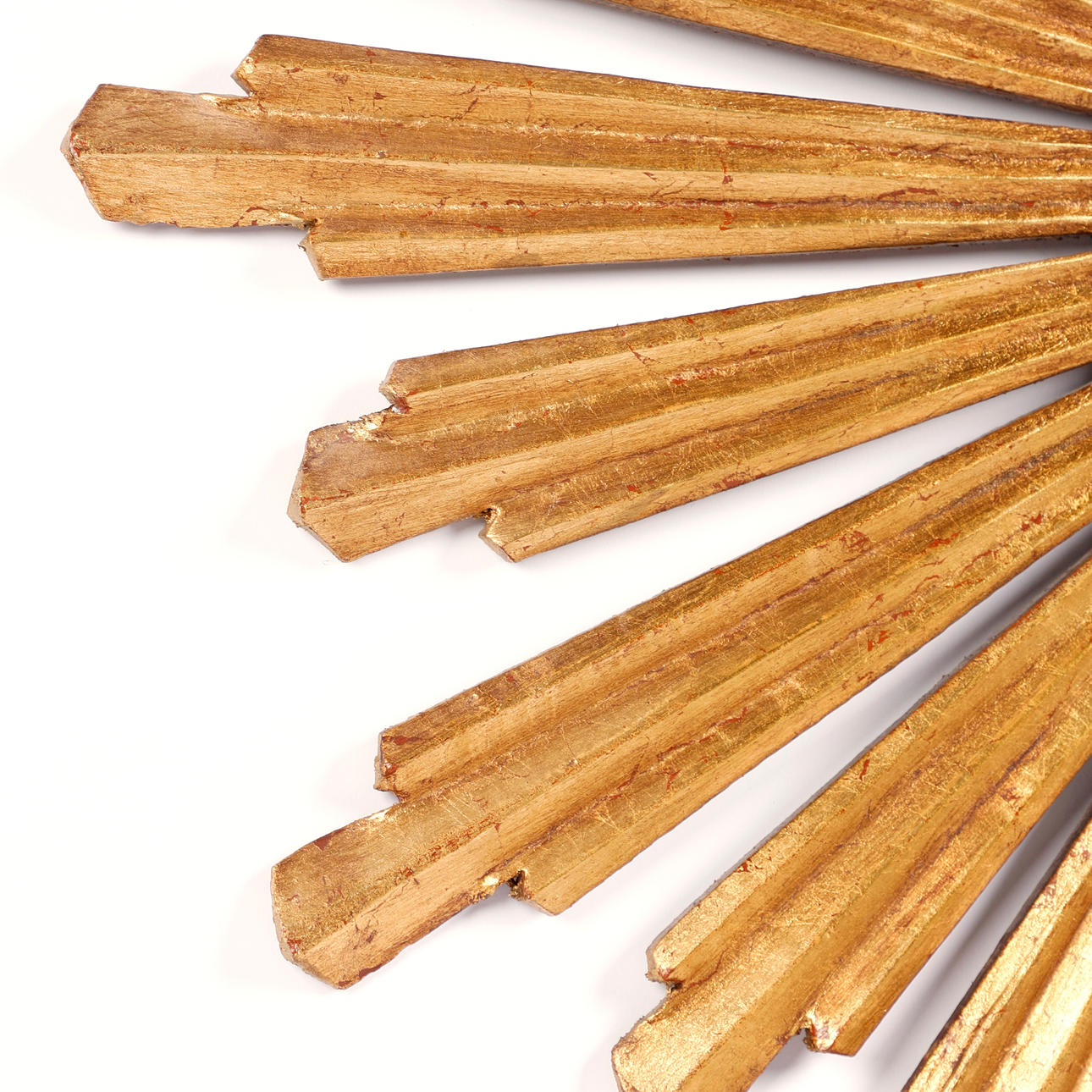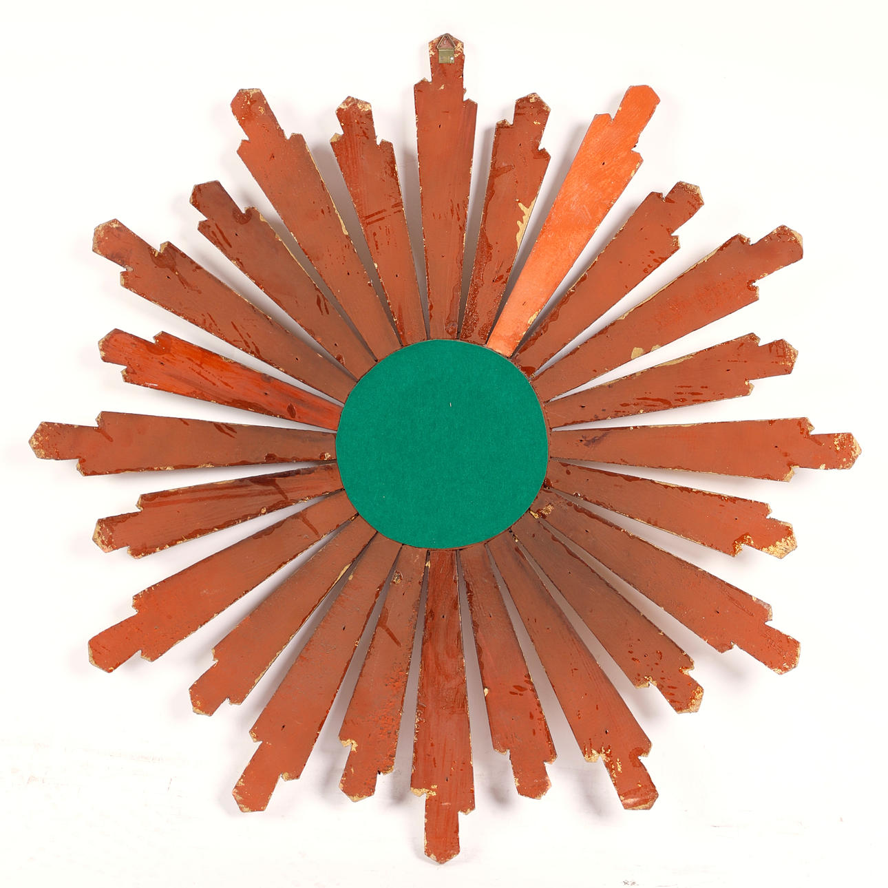 Spejl/vægspejl, træ, 1950-60'erne. Vægspejl med rund spejlflade og radial, guldfarvet træramme, med ophængningsanordning på bagsiden og beklædt med grøn filt i midten, D.70cm, T.4.5cm.